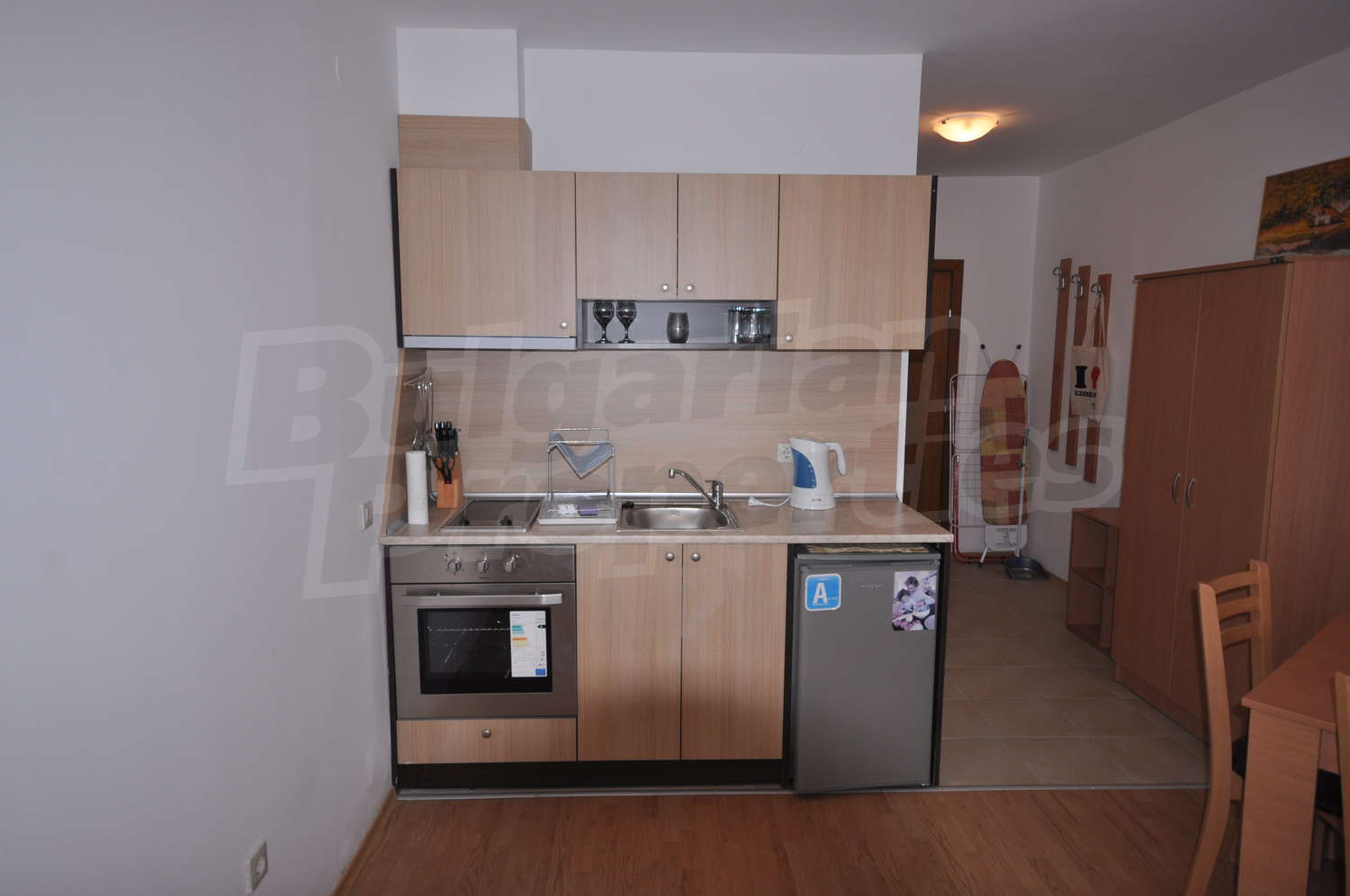 • Оборудвана отворена кухня с вградена техника – фурна и керамични котлони, абсорбатор, хладилник;