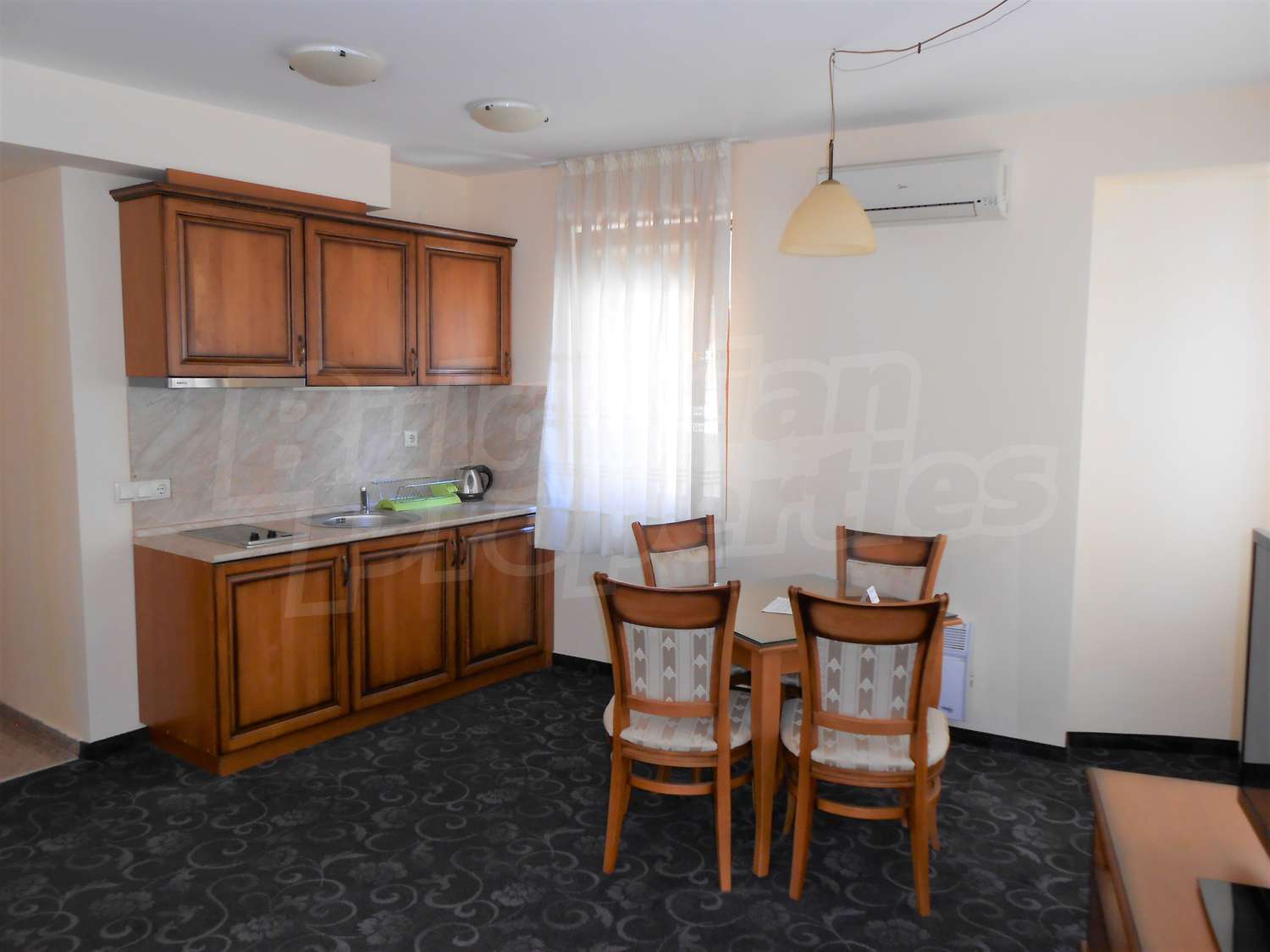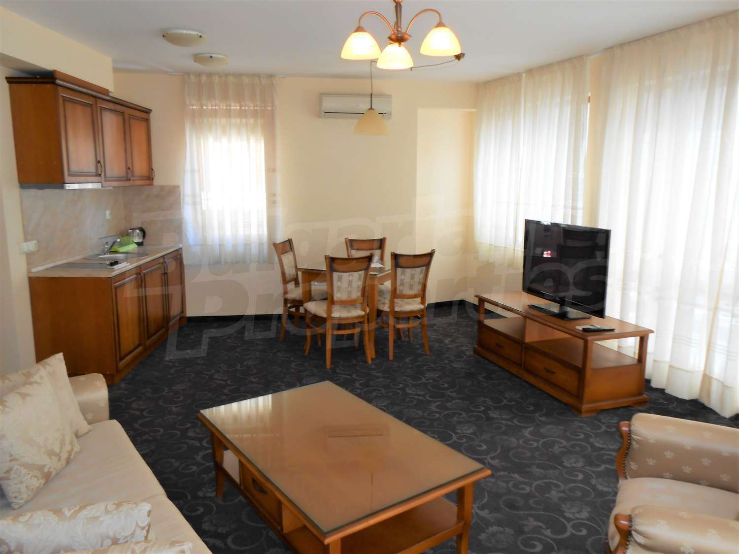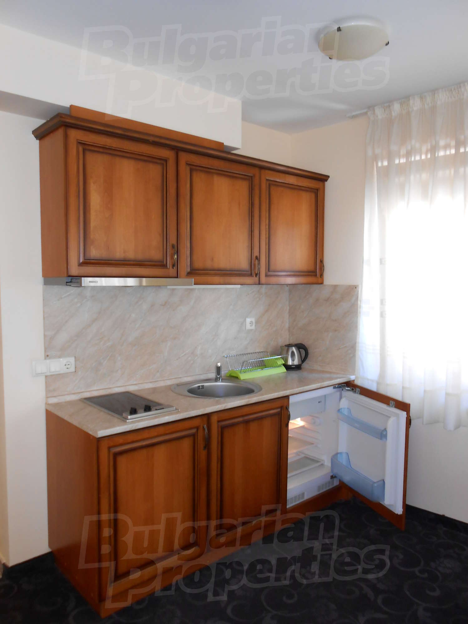 - Кухня с всички уреди: мивка, аспиратор, вградени котлони, вграден хладилник;
