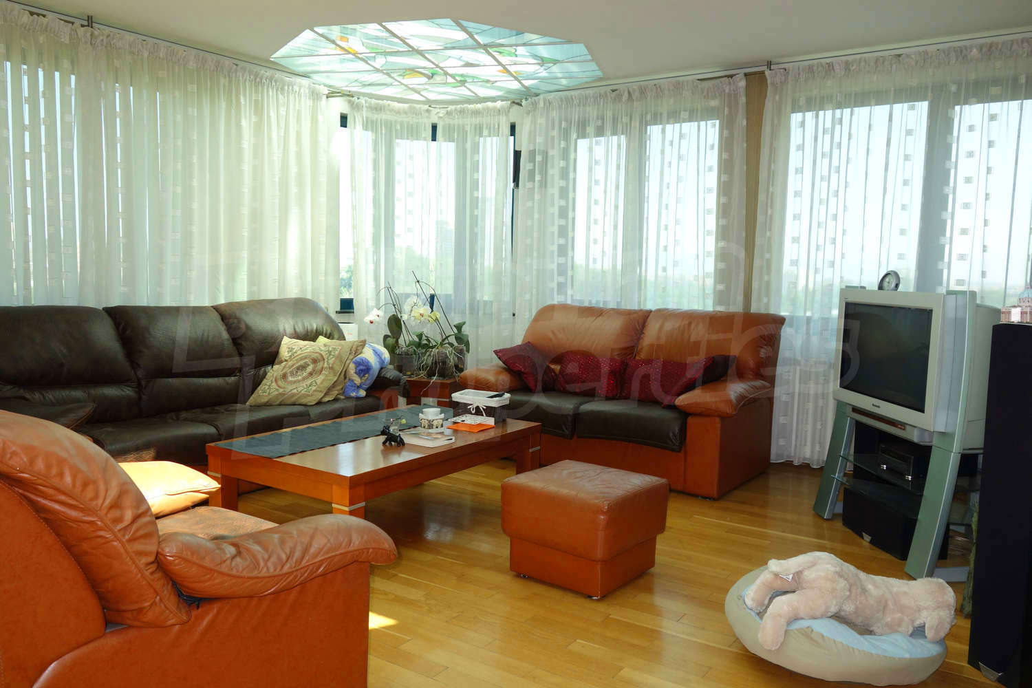 Жилището е разположено в качествена и добре поддържана тухлена сграда от 1999 г., с асансьор и портиер, което гарантира комфорт и сигурност. Апартаментът заема 8-ми и 9-ти етаж и предлага обща площ от 216 кв.м (чиста площ – 200 кв.м), с изложение югоизток-северозапад, осигуряващо изобилие от естествена светлина през целия ден.