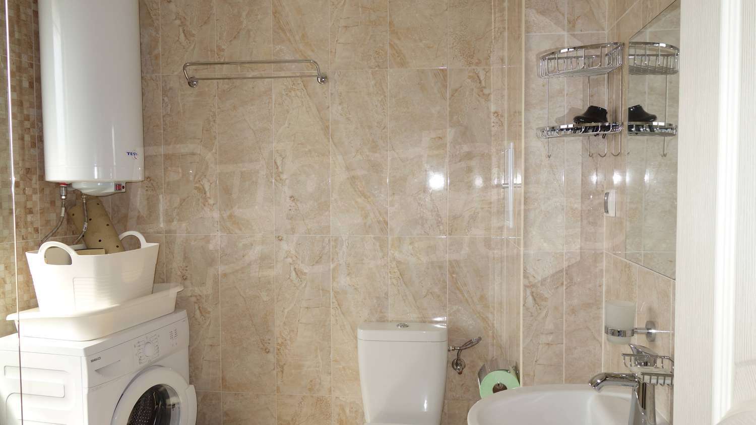 Разпределението включва уютна дневна с оборудван кухненски кът, спалня с удобно двойно легло, оборудвана баня с душ-кабина и пералня, и приятен балкон. Апартаментът е луксозно завършен и обзаведен.