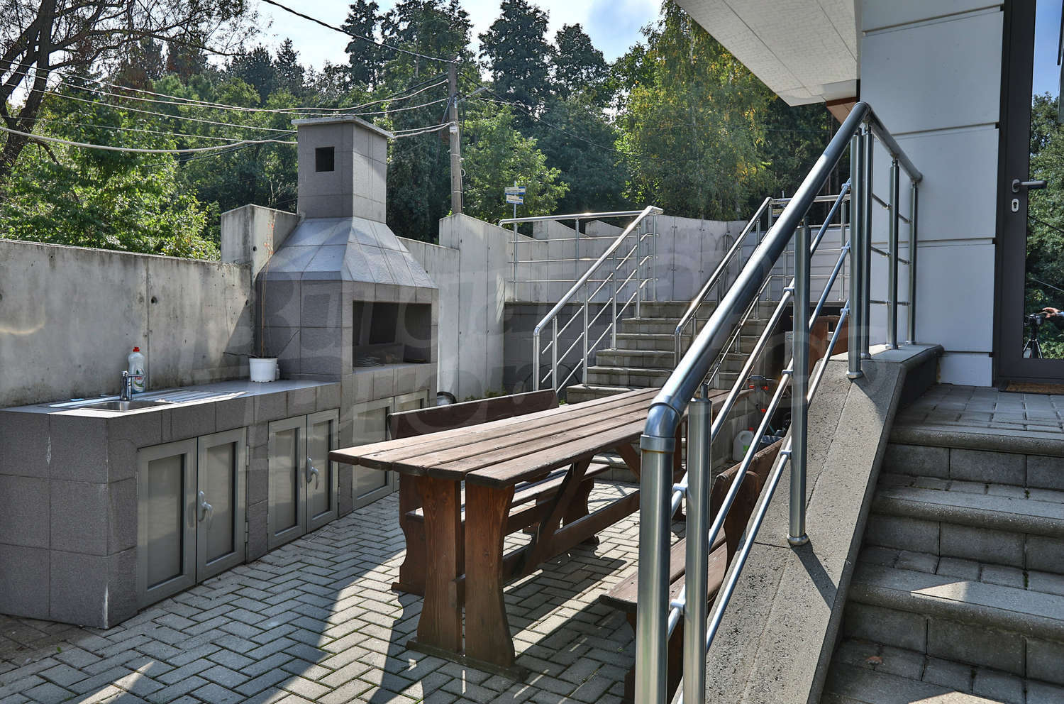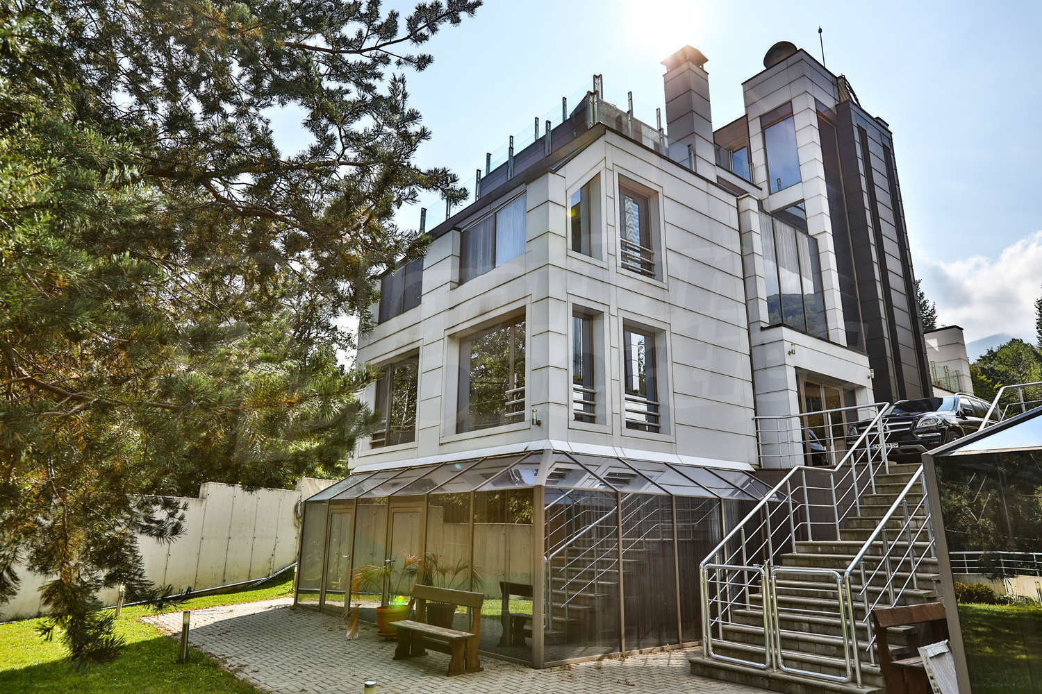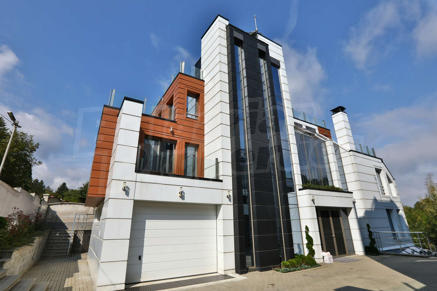 Прекрасна къща на четири етажа (обща площ от 850 кв.м. + покривна тераса, което прави общо около 1000 кв.м.), с висок клас панорамен асансьор, 4 места за паркиране (1 гараж и три паркоместа) и дворно място с барбекю и места за отдих във вилна зона Киноцентър. Има още една идентична къща, която също се предлага за продажба, като двете къщи са разположени в общ парцел от 1177 кв.м.