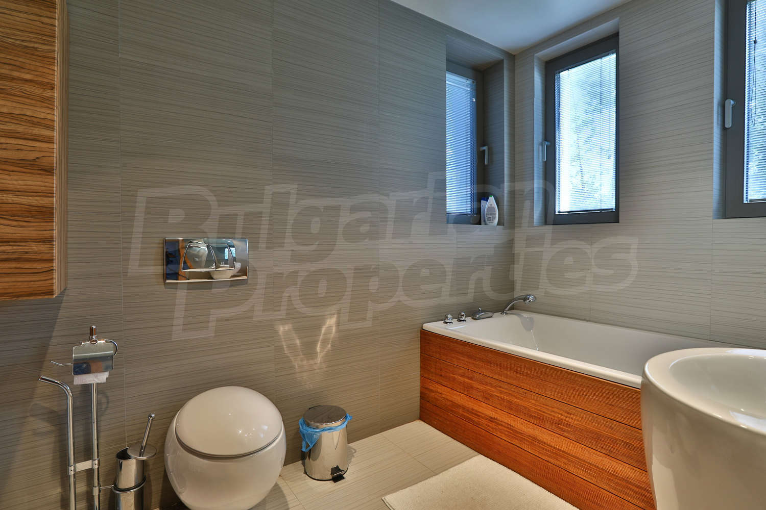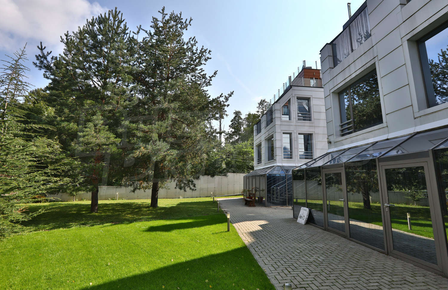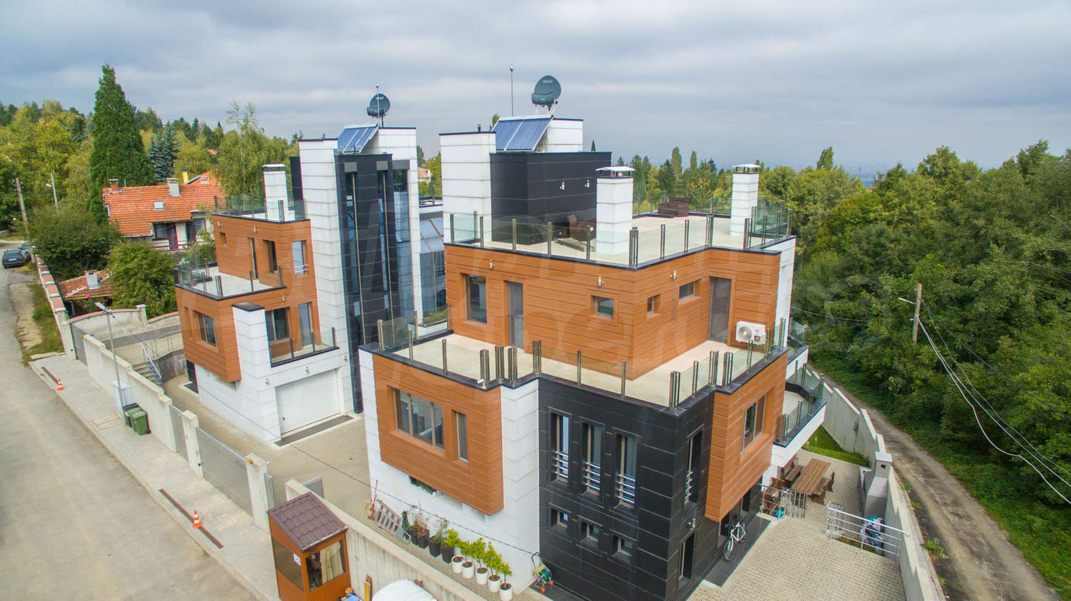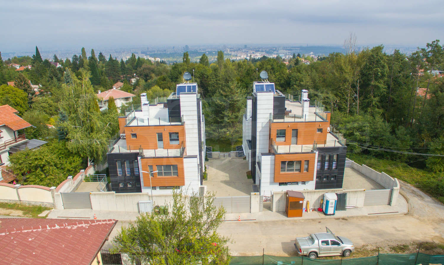 Имотът е завършен с тухли Винербергер, френска окачена фасада, 10 см каменна вата изолация, алуминиева дограма Шуко троен стъклопакет, външни реотани, които топят снега през зимата, отоплителна немска система de-dichtricht. Подовите настилки са с технически камък, италиански гранитогрес.