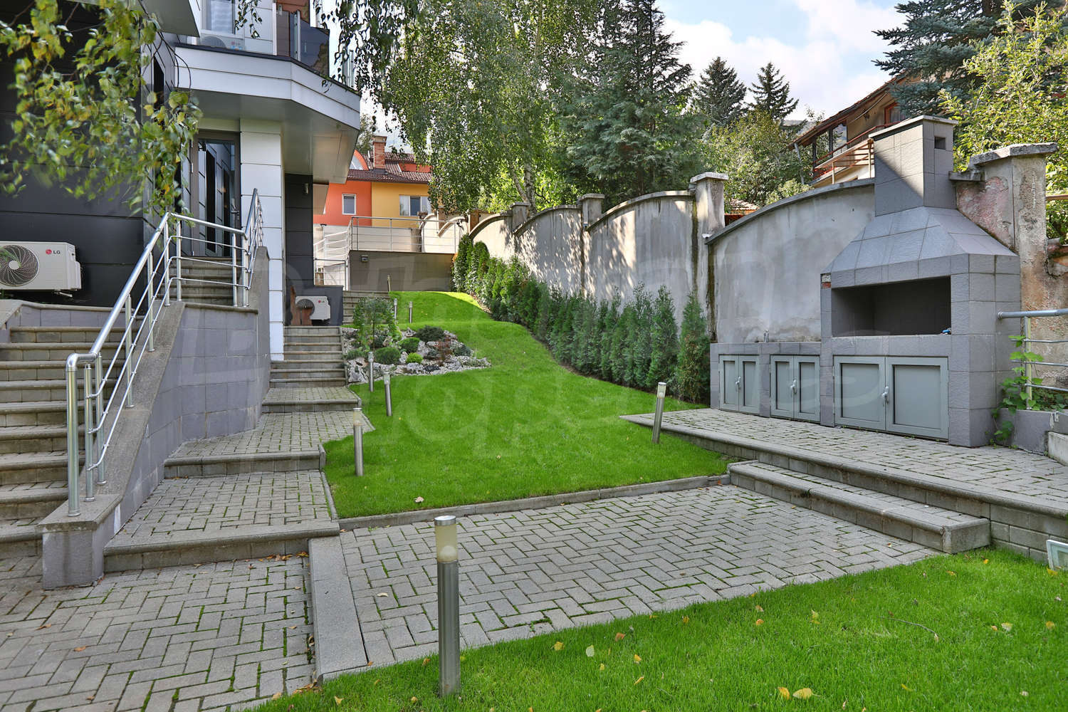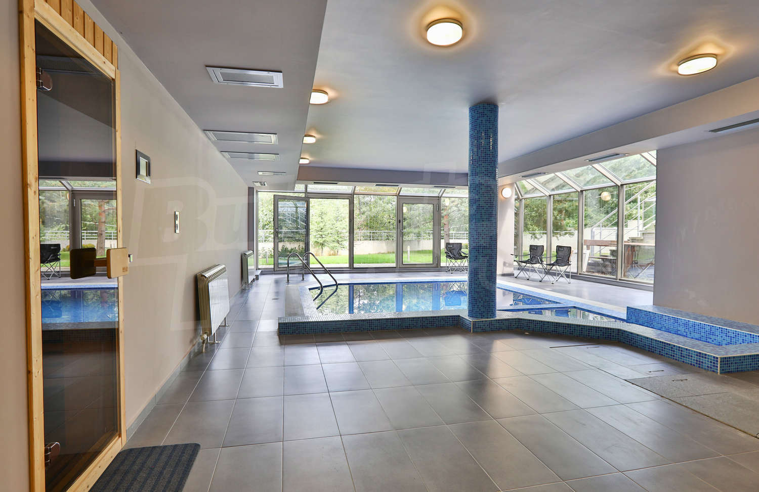 • Ниво 0: вътрешен басейн с джакузи и подгряване, сауна, 2 WC + 2 бани, 3 склада, 1 стая за персонал, немско газово/електрическо котелно, хидлофлор, генератор, който не е автоматичен, проточен бойлер, слънчеви батерии, дистанционен контрол на за настройване температурата на парното, дори когато не си в къщата, дистанционно отключване/заключване, видеонаблюдение и СОТ;
