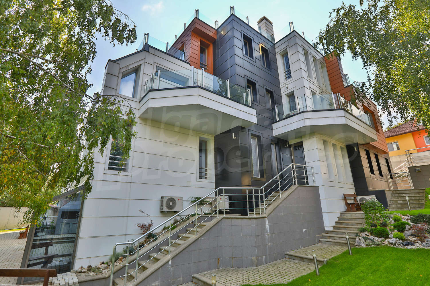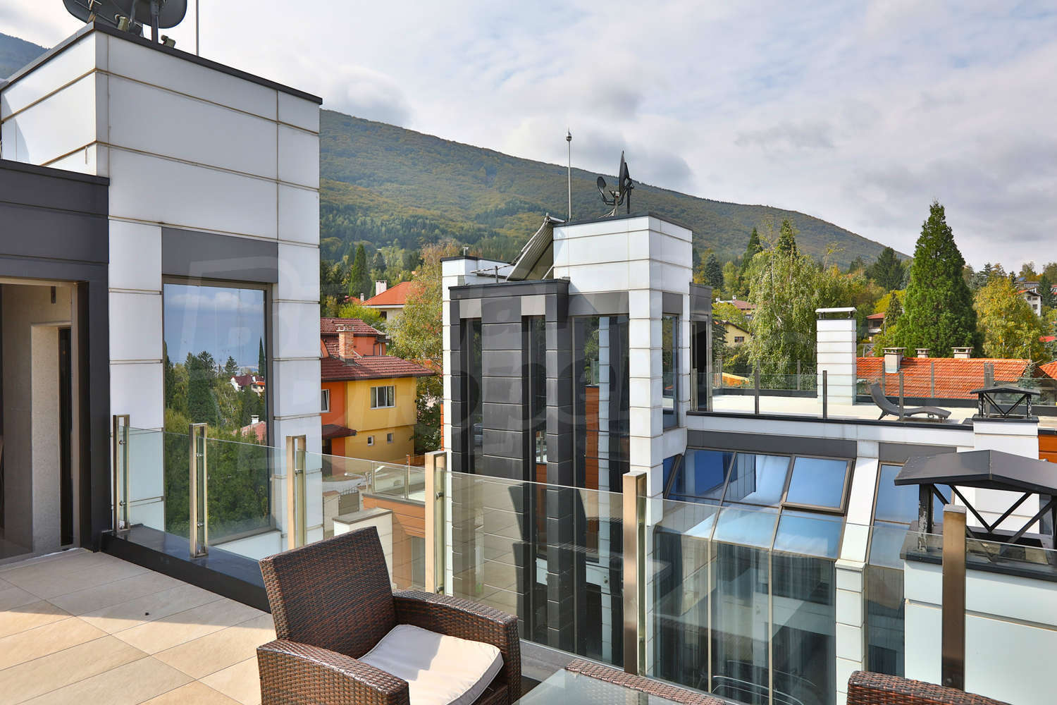 Прекрасна къща на четири етажа (обща площ от 850 кв.м. + покривна тераса, което прави общо около 1000 кв.м.), с висок клас панорамен асансьор, 4 места за паркиране (1 гараж и три паркоместа) и дворно място с барбекю и места за отдих във вилна зона Киноцентър. Има още една идентична къща, която също се предлага за продажба, като двете къщи са разположени в общ парцел от 1177 кв.м.