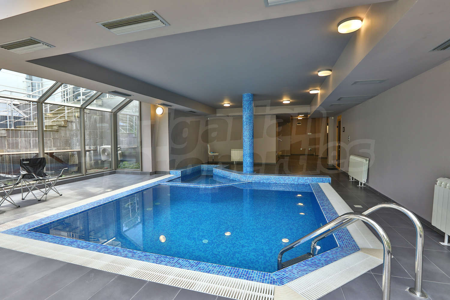 • Ниво 0: вътрешен басейн с джакузи и подгряване, сауна, 2 WC + 2 бани, 3 склада, 1 стая за персонал, немско газово/електрическо котелно, хидлофлор, генератор, който не е автоматичен, проточен бойлер, слънчеви батерии, дистанционен контрол на за настройване температурата на парното, дори когато не си в къщата, дистанционно отключване/заключване, видеонаблюдение и СОТ;