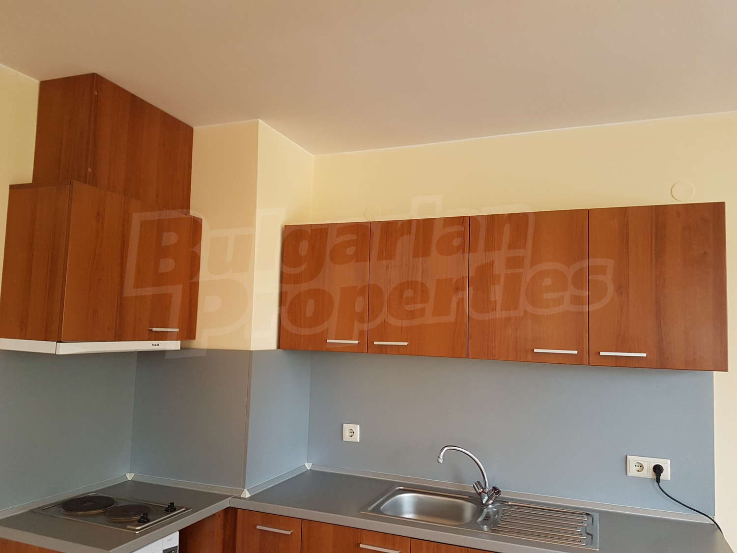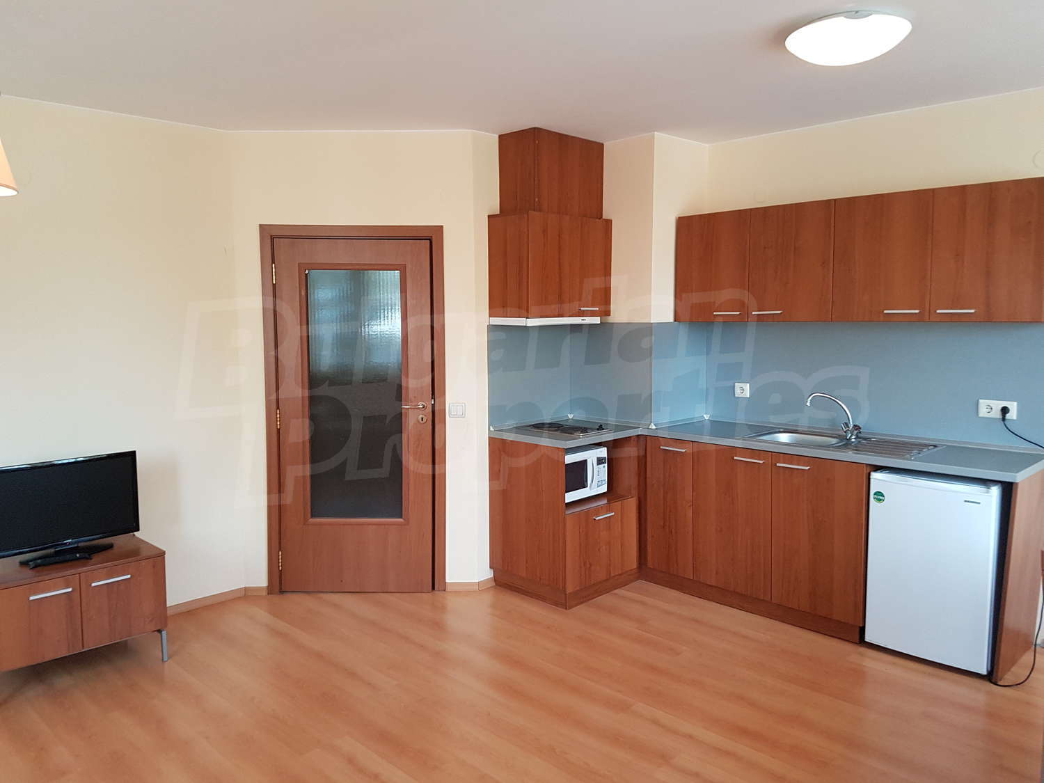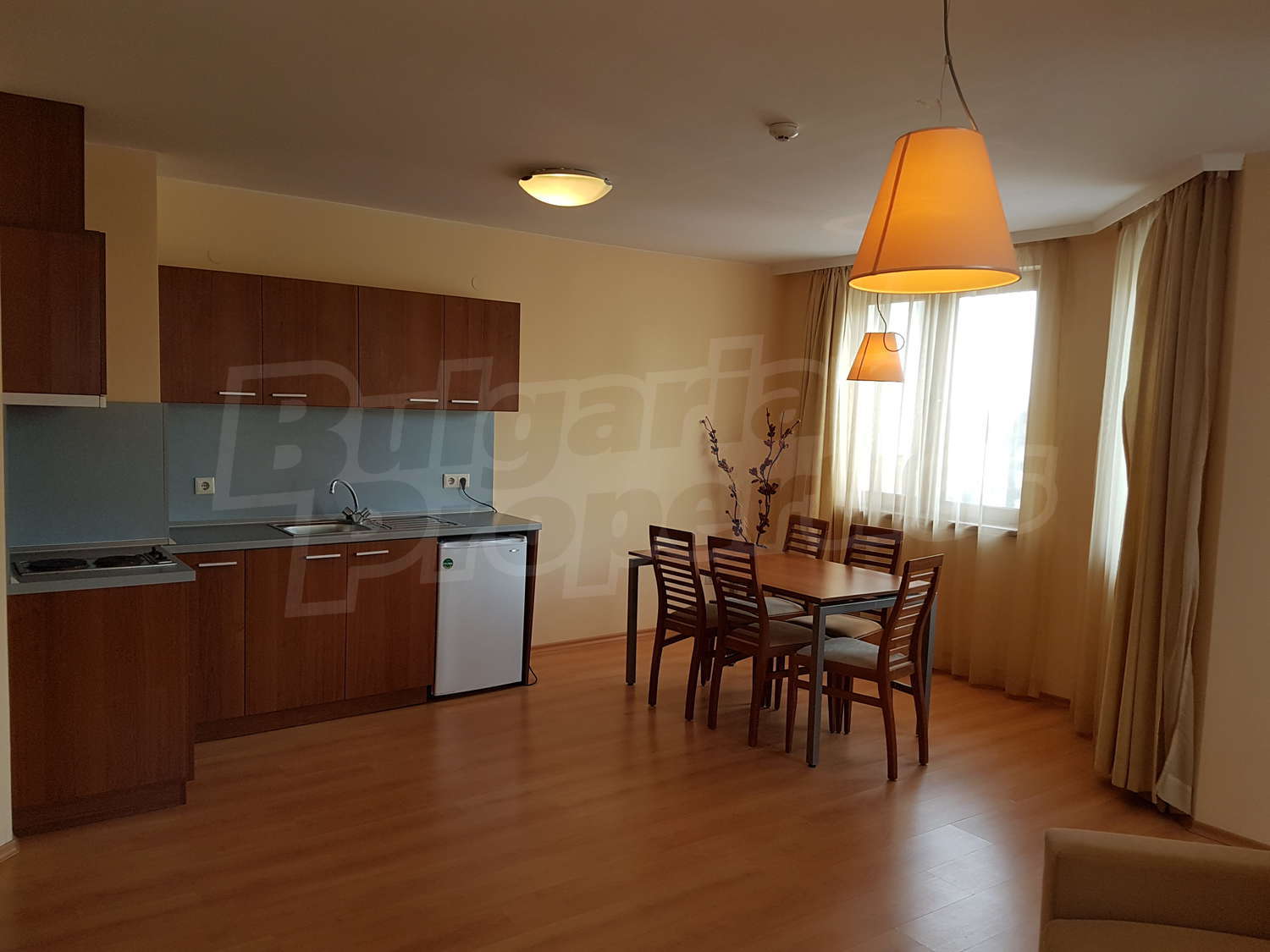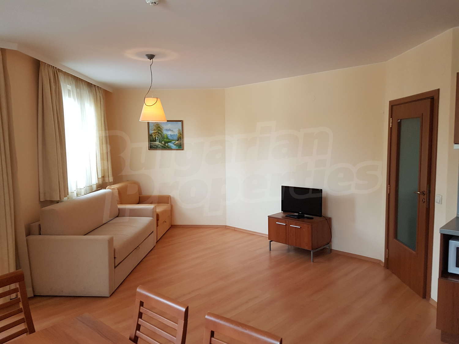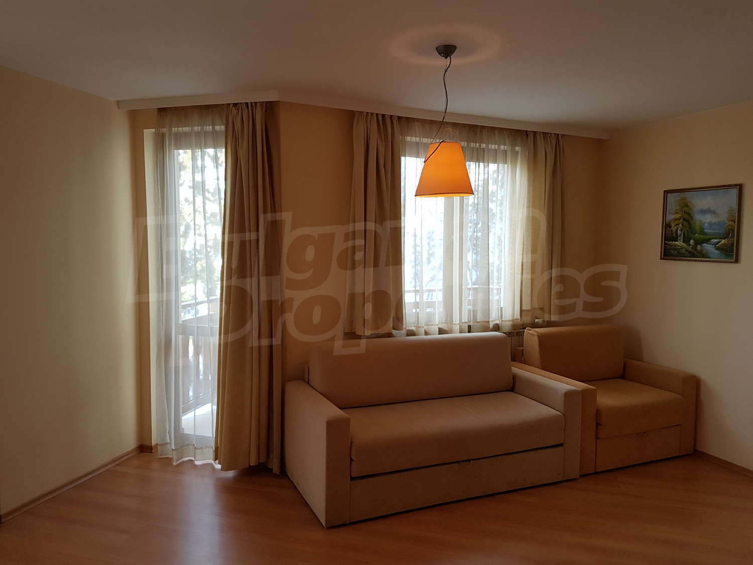 Жилището е завършено: под – ламинат в дневната и мокет в спалнята, стени - латекс, дограма – ПВЦ.