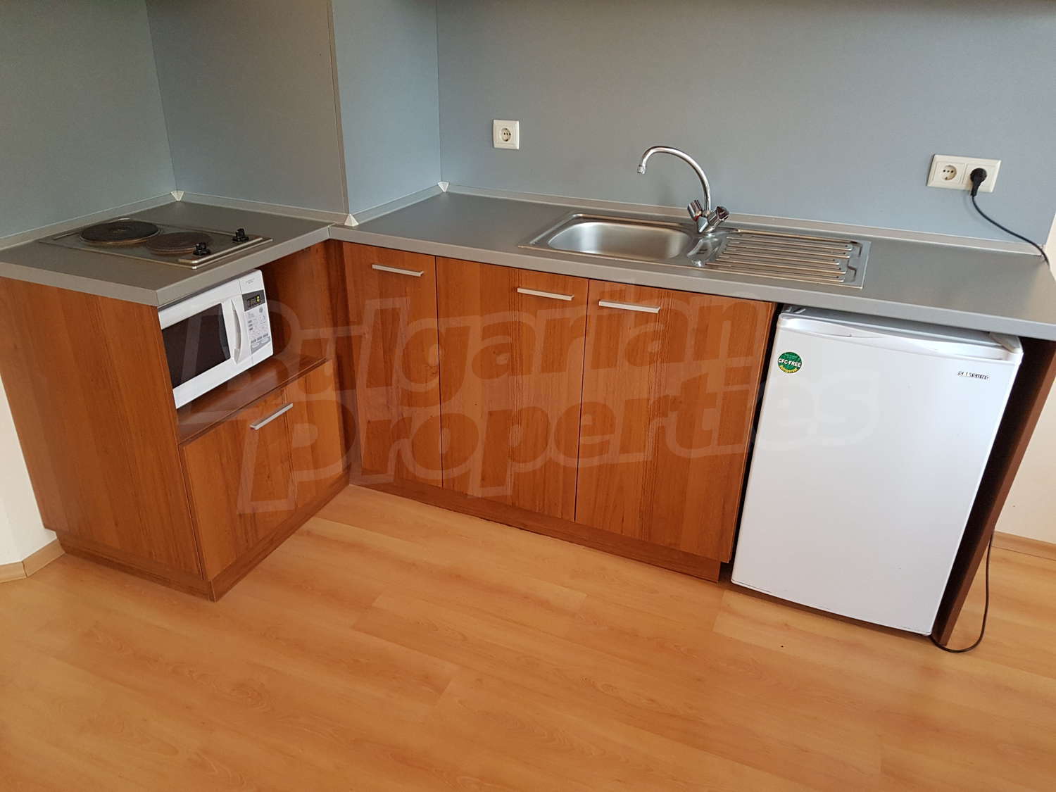 • Кухня: плот, мивка, шкафове, котлони, абсорбатор, хладилник, микровълнова, маса със 4 стола