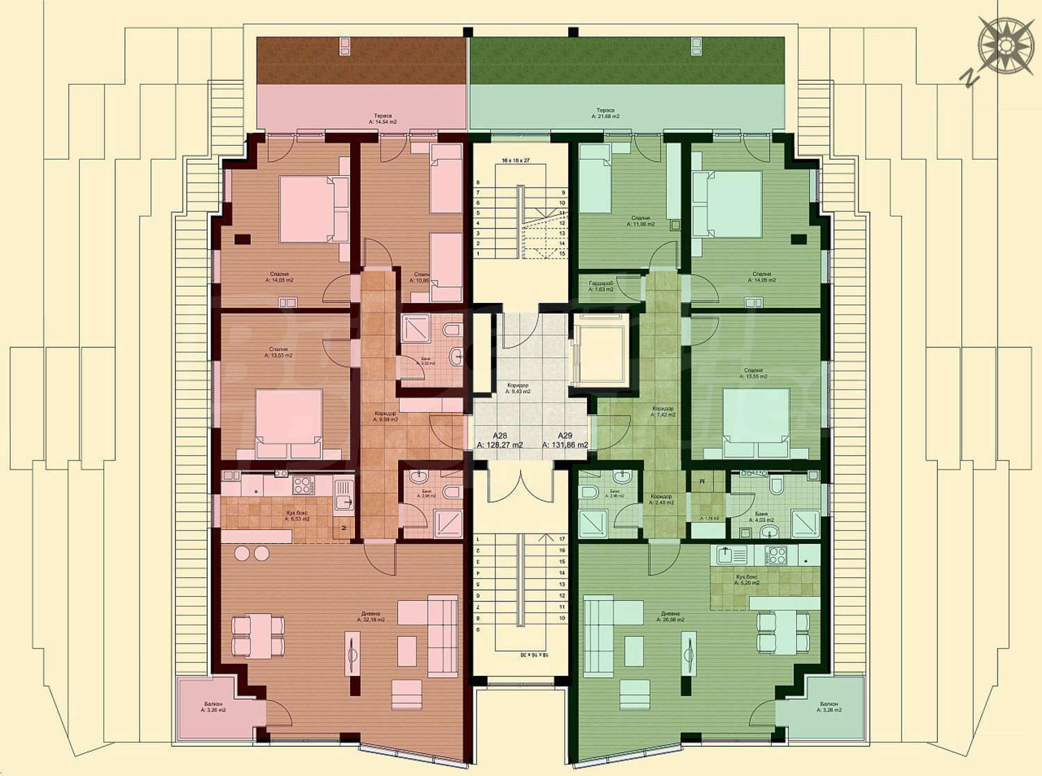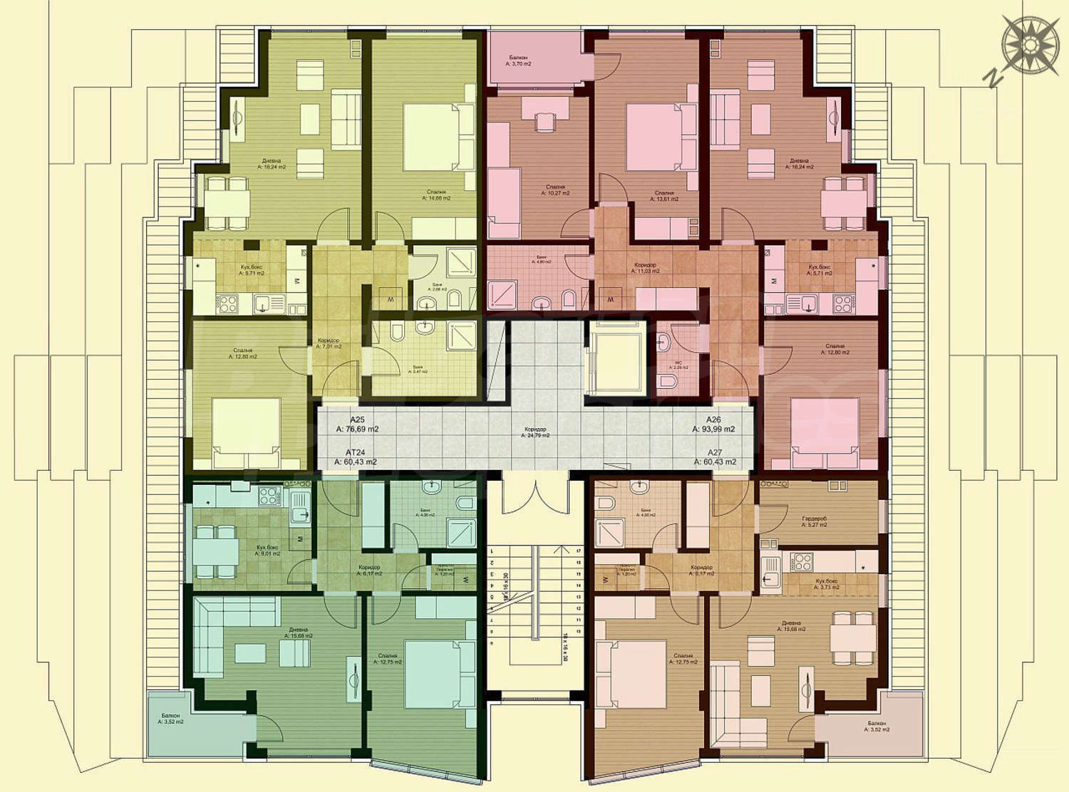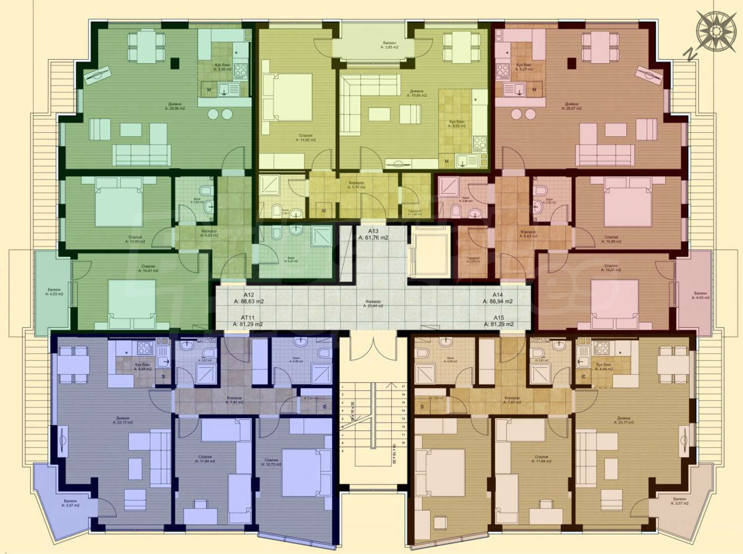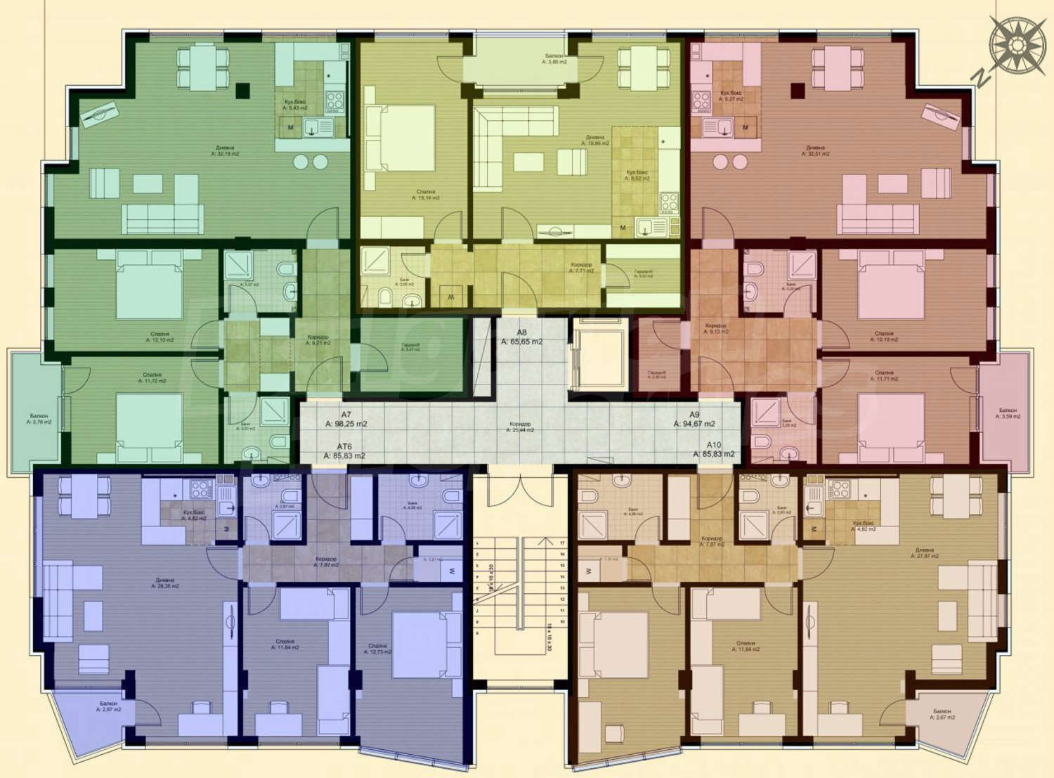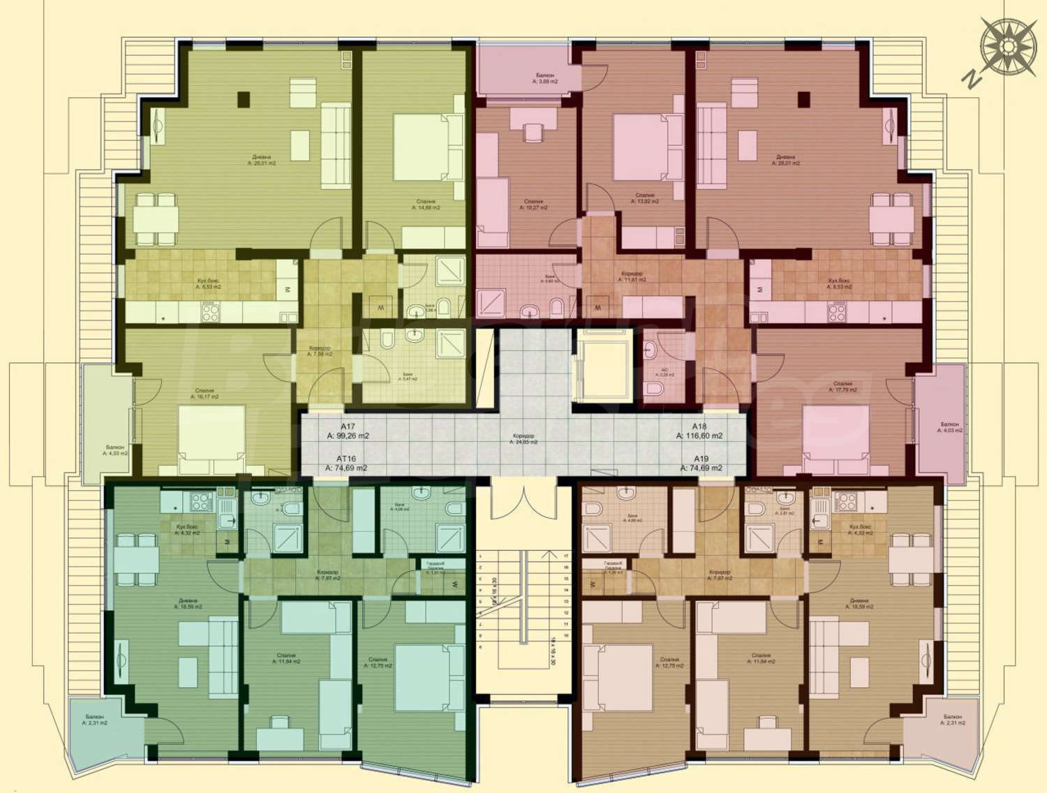 Апартаменти (различни типове), Четиристайни апартаменти, Офиси, Магазини, Гаражи