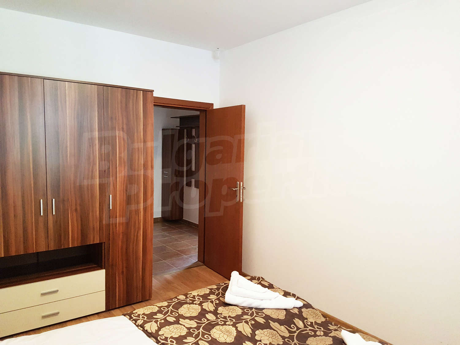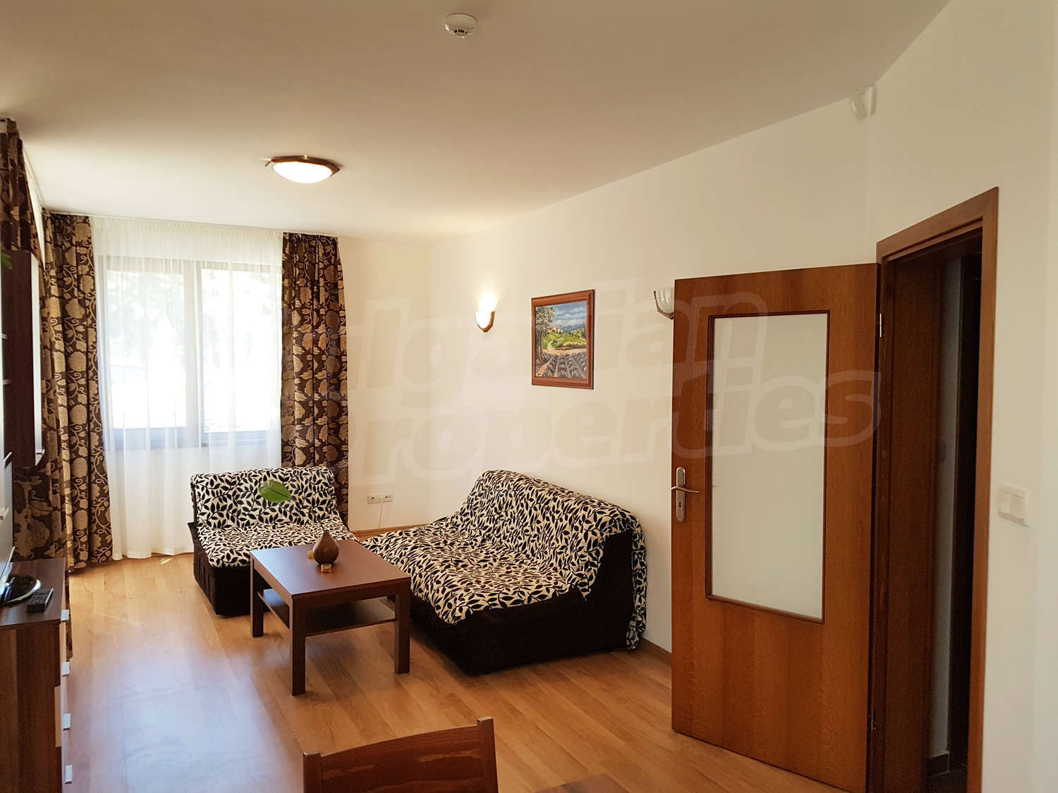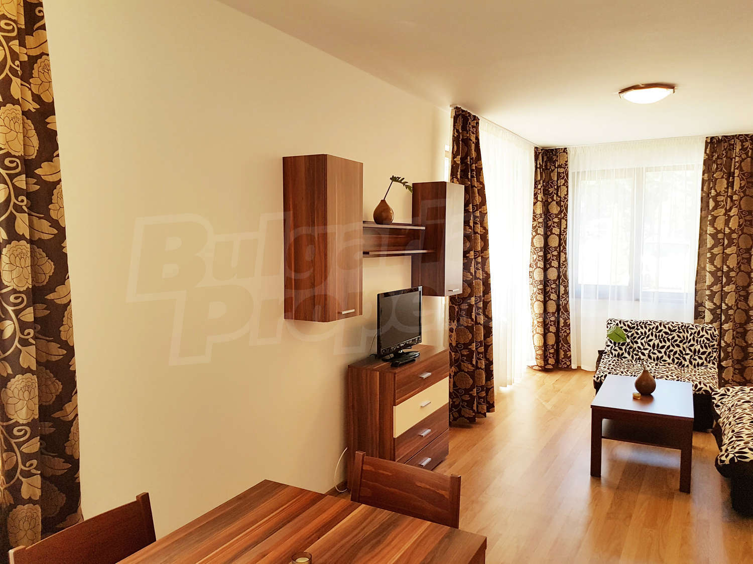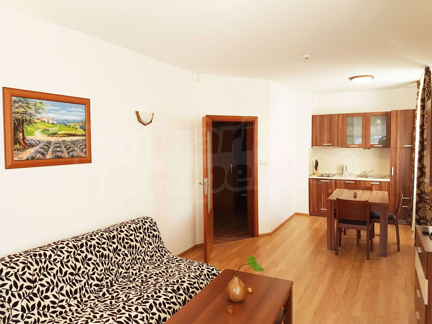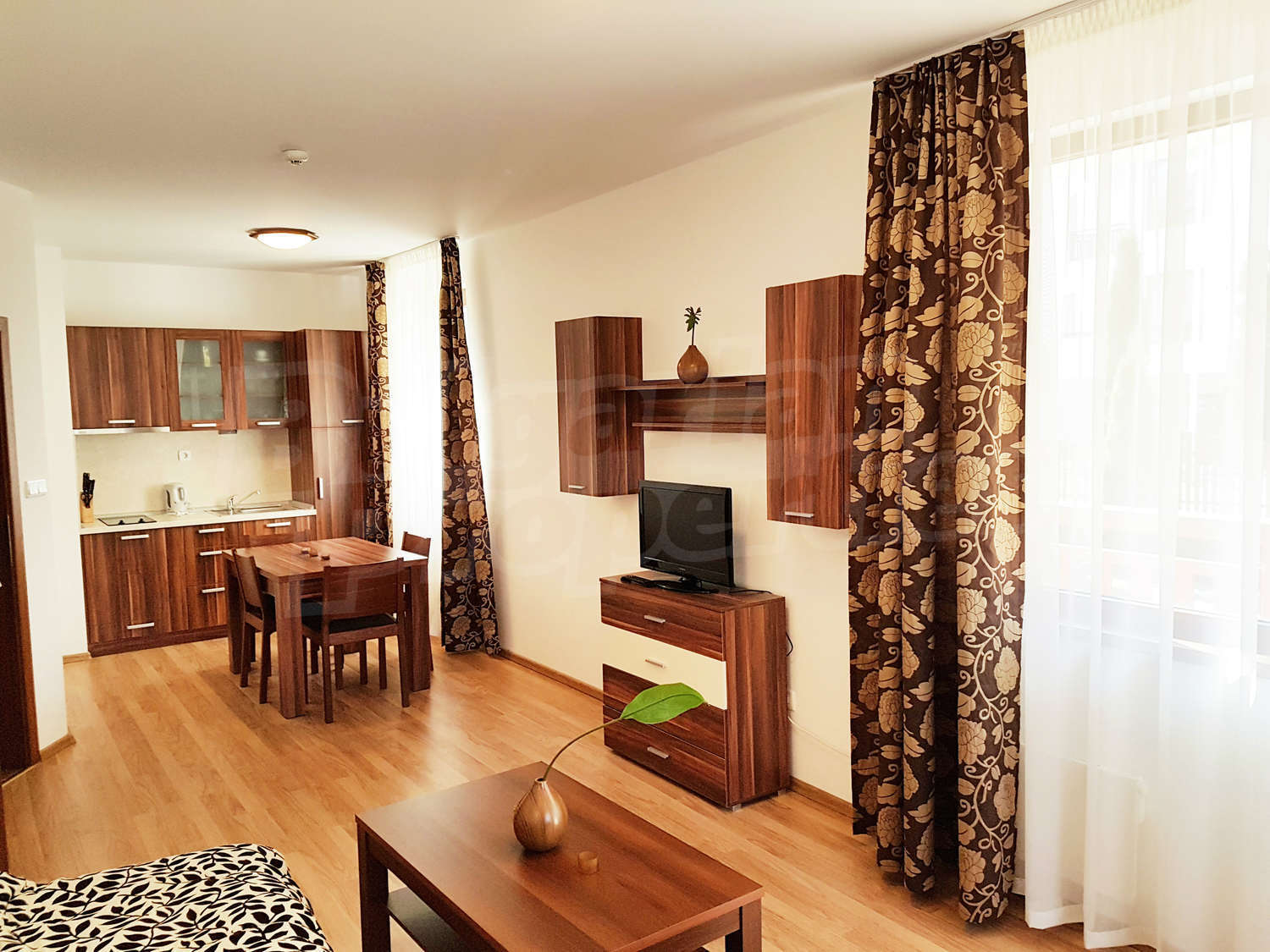 Жилището се намира на първи етаж, завършено със стени – латекс, под - ламинат и гранитогрес в коридора, дограма – дървена. Разпределение: спалня, отворена кухня с хол, баня с тоалетна и балкон – обща площ 79.04 кв.м. (чиста площ - 61.22 кв.м. + общи части - 17.82 кв.м.). Кухнята е оборудвана с керамичен плот, мивка, шкафове, хладилник, маса с 4 стола; хол - с 2 дивана, холна масичка, телевизор, тв шкаф; спалня - с двойно легло, две нощни шкафчета, гардероб, скрин; баня с тоалетна - вана, мивка с огледало. Имотът включва един южен балкон с красива гледка. Отоплението е с ел. конвектори Адакс. Апартаментът е снабден с интернет и кабелна телевизия. Годишна такса поддръжка - 12 евро / кв.м.