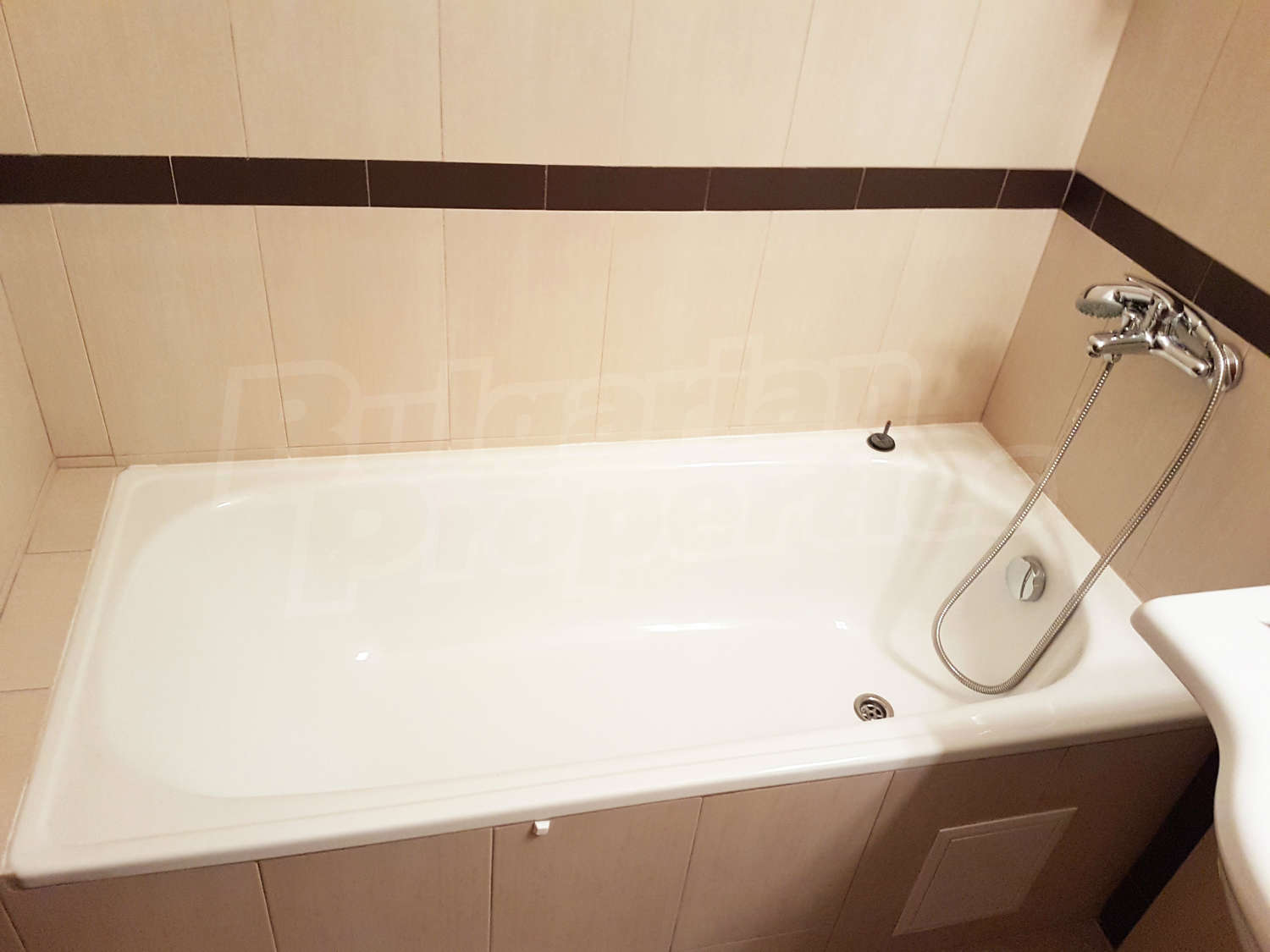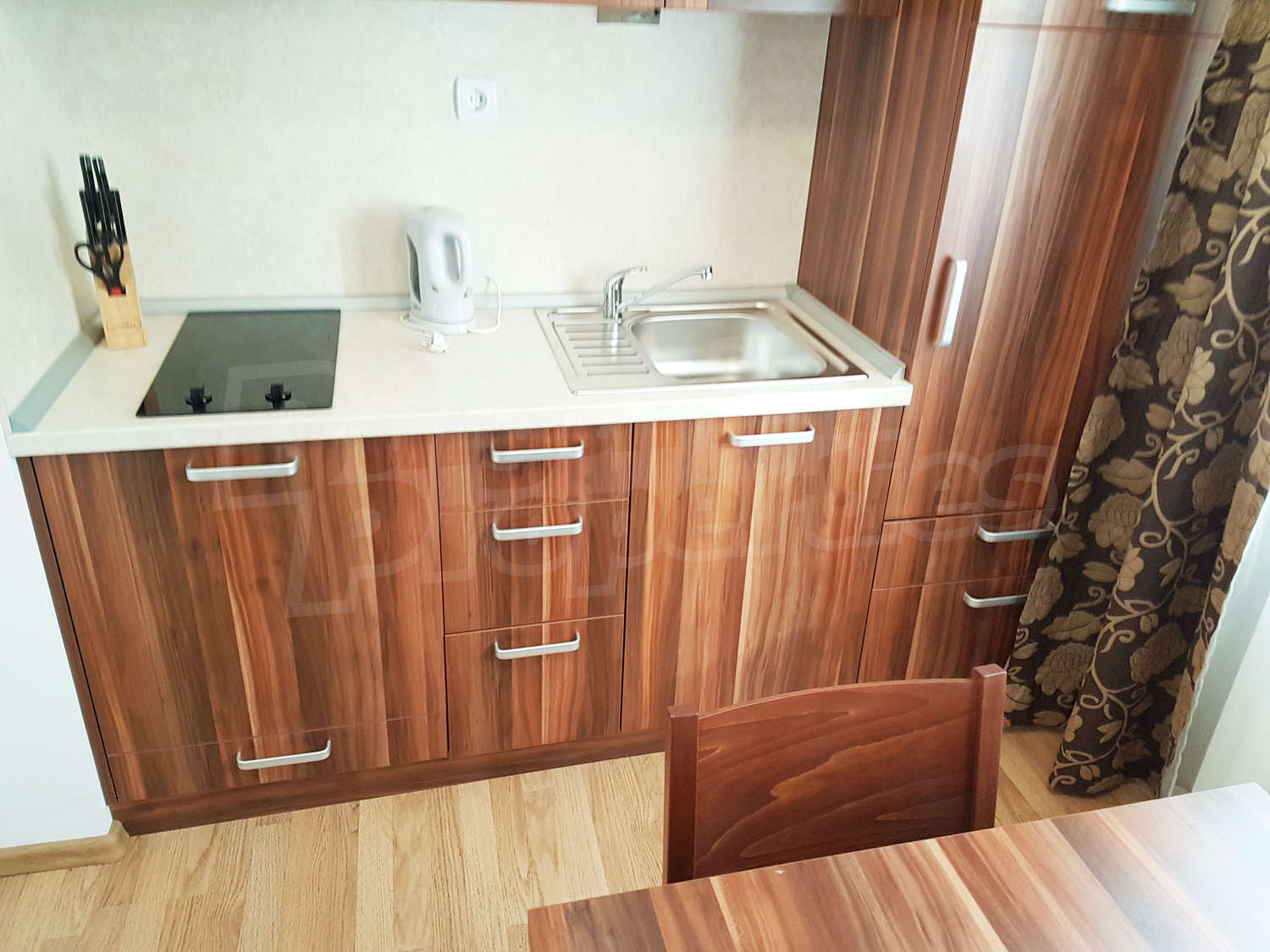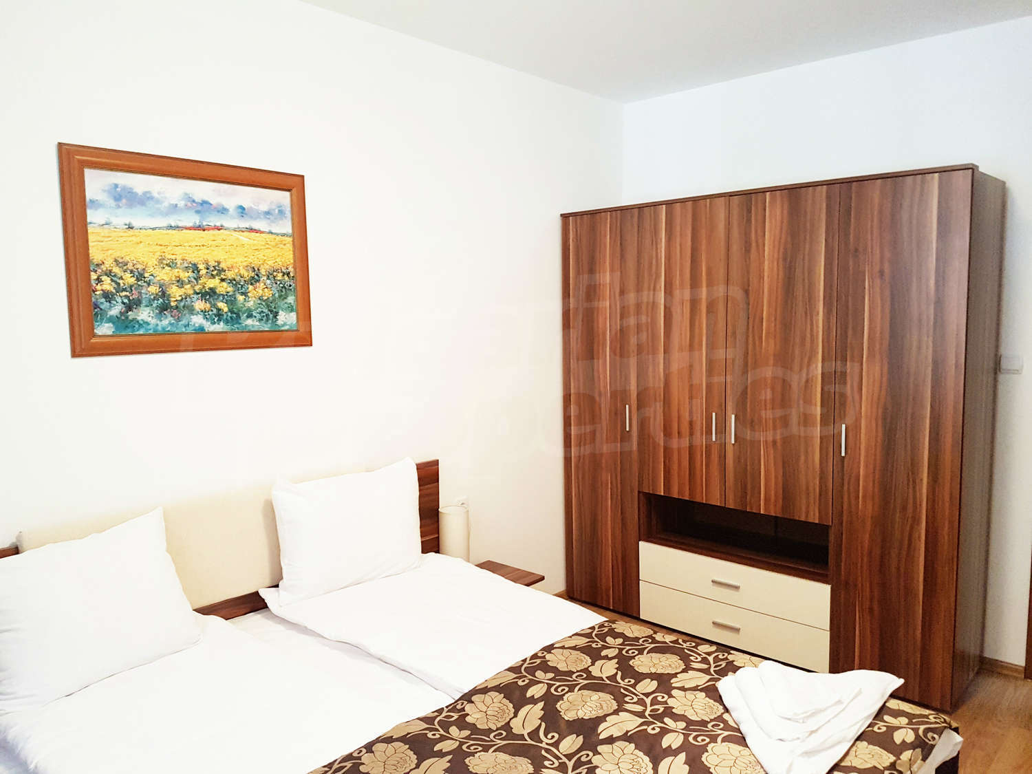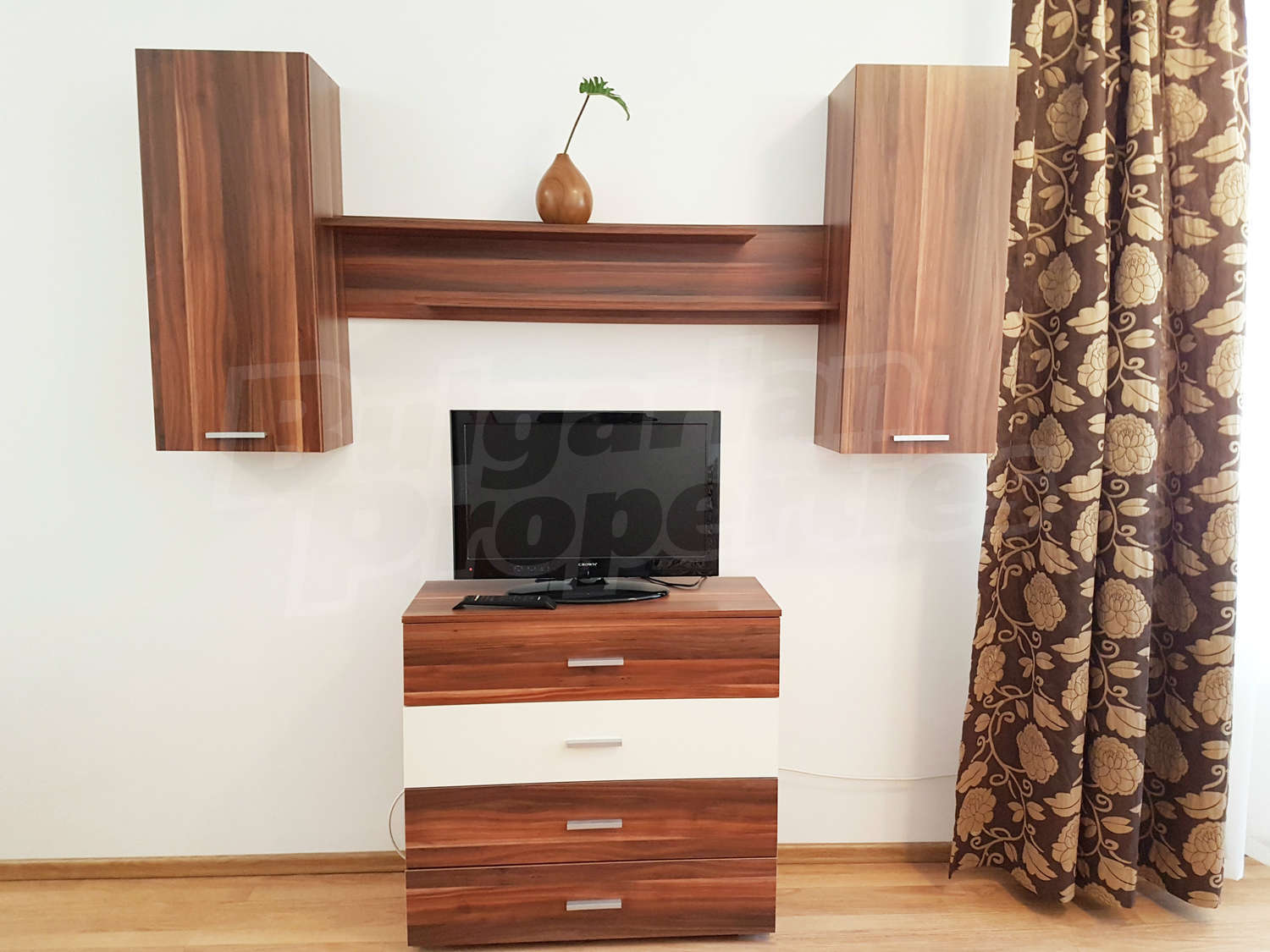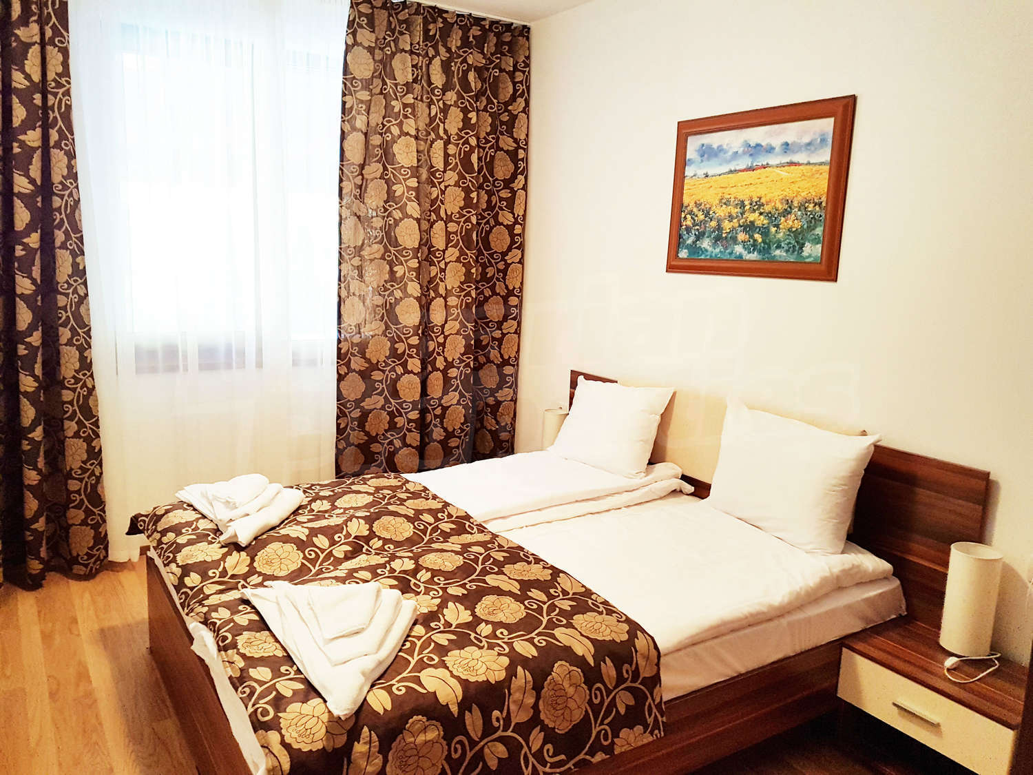 Жилището се намира на първи етаж, завършено със стени – латекс, под - ламинат и гранитогрес в коридора, дограма – дървена. Разпределение: спалня, отворена кухня с хол, баня с тоалетна и балкон – обща площ 79.04 кв.м. (чиста площ - 61.22 кв.м. + общи части - 17.82 кв.м.). Кухнята е оборудвана с керамичен плот, мивка, шкафове, хладилник, маса с 4 стола; хол - с 2 дивана, холна масичка, телевизор, тв шкаф; спалня - с двойно легло, две нощни шкафчета, гардероб, скрин; баня с тоалетна - вана, мивка с огледало. Имотът включва един южен балкон с красива гледка. Отоплението е с ел. конвектори Адакс. Апартаментът е снабден с интернет и кабелна телевизия. Годишна такса поддръжка - 12 евро / кв.м.