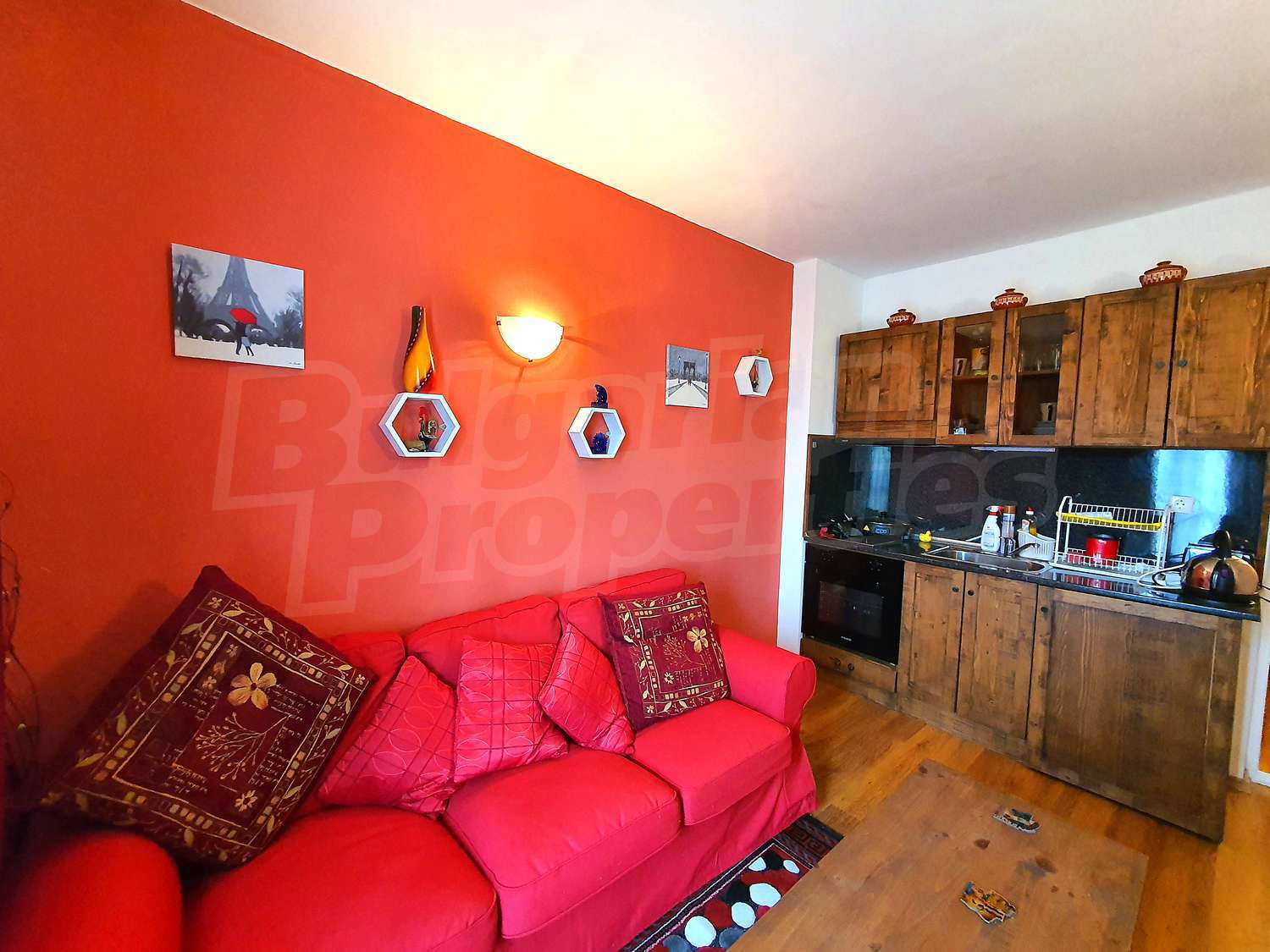 Апартаментът е завършен с подови настилки ламинат и теракот, стени - латекс и ПВЦ дограми. Отоплението е чрез електрически радиатори. Годишната такса за поддръжка е 10 евро/кв.м.