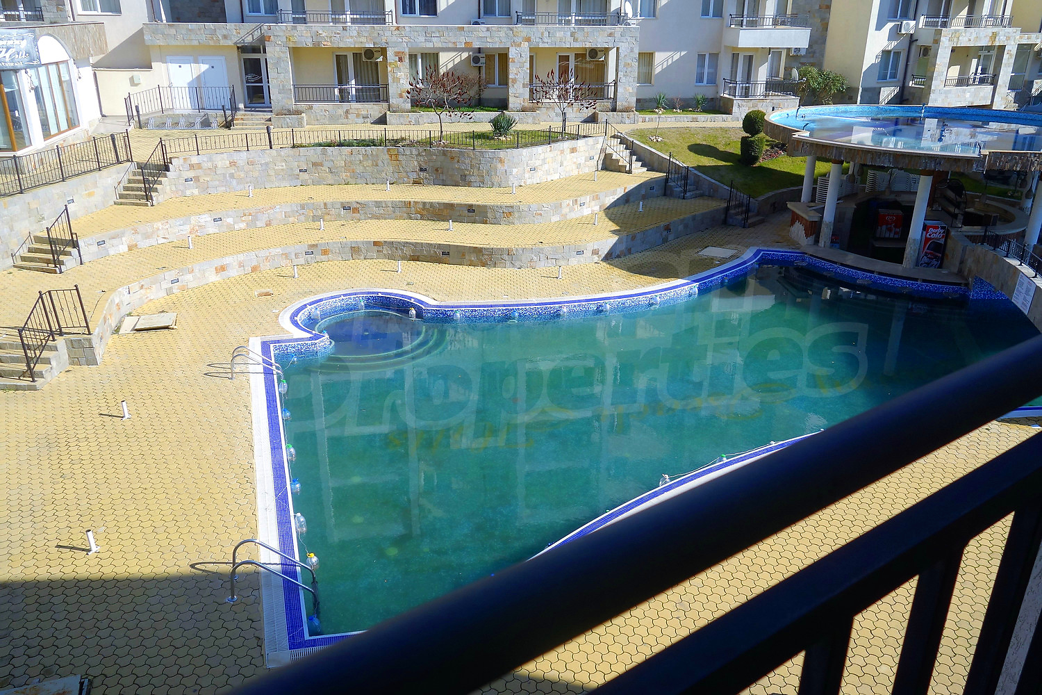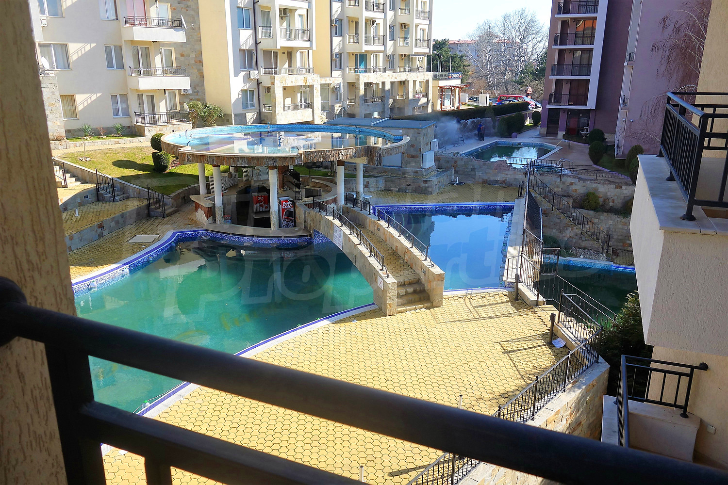 Готово за нанасяне ваканционно жилище с две спални и гледка към вътрешен двор с басейн. Апартаментът се намира на трети етаж в комплекс "Съни Бийч Хилс" (Sunny Beach Hills) в Слънчев бряг, едва на 300 м от плажа, на 100 м от автобусна спирка, в близост до голям супермаркет, както и до първата спирка на туристическото атракционно влакче, което обикаля целия курортен комплекс и стига до античния град Несебър.
