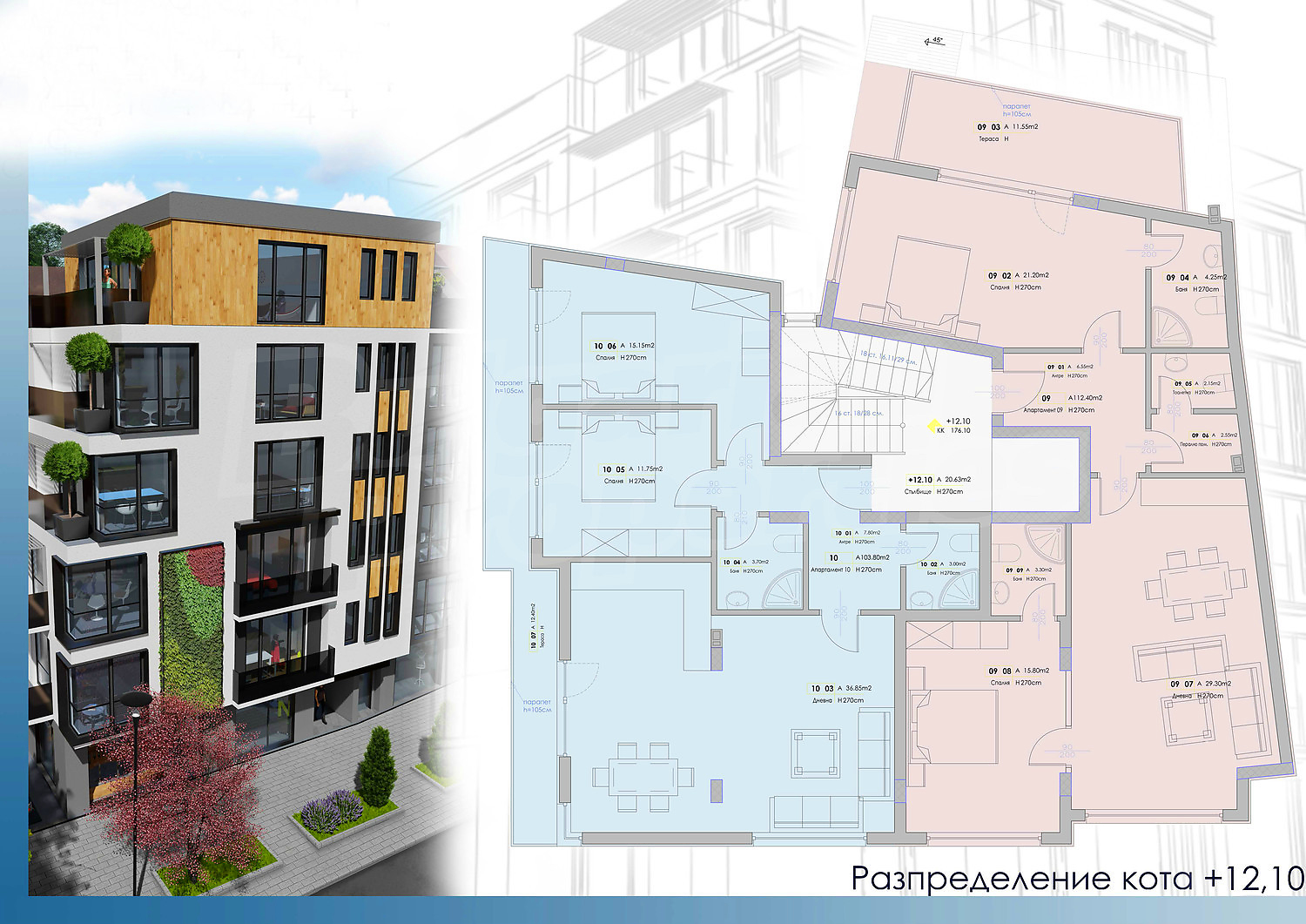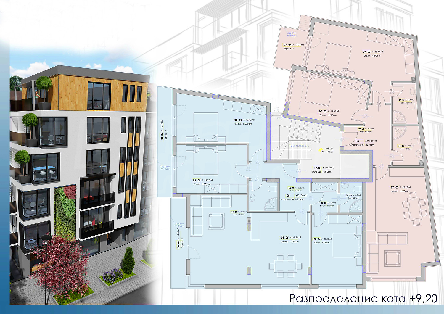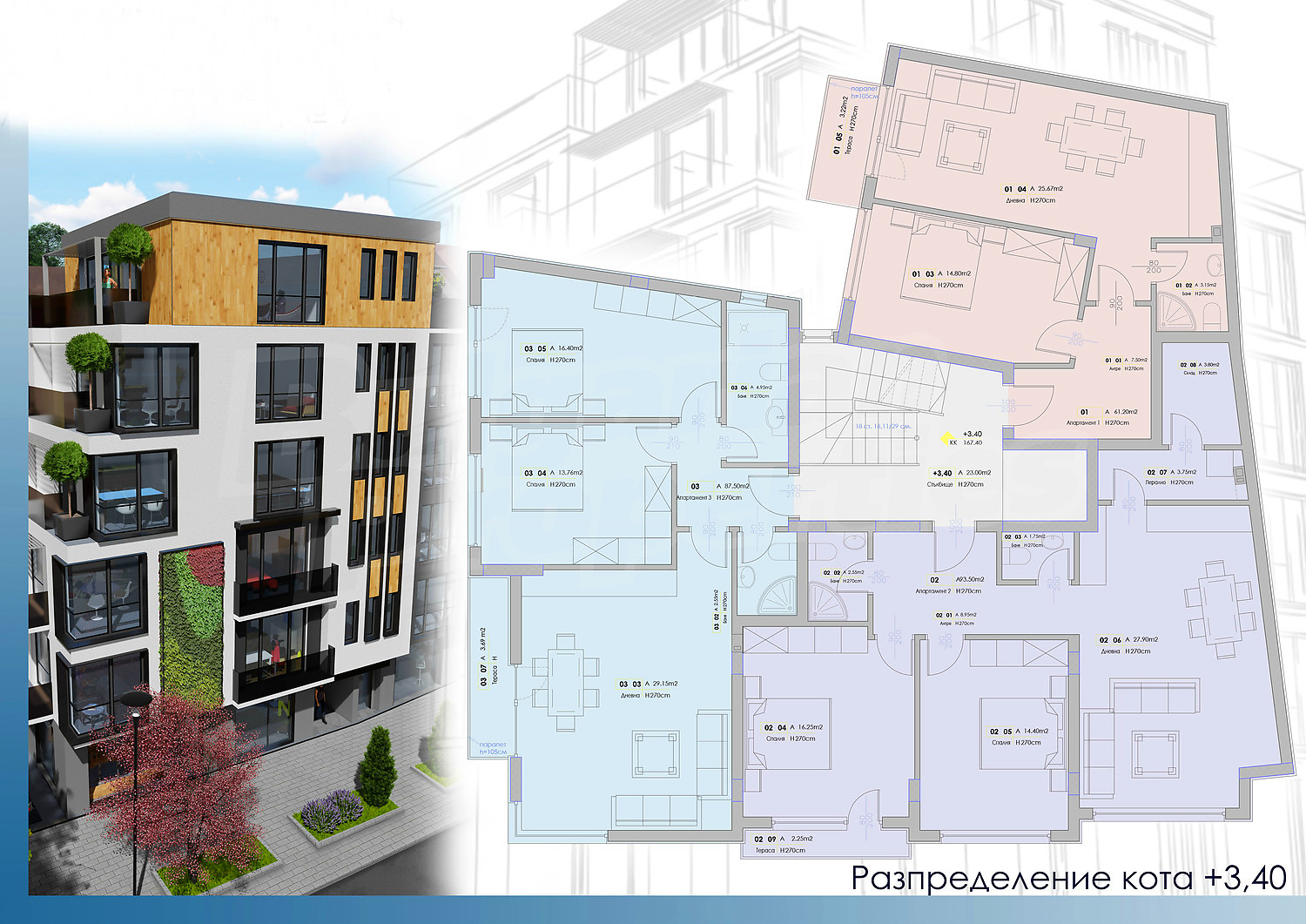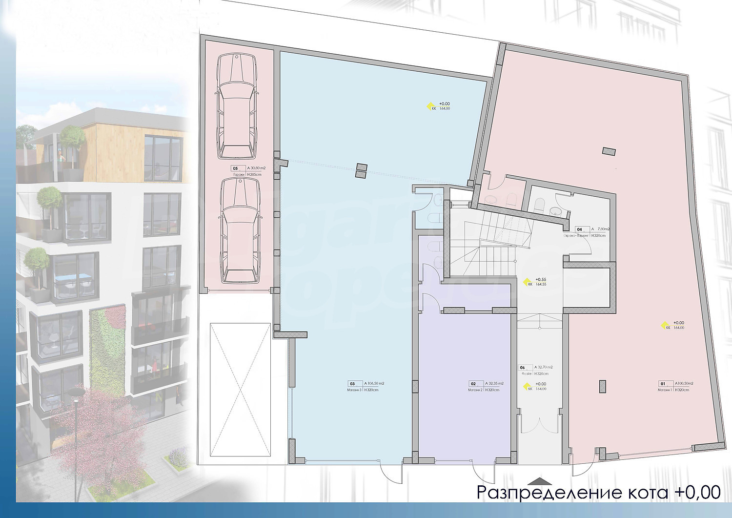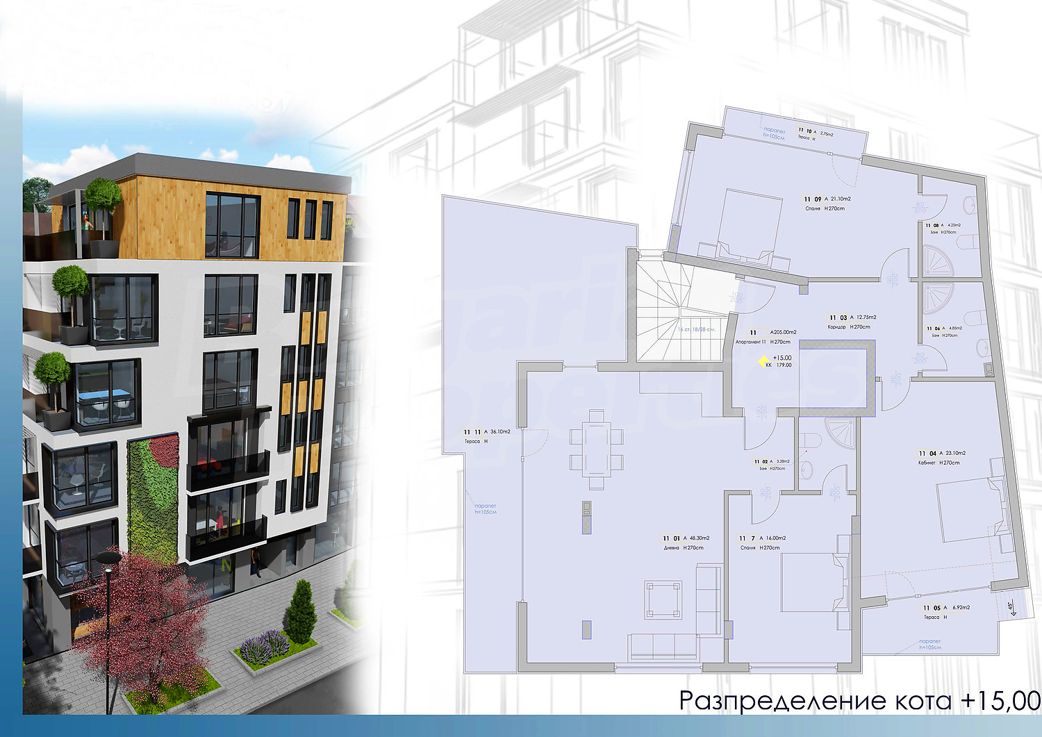 Сградата ще бъде завършена с качествени материали, обслужвана от модерен и безшумен асансьор. На приземното ниво ще има магазини, а останалите 5 етажа ще бъдат жилищни.