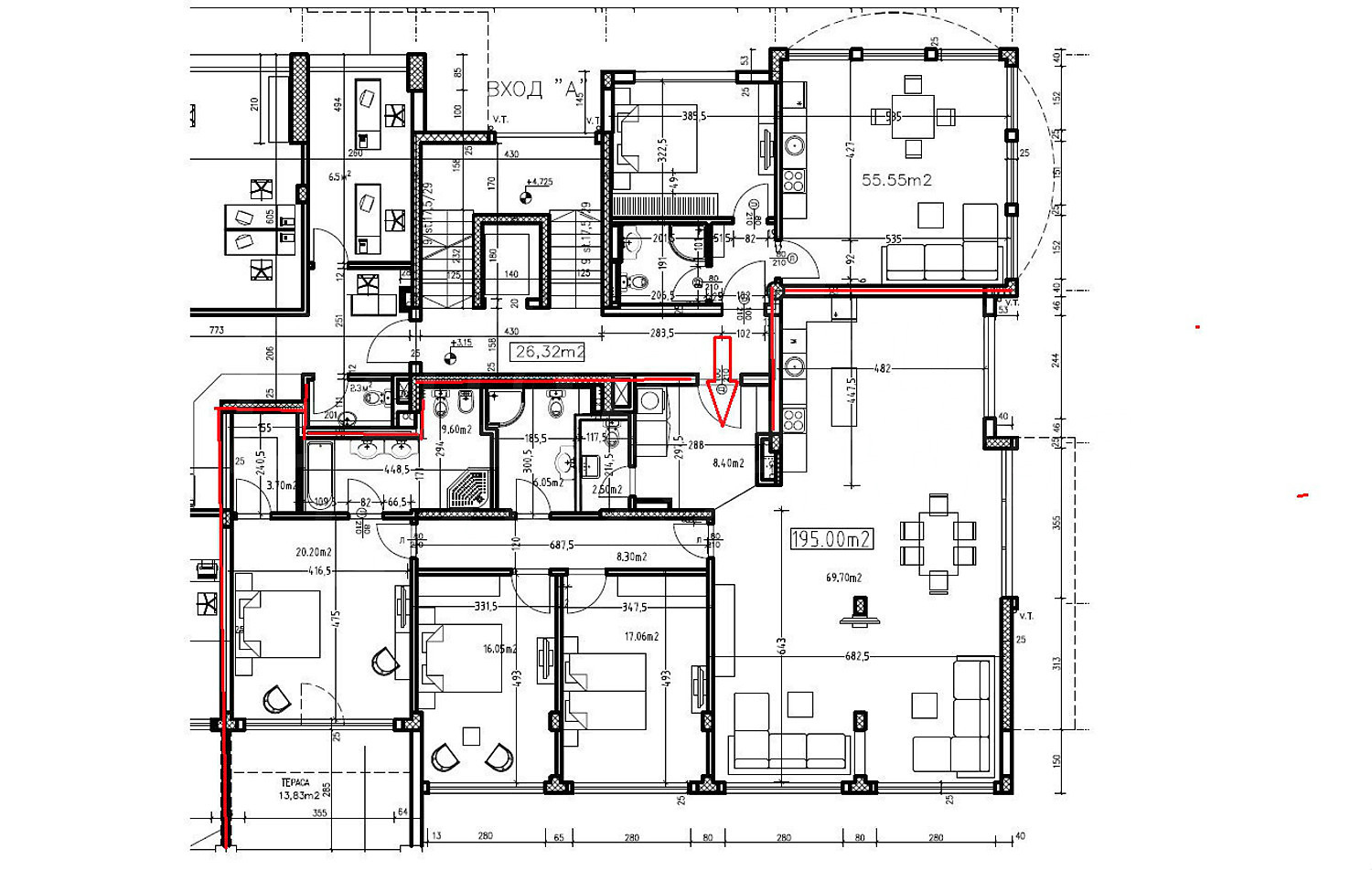 Жилището (2002 година) е с изложение юг-изток и обща площ от 220 кв.м., чиста площ – 195 кв.м., разпределени между: