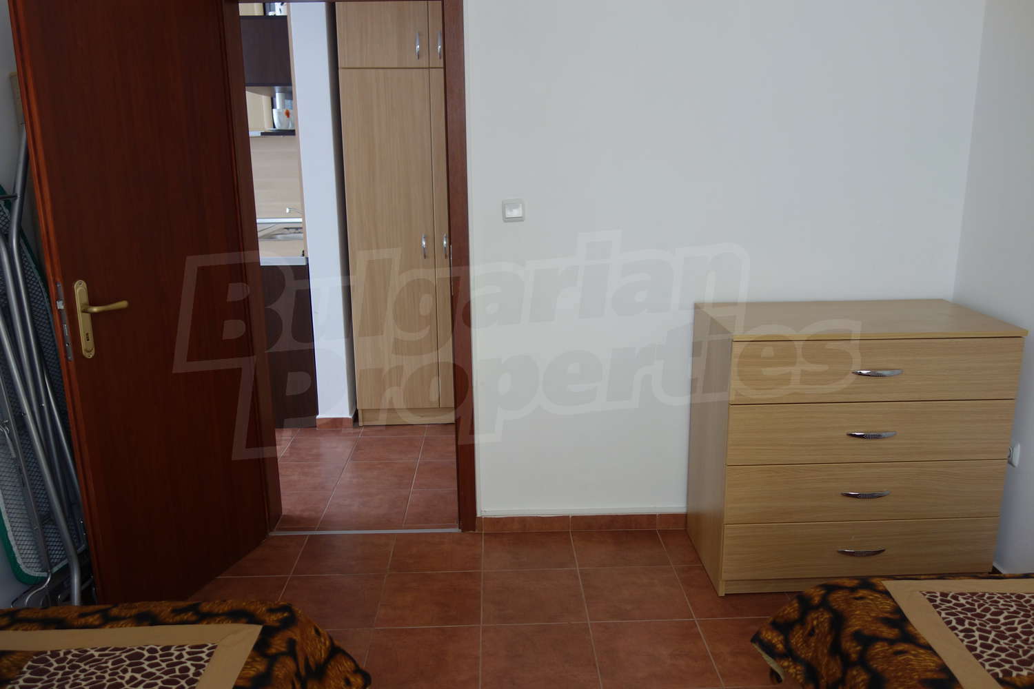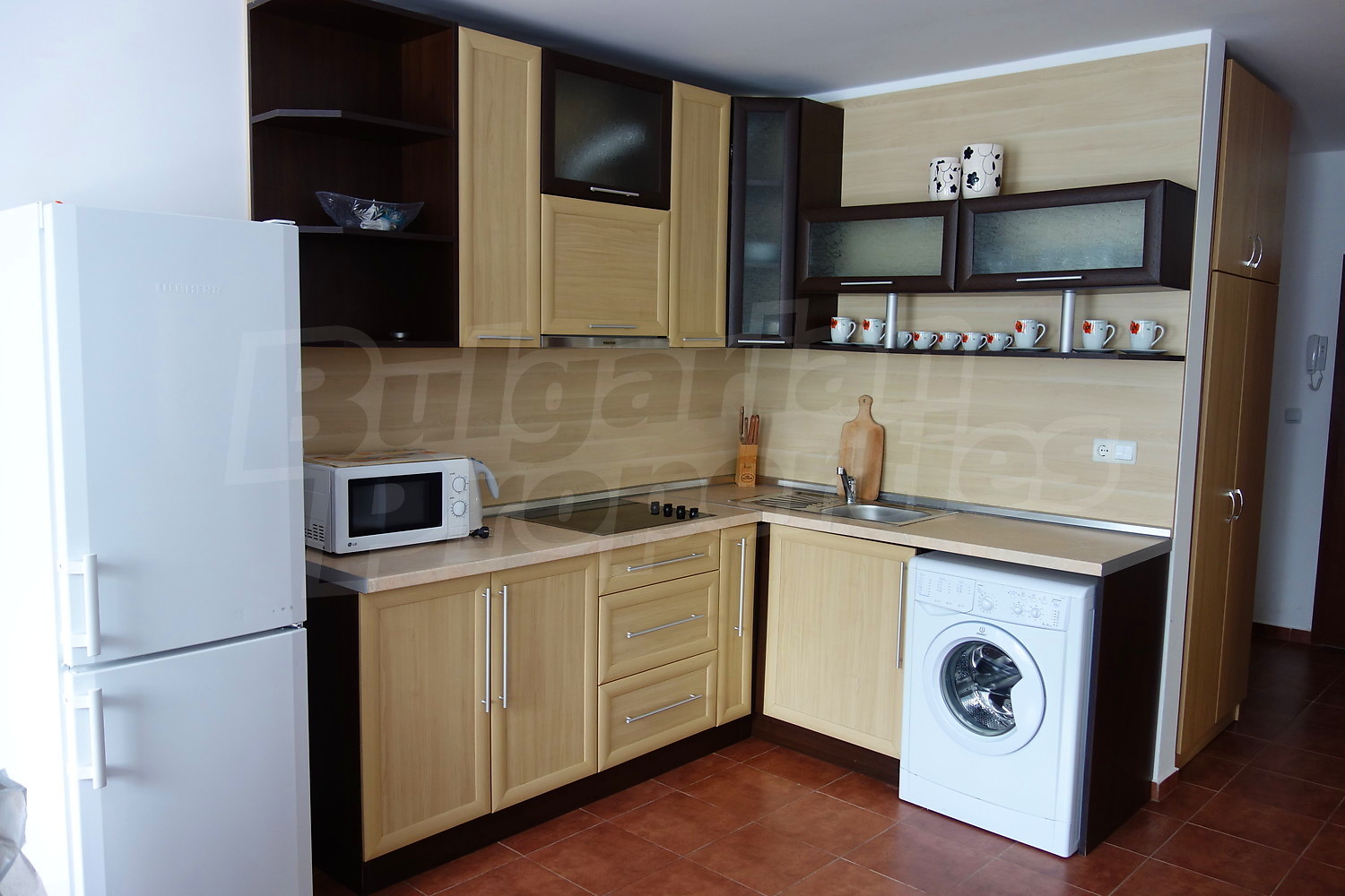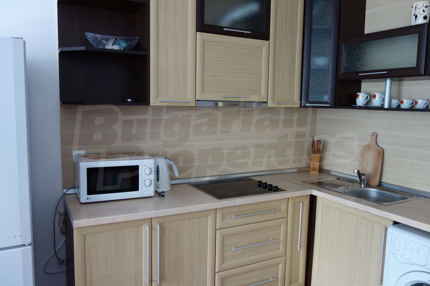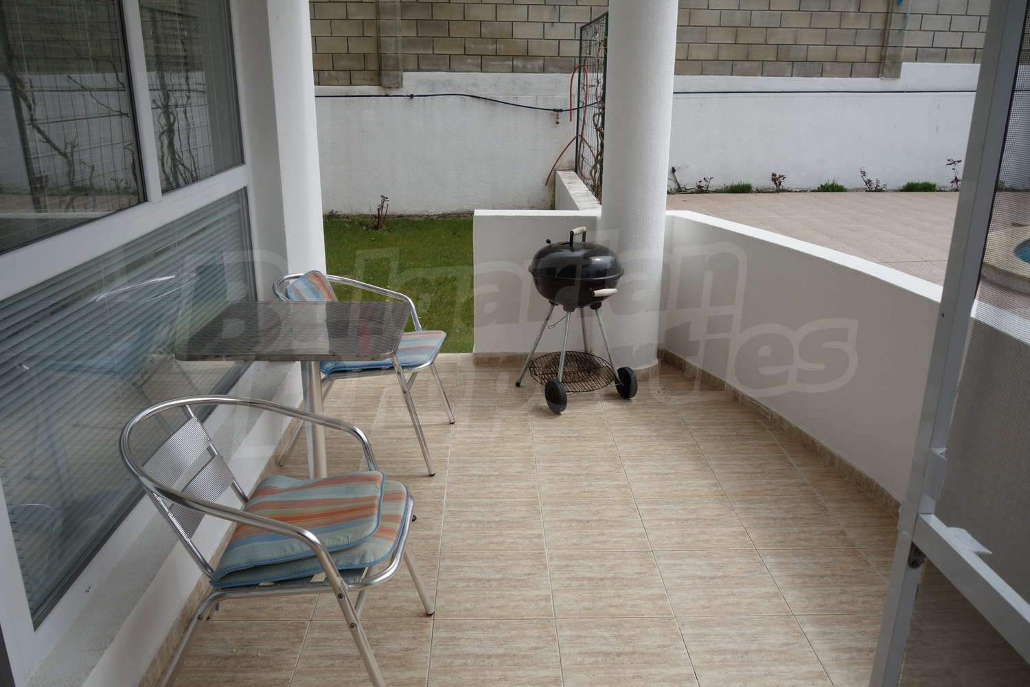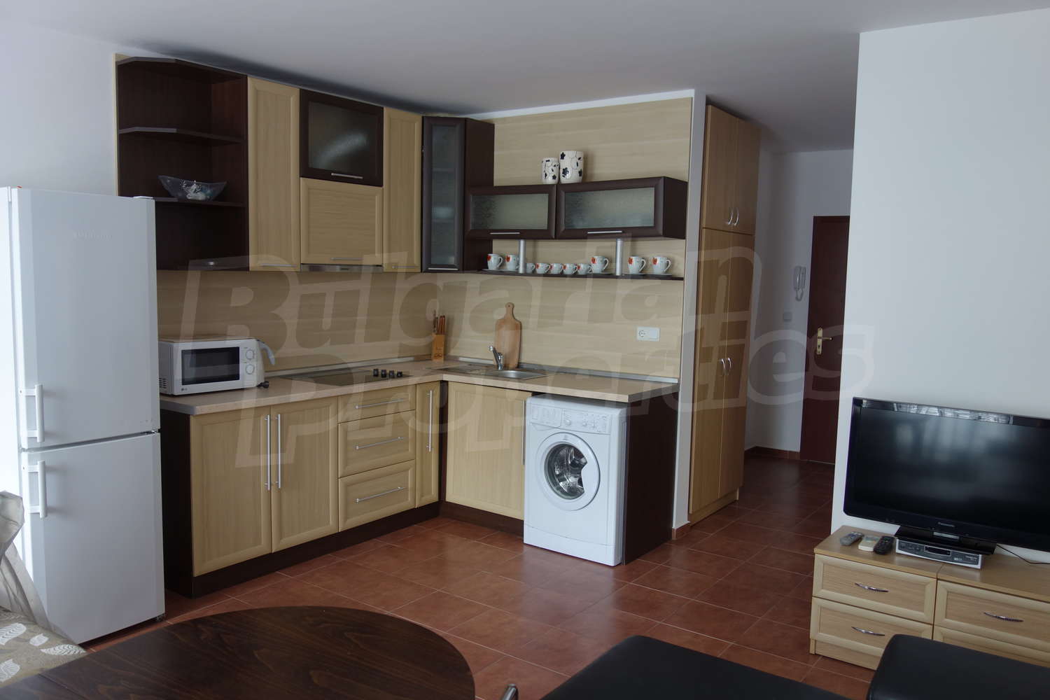 Кухня с кухненски шкафове, пералня, хладилник, микровълнова, абсорбатор, керамични котлони, голям диван с масичка, маса за хранене със столове. Първата спалня разполага с голяма спалня с гардероб, втората с две единични легла и скрин. От хола и едната спалня има излаз на терасата и градинката. Напълно оборудвана баня с душ кабина и всички необходими аксесоари.