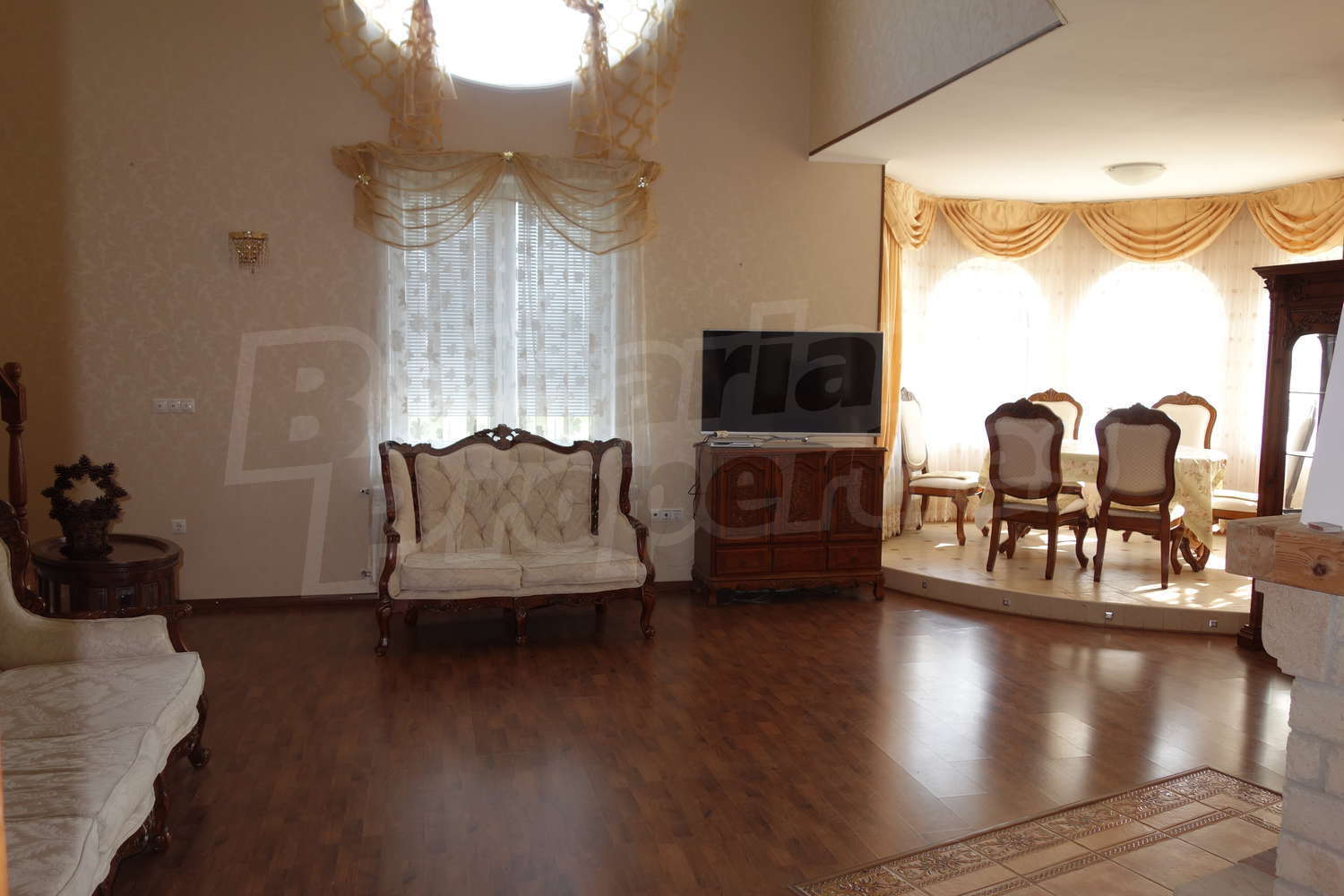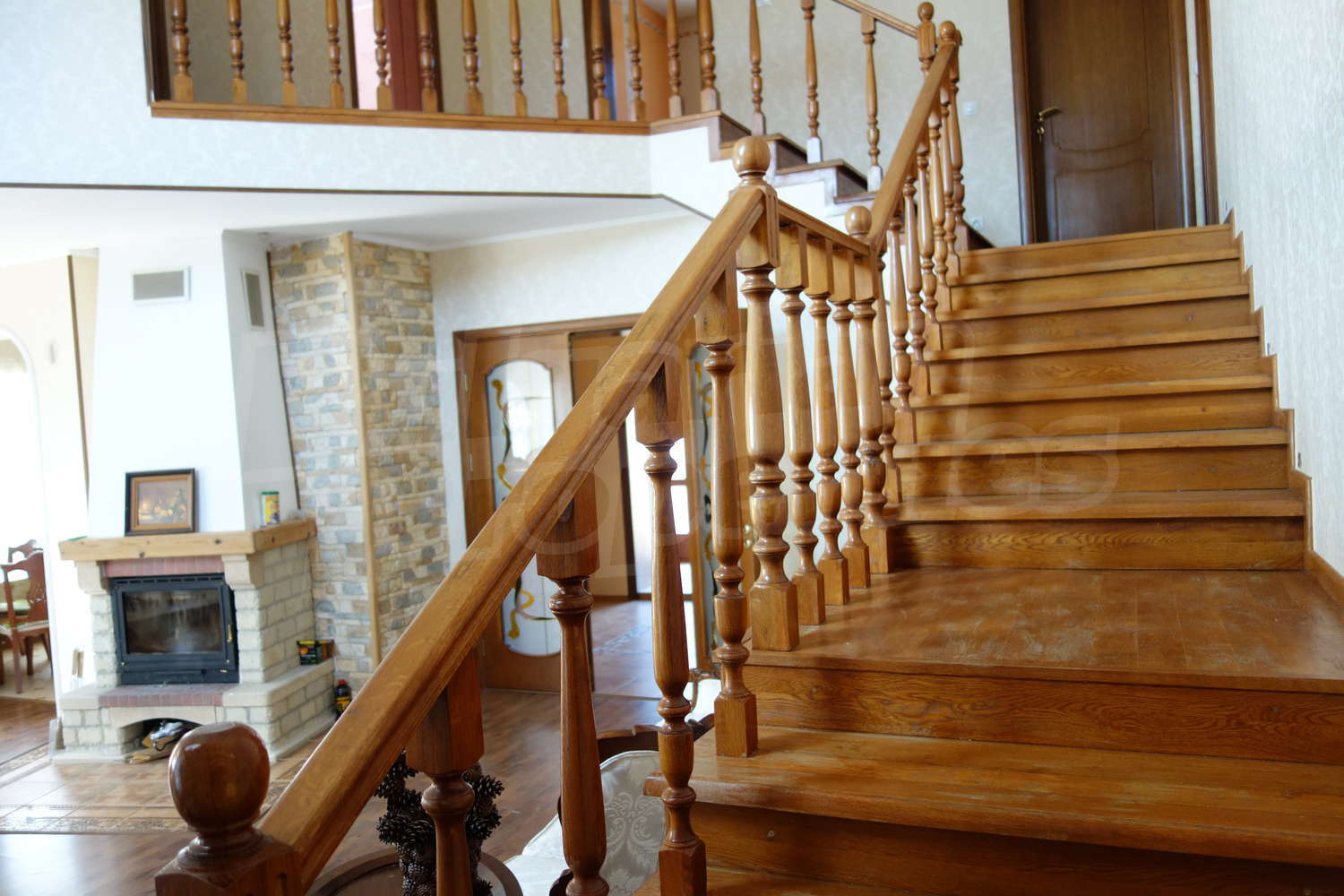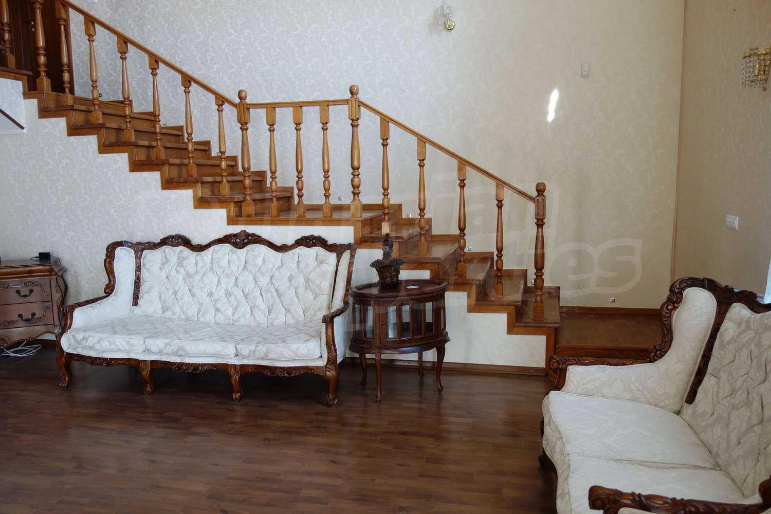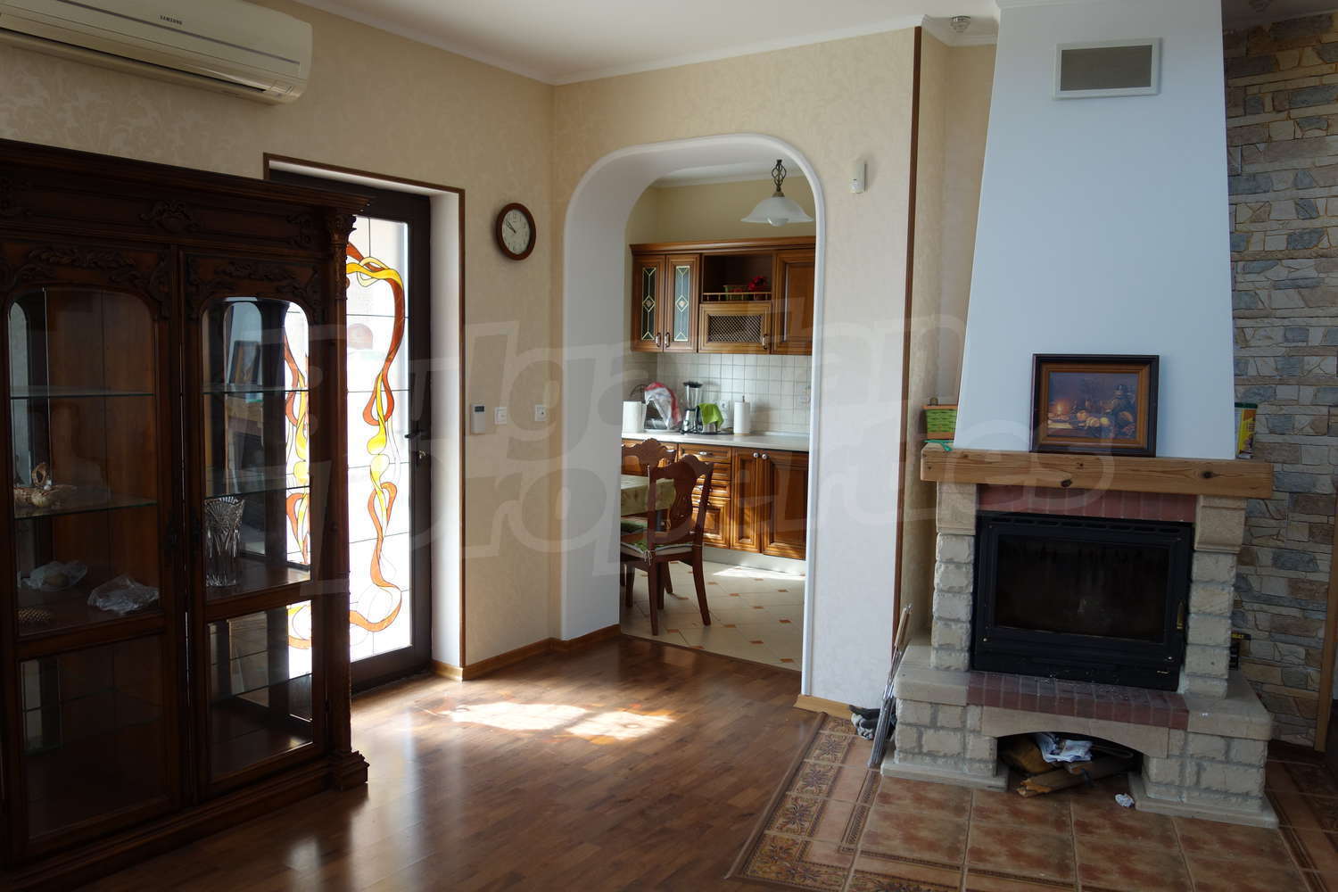 • Първи етаж – коридор, баня с тоалетна, спалня, работен кабинет, огромен хол с камина, трапезария, кухня. От коридора има достъп към голямо подземно складово помещение, където има котелно за отопление на цялата къща на твърдо гориво, комбинирано със соларна система. Има и два бойлера.