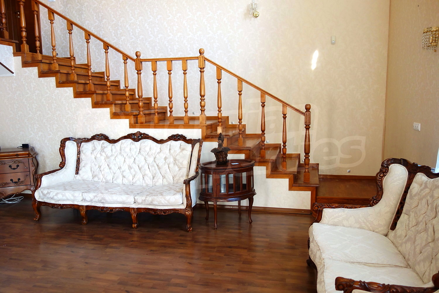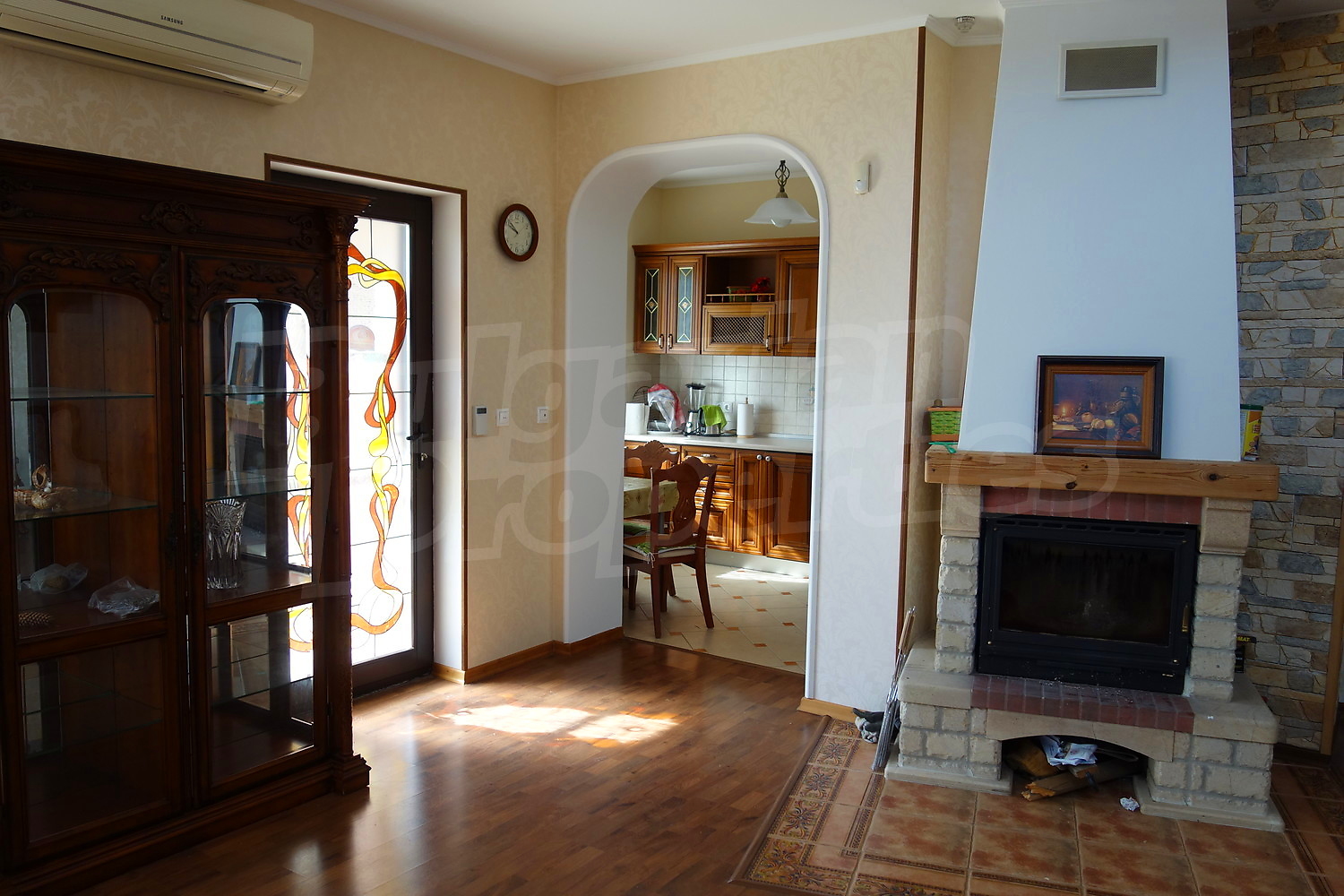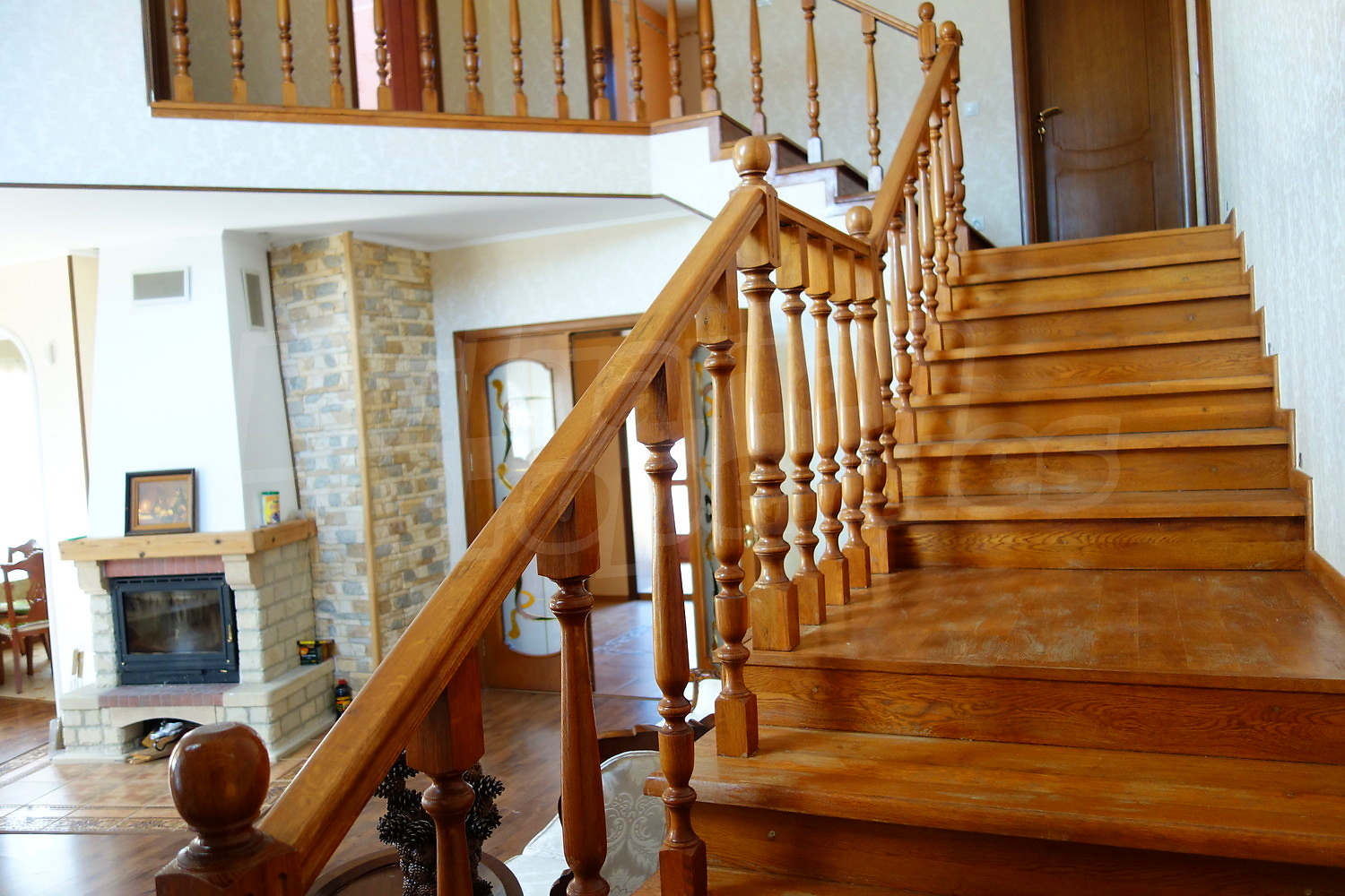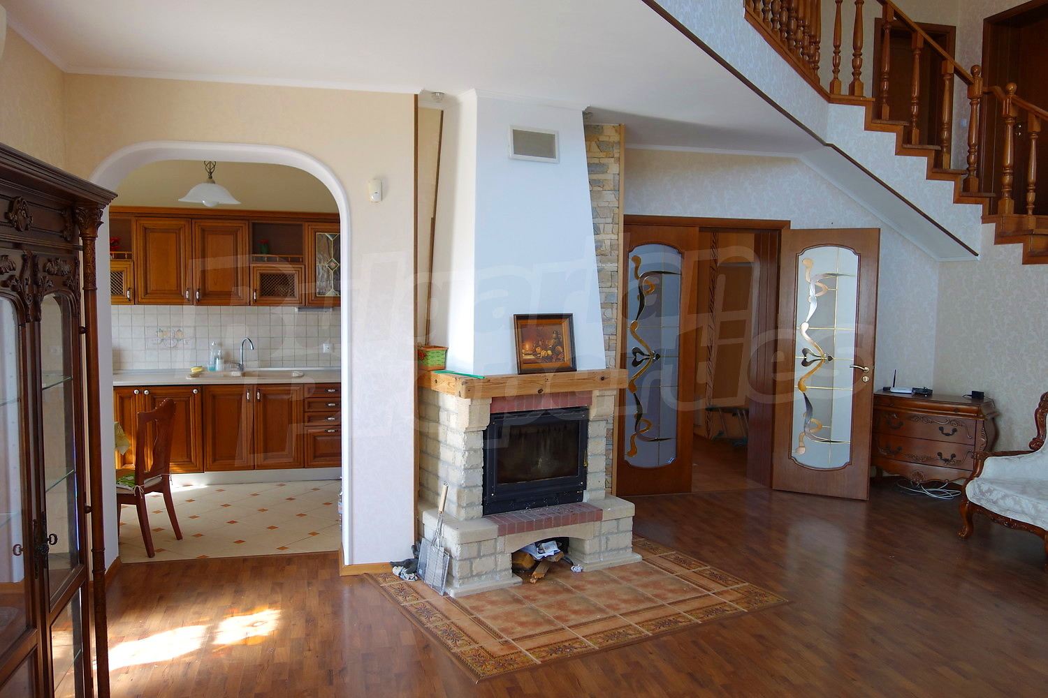 • Първи етаж – коридор, баня с тоалетна, спалня, работен кабинет, огромен хол с камина, трапезария, кухня. От коридора има достъп към голямо подземно складово помещение, където има котелно за отопление на цялата къща на твърдо гориво, комбинирано със соларна система. Има и два бойлера.