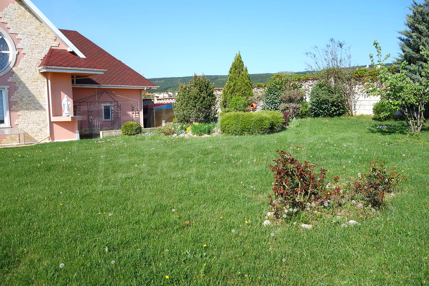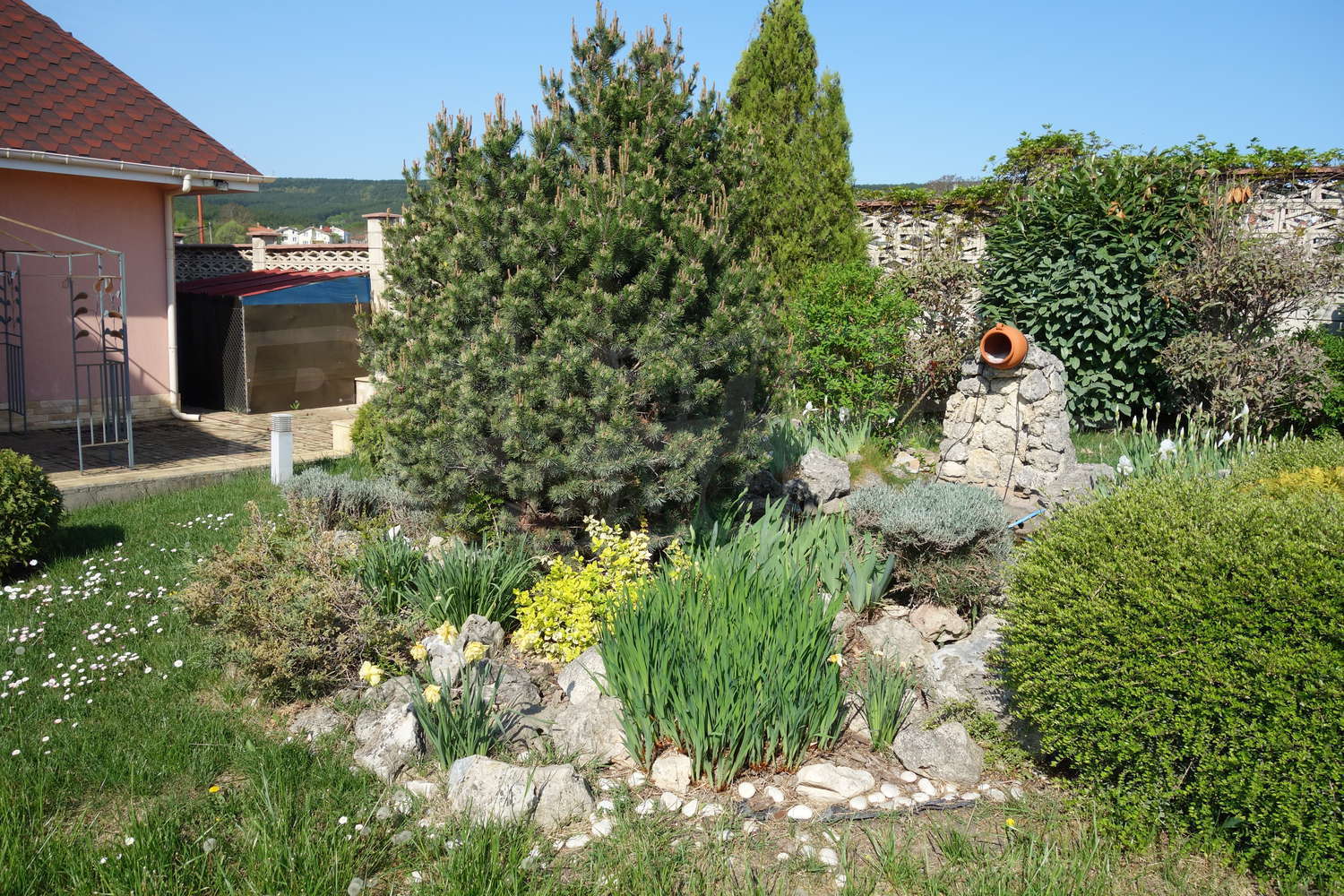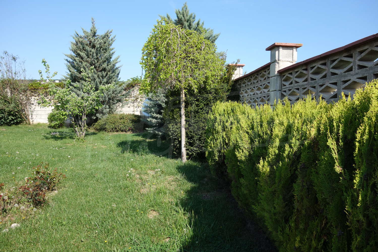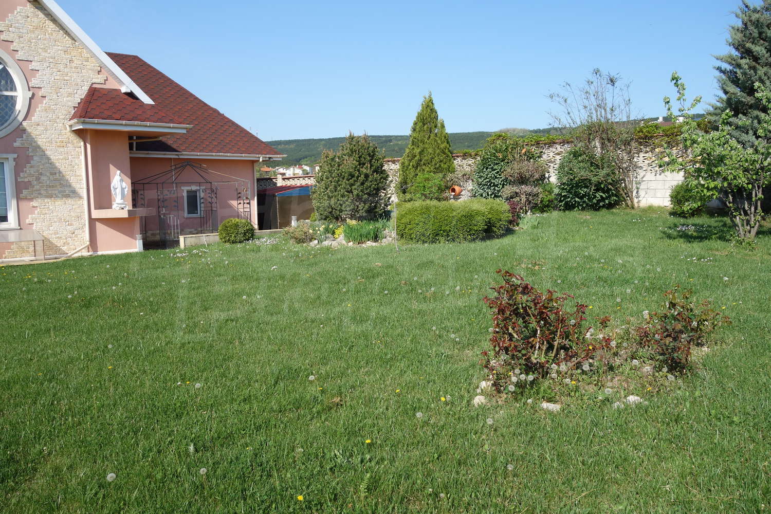 Голям двор с площ 1100кв.м. е много добре аранжиран, с автоматична поливна система, малко езерце, кипариси, туя, декоративни череши и сливи, киви, лози.
