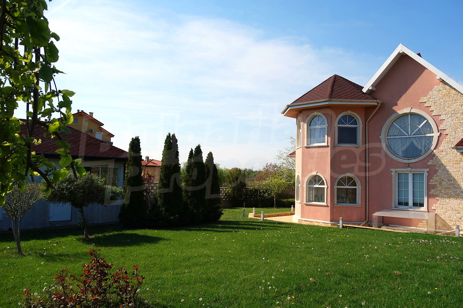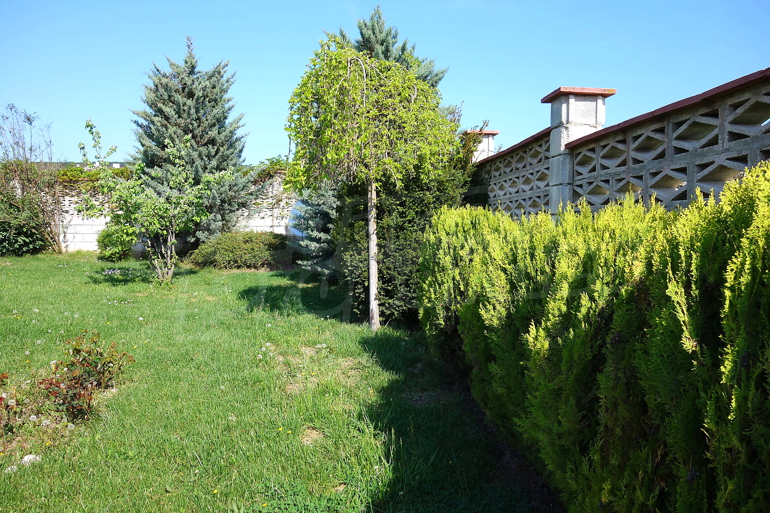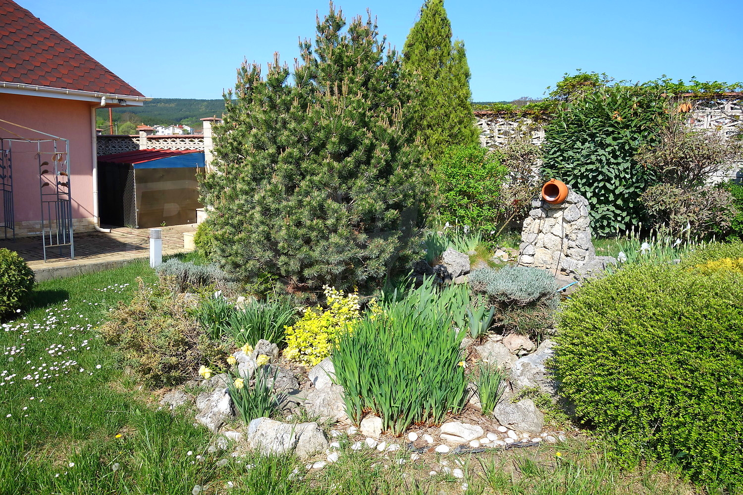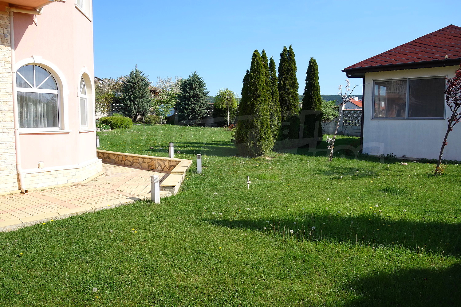 Голям двор с площ 1100кв.м. е много добре аранжиран, с автоматична поливна система, малко езерце, кипариси, туя, декоративни череши и сливи, киви, лози.