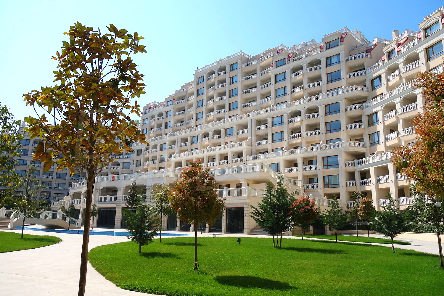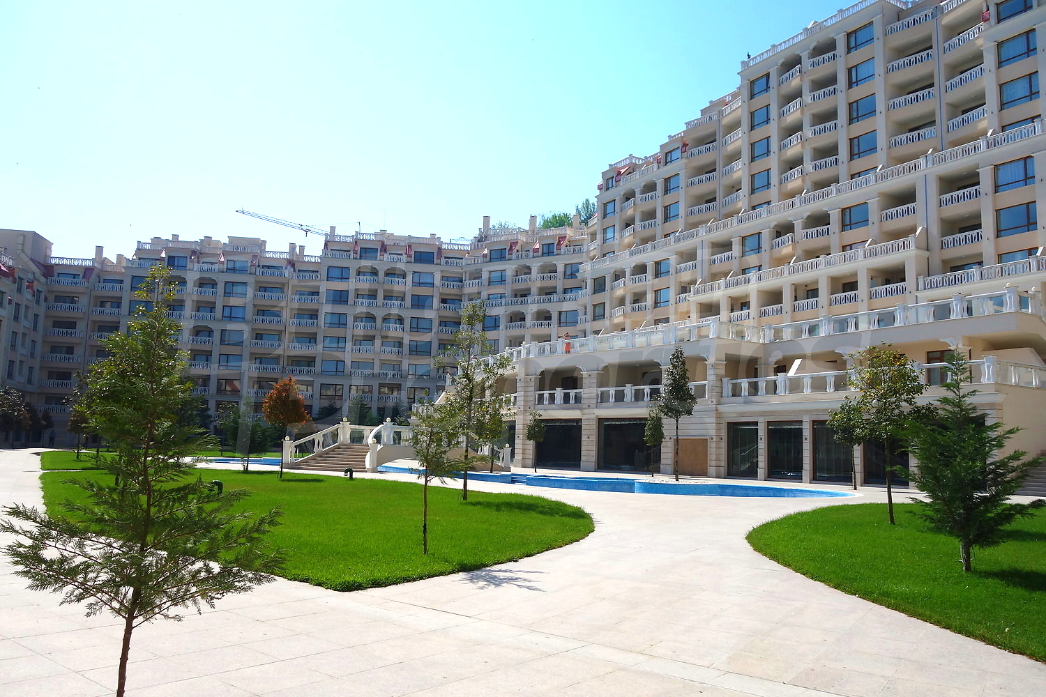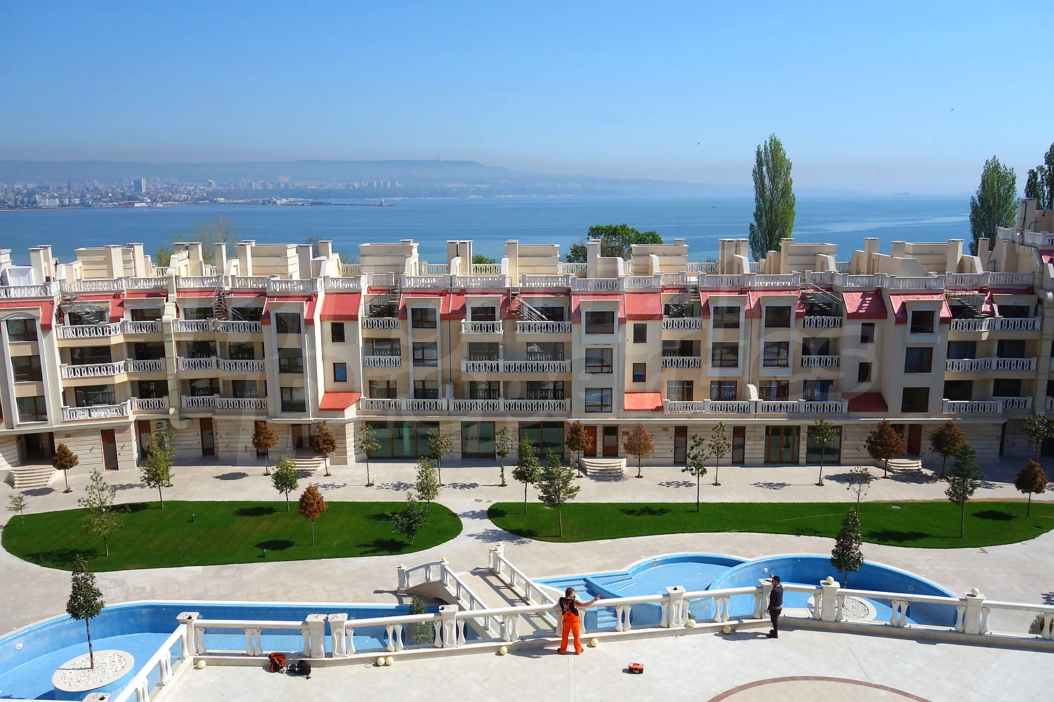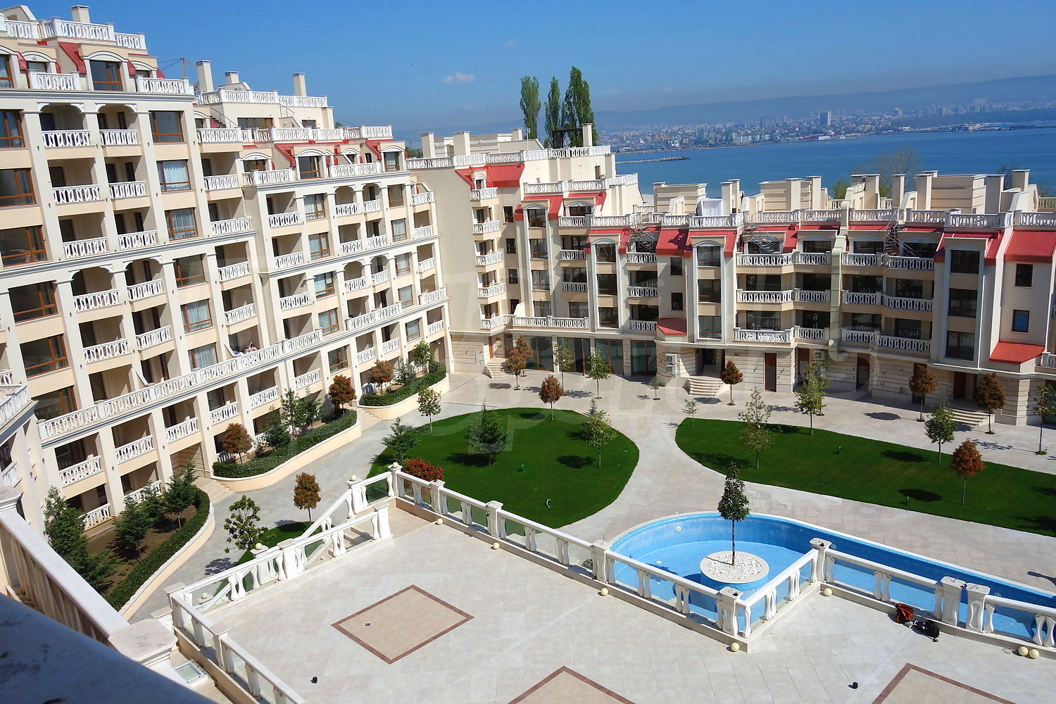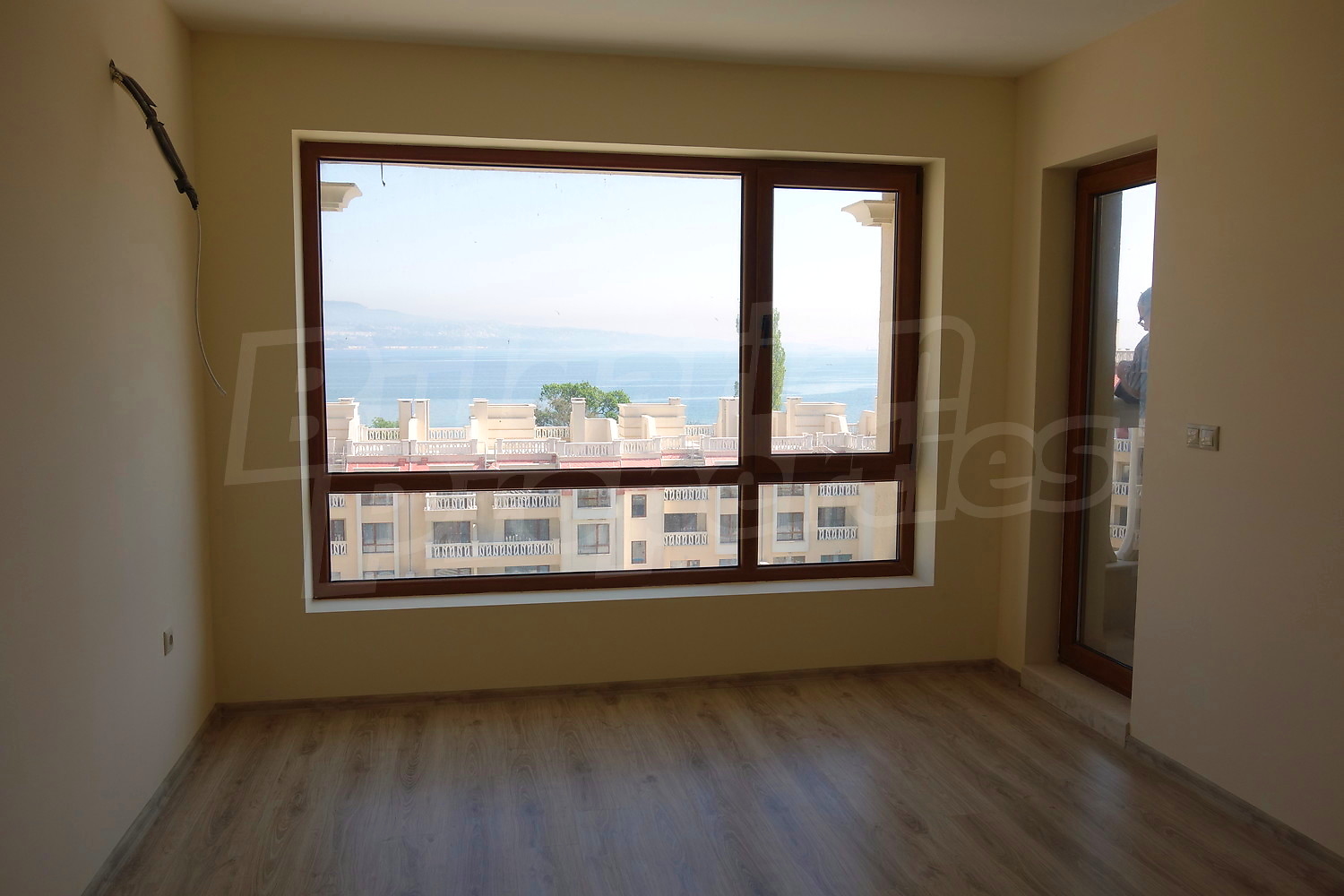 Двустаен апартамент с уникална гледка към Варненския залив и подземно паркомясто към него. Апартаментът е с площ от 76.66 кв.м. и е разположен на пети етаж от общо девет в най-добрата секция на комплекса, разположена фронтално срещу плажа и морето (първа линия). Имотът се продава завършен до ключ с качествени настилки и напълно готова и оборудвана баня.