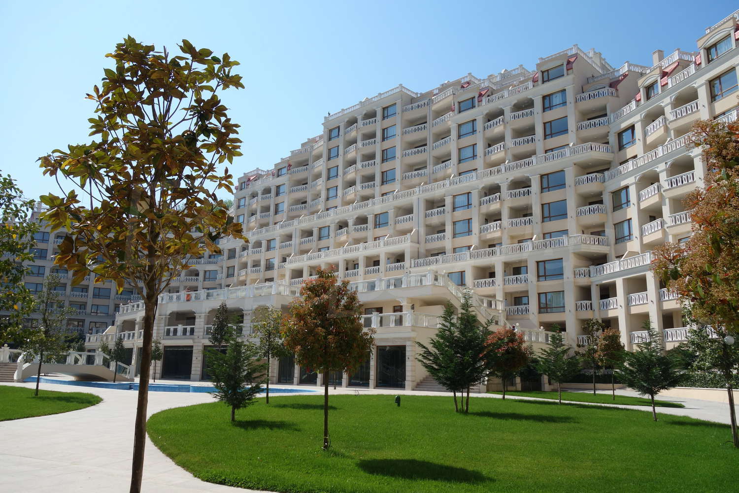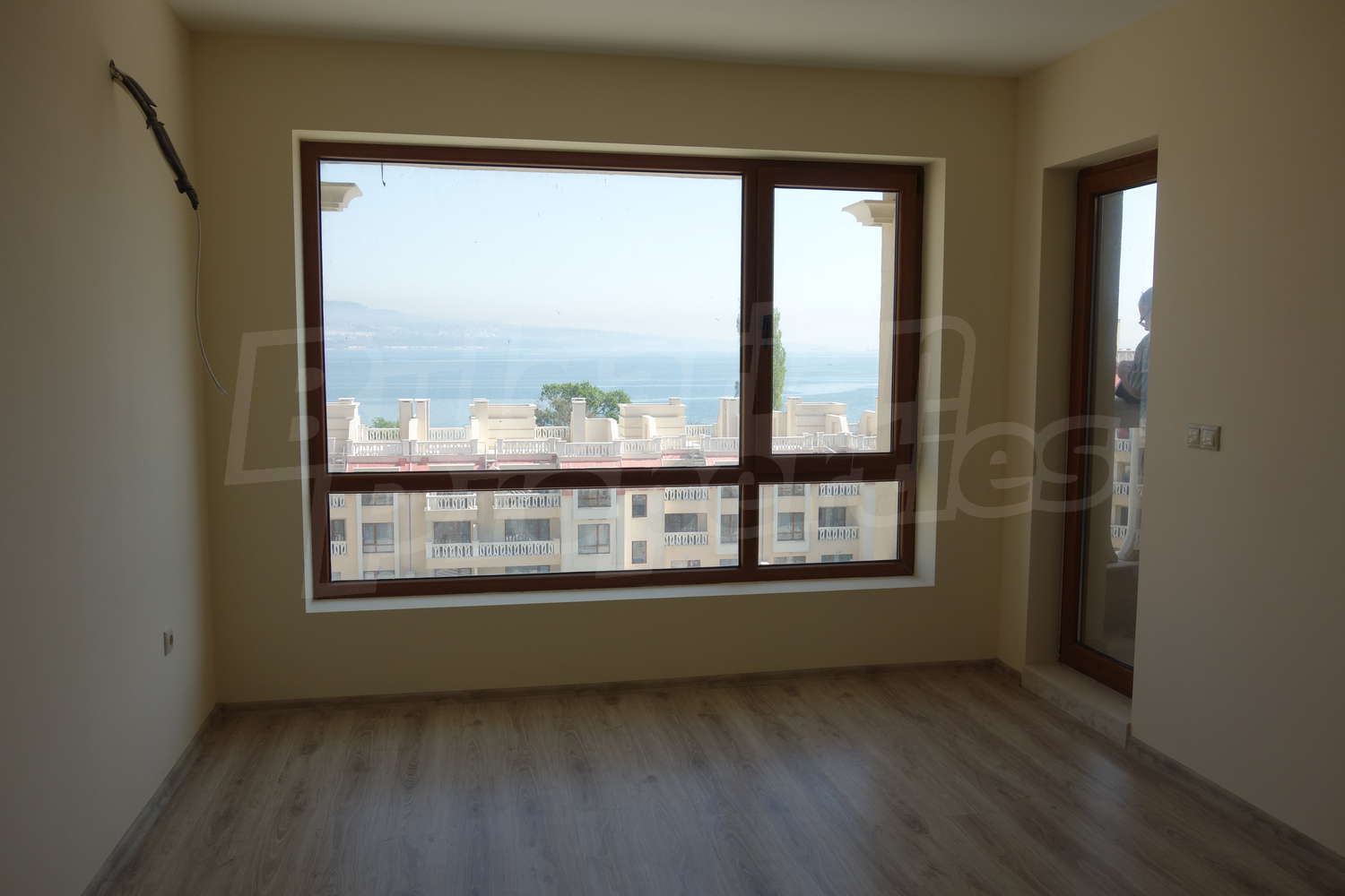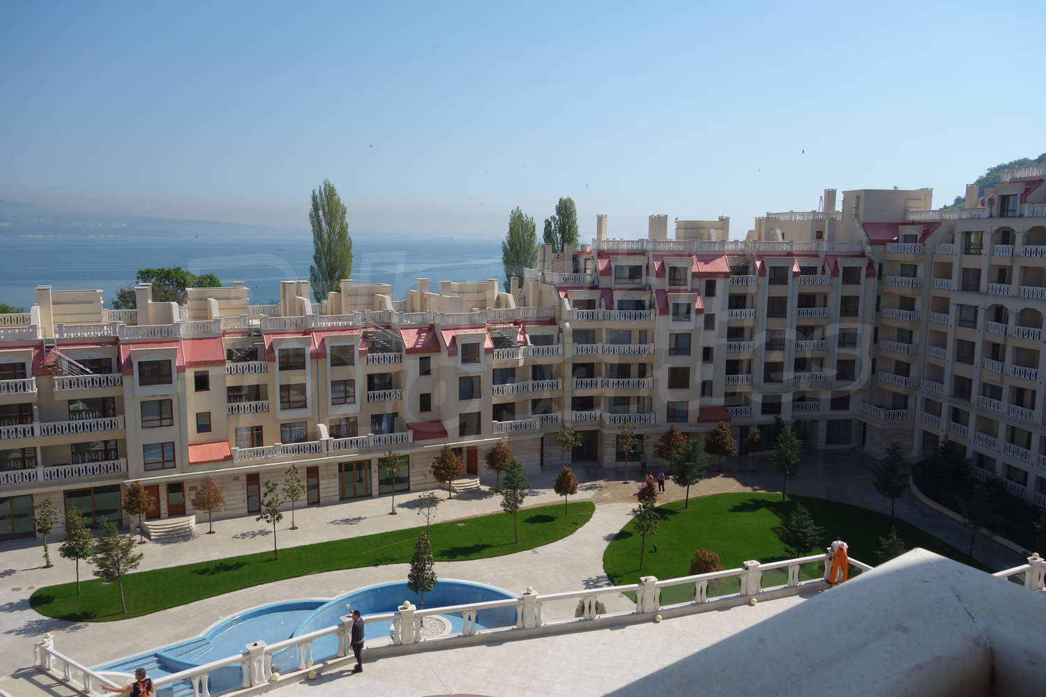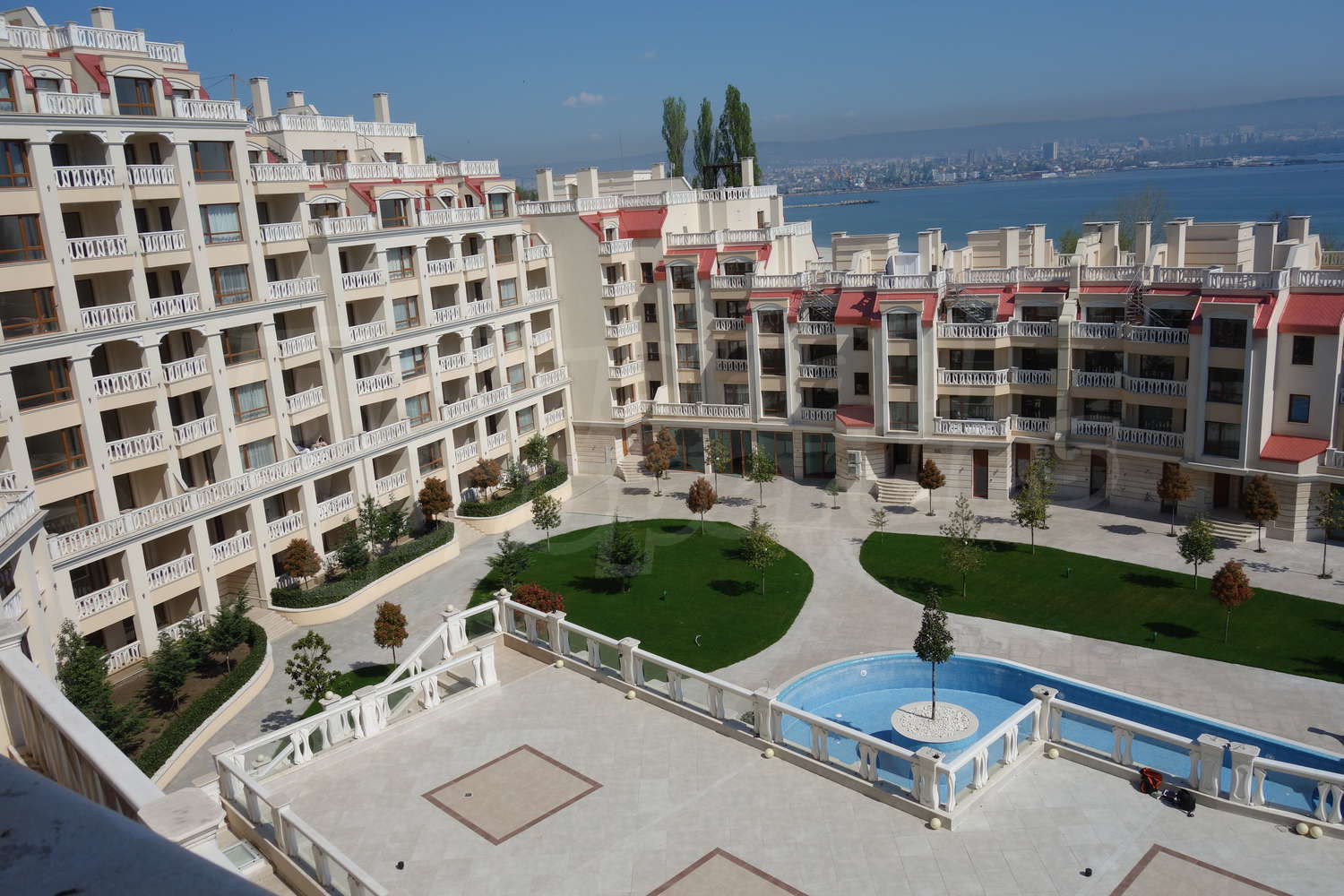 Двустаен апартамент с уникална гледка към Варненския залив и подземно паркомясто към него. Апартаментът е с площ от 76.66 кв.м. и е разположен на пети етаж от общо девет в най-добрата секция на комплекса, разположена фронтално срещу плажа и морето (първа линия). Имотът се продава завършен до ключ с качествени настилки и напълно готова и оборудвана баня.