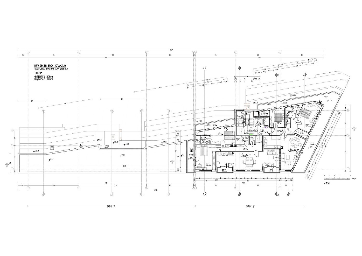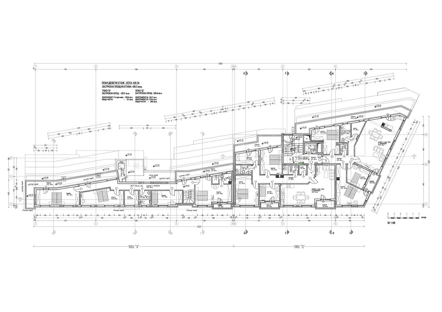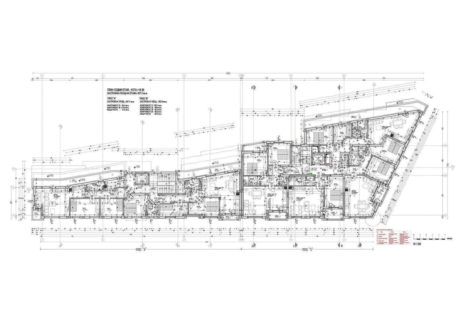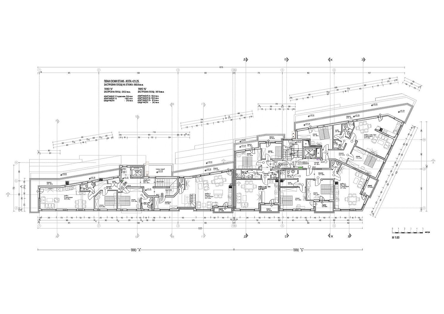 Сградата разполага с два подземни етажа, където ще са разположени паркоместа и гаражи, единадесет надземни етажа, като на етаж 1 и част от етаж 2 ще са офиси и магазини.
