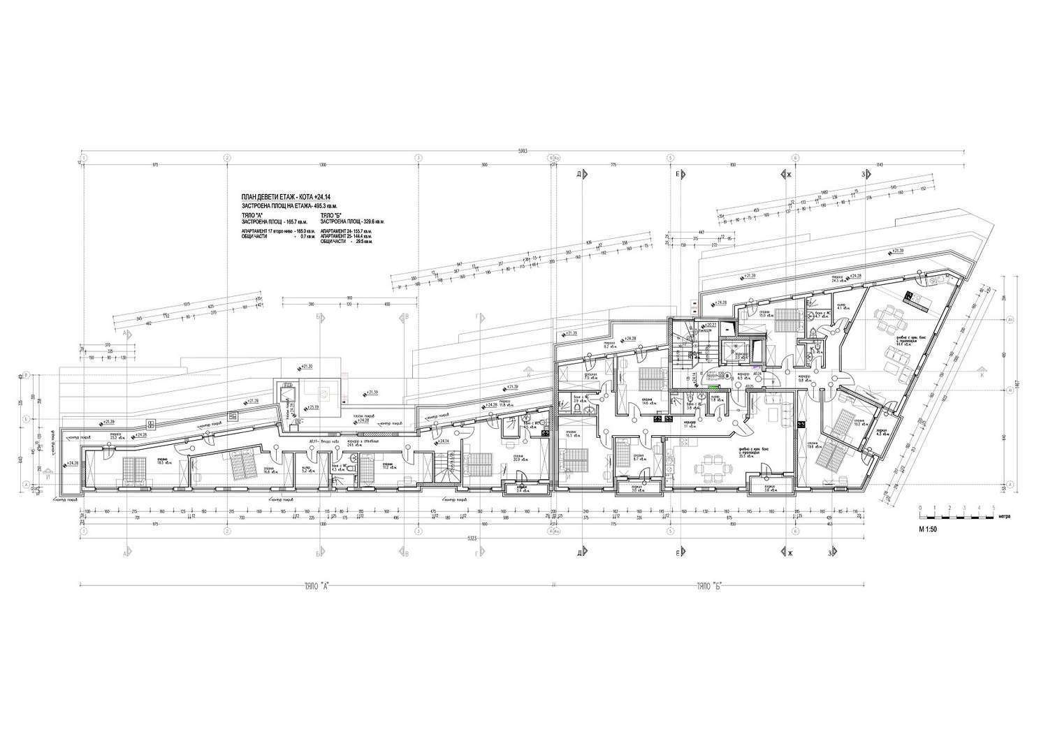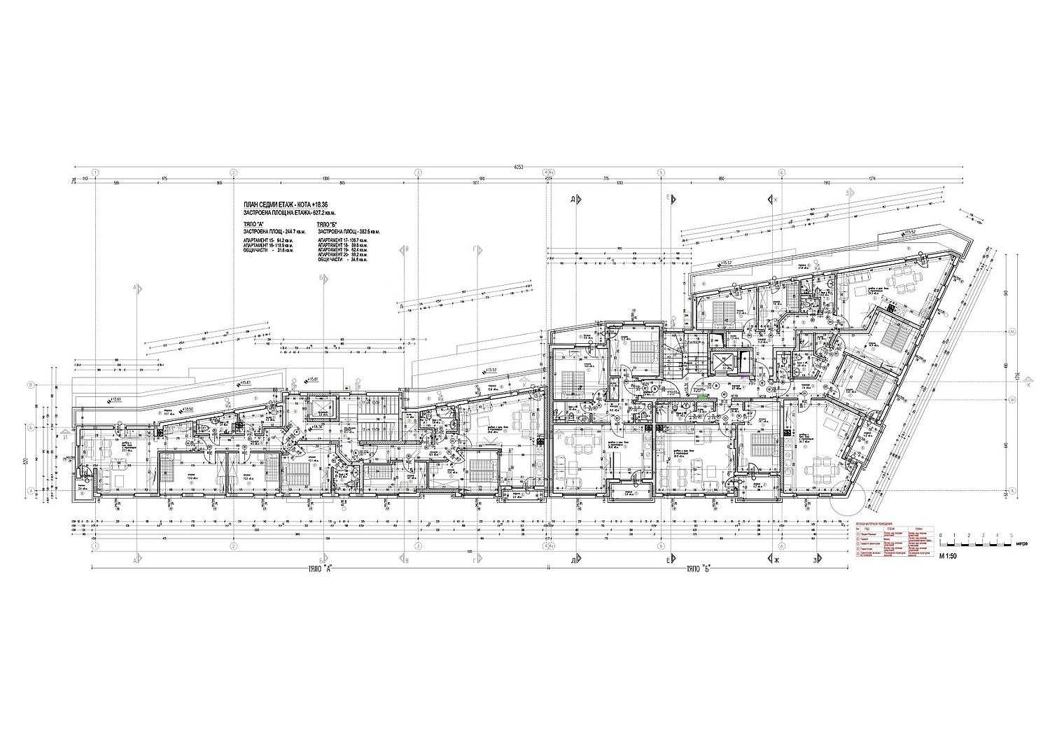 Сградата разполага с два подземни етажа, където ще са разположени паркоместа и гаражи, единадесет надземни етажа, като на етаж 1 и част от етаж 2 ще са офиси и магазини.