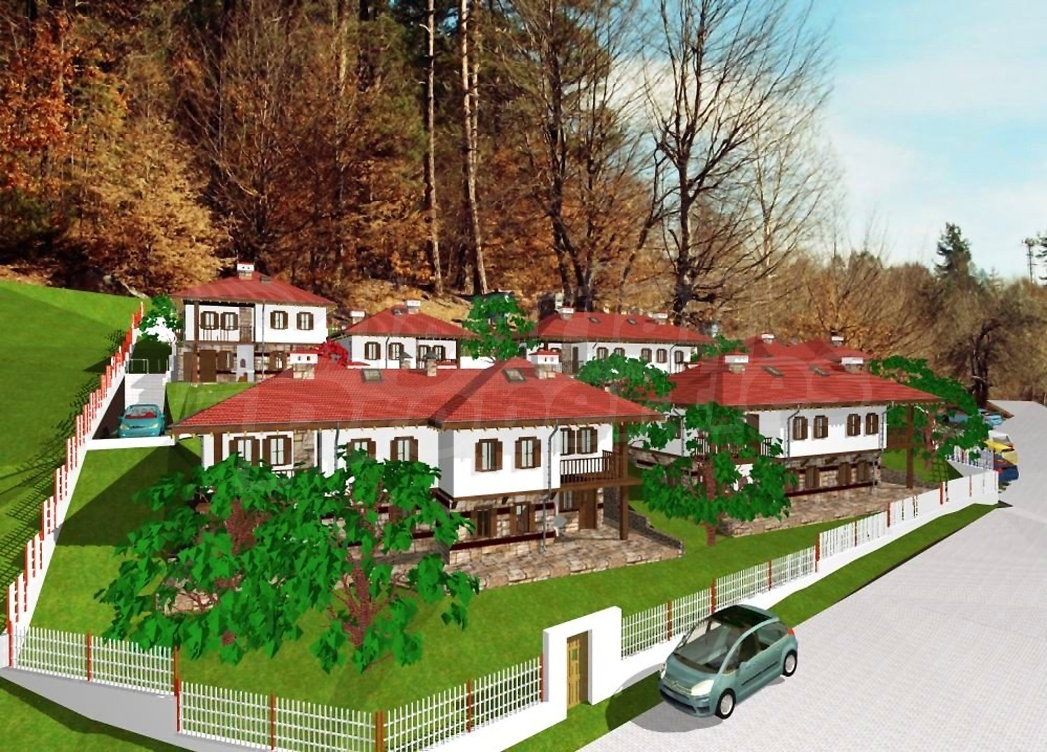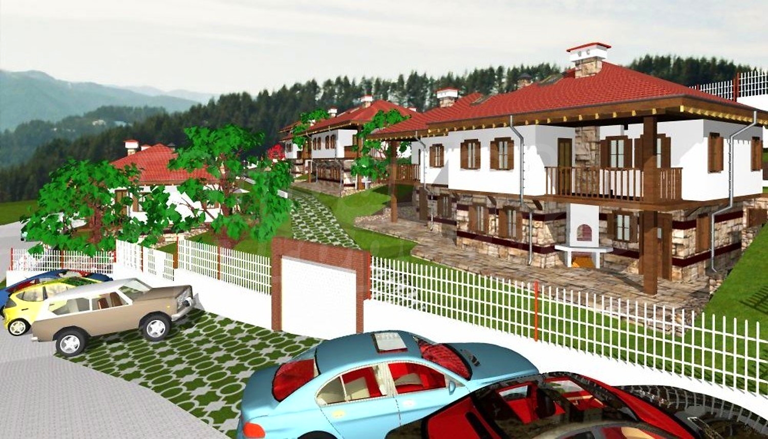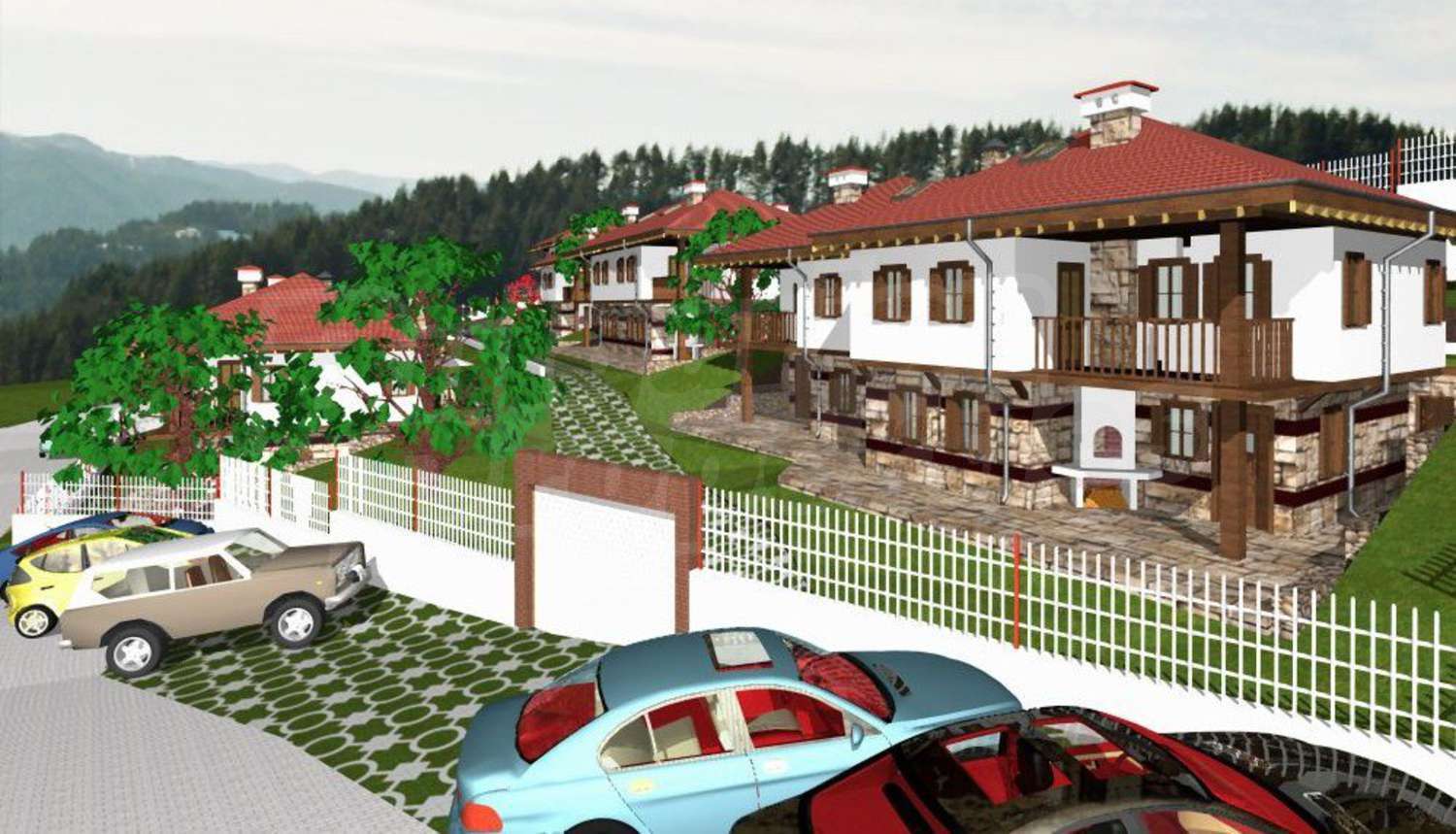 Проектирани са десет еднофамилни, типови къщи, съединени в пет двойки сгради – огледални близнаци. Типовите къщи са двуетажни със застроена площ 72.86 м2. Първият етаж съдържа дневна със столова и кухненски бокс на 41.00 м2 и WC с душ на 3.19м2. В ъгъла на северната страна на дневната има Г‐ образна дървена стълба към втория етаж. В предната част, към входа, е изградена камина. Под най-високата част на стълбата е вратата към вкопаното под земята помещение за склад за дърва, инструменти и отоплителните съоръжения на площ от 18.11 м2. Входът за къщата е в предната част на първия етаж, откъм празното пространство под чардака, където е предвидено външно огнище и място за почивка и външна маса. На втория етаж с обща площ 67.40 м2 имаме три спални, WC с вана и душ от 5.35 м2 и чардак на площ 9.82м2.