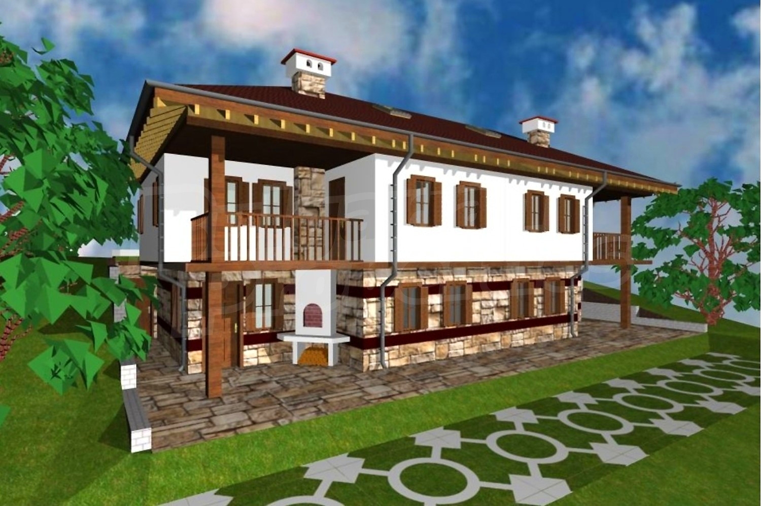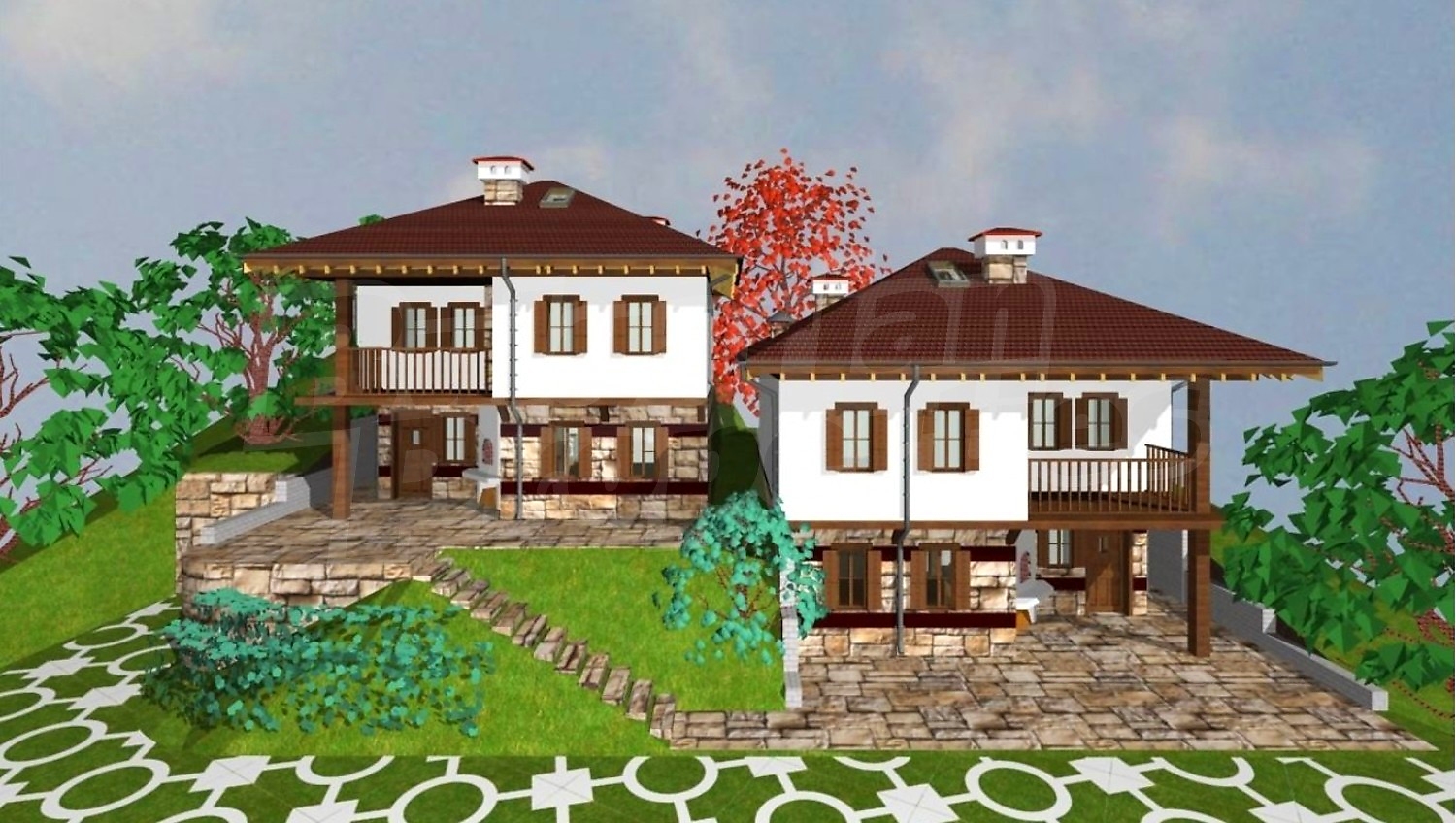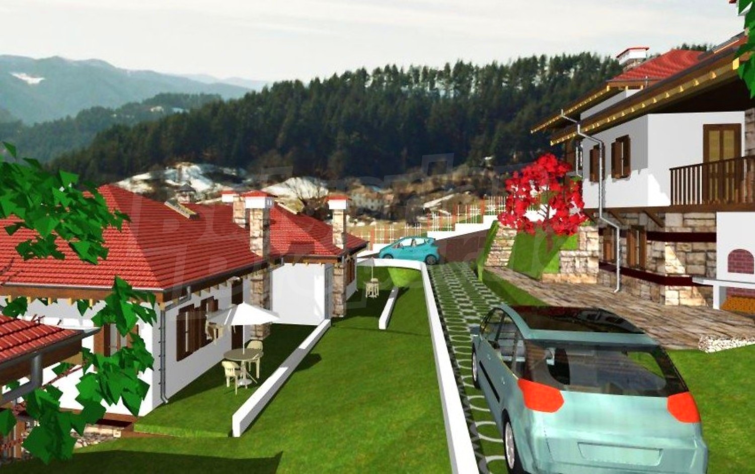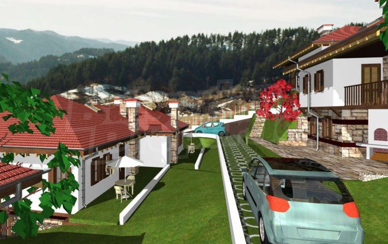Проектирани са десет еднофамилни, типови къщи, съединени в пет двойки сгради – огледални близнаци. Типовите къщи са двуетажни със застроена площ 72.86 м2. Първият етаж съдържа дневна със столова и кухненски бокс на 41.00 м2 и WC с душ на 3.19м2. В ъгъла на северната страна на дневната има Г‐ образна дървена стълба към втория етаж. В предната част, към входа, е изградена камина. Под най-високата част на стълбата е вратата към вкопаното под земята помещение за склад за дърва, инструменти и отоплителните съоръжения на площ от 18.11 м2. Входът за къщата е в предната част на първия етаж, откъм празното пространство под чардака, където е предвидено външно огнище и място за почивка и външна маса. На втория етаж с обща площ 67.40 м2 имаме три спални, WC с вана и душ от 5.35 м2 и чардак на площ 9.82м2.