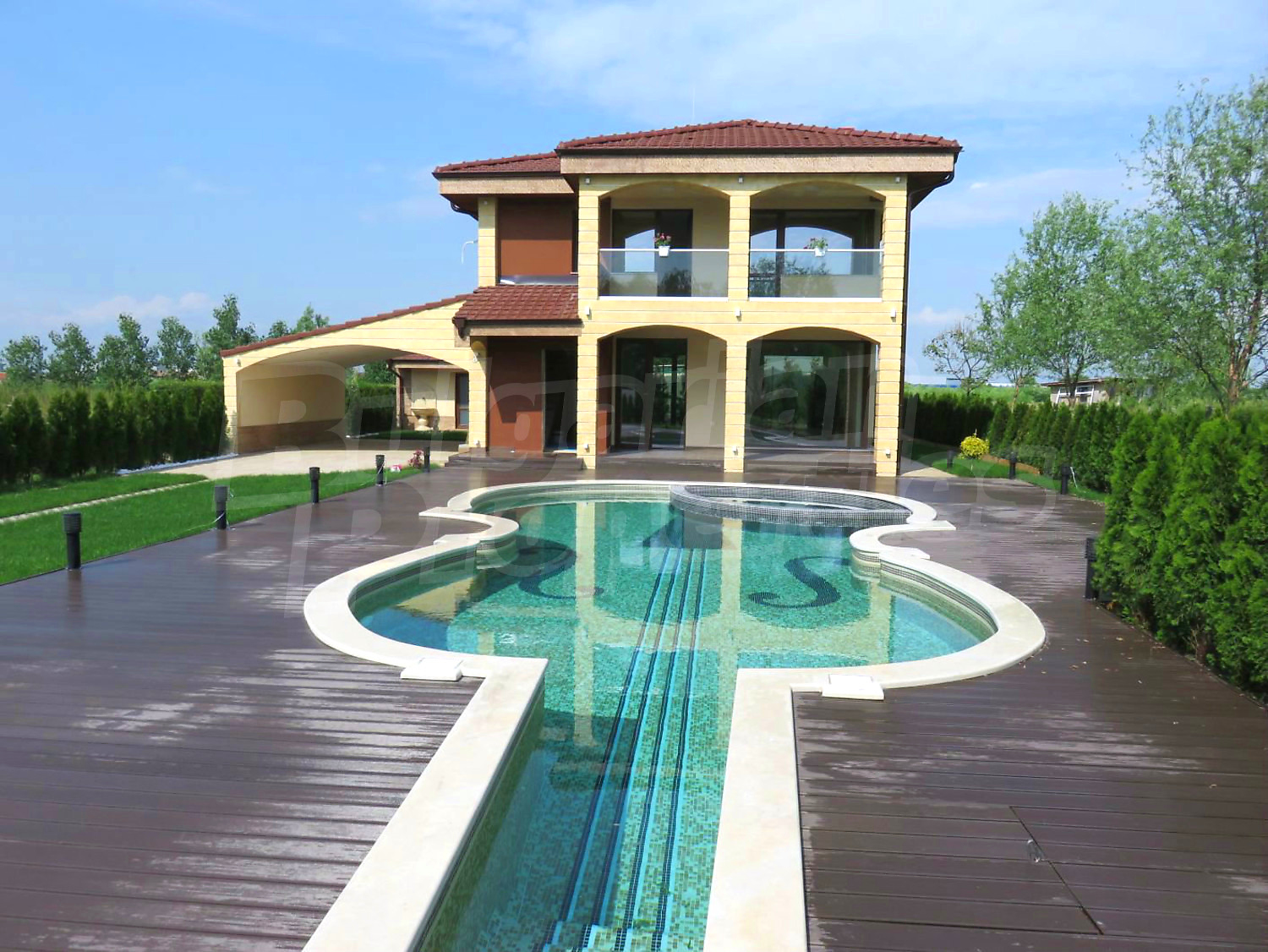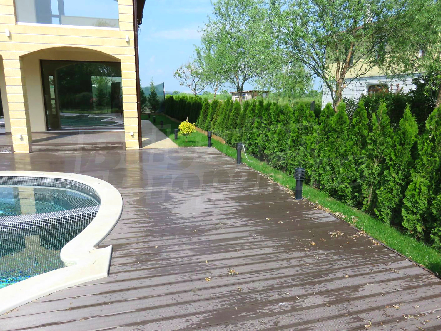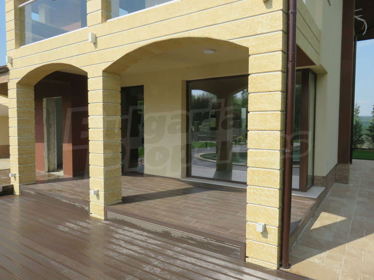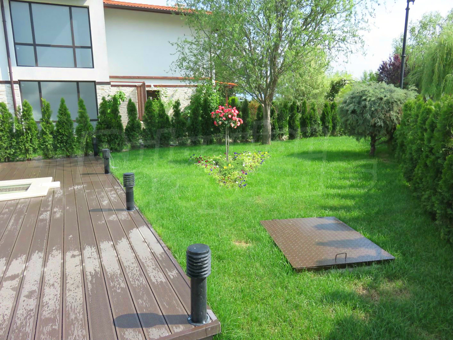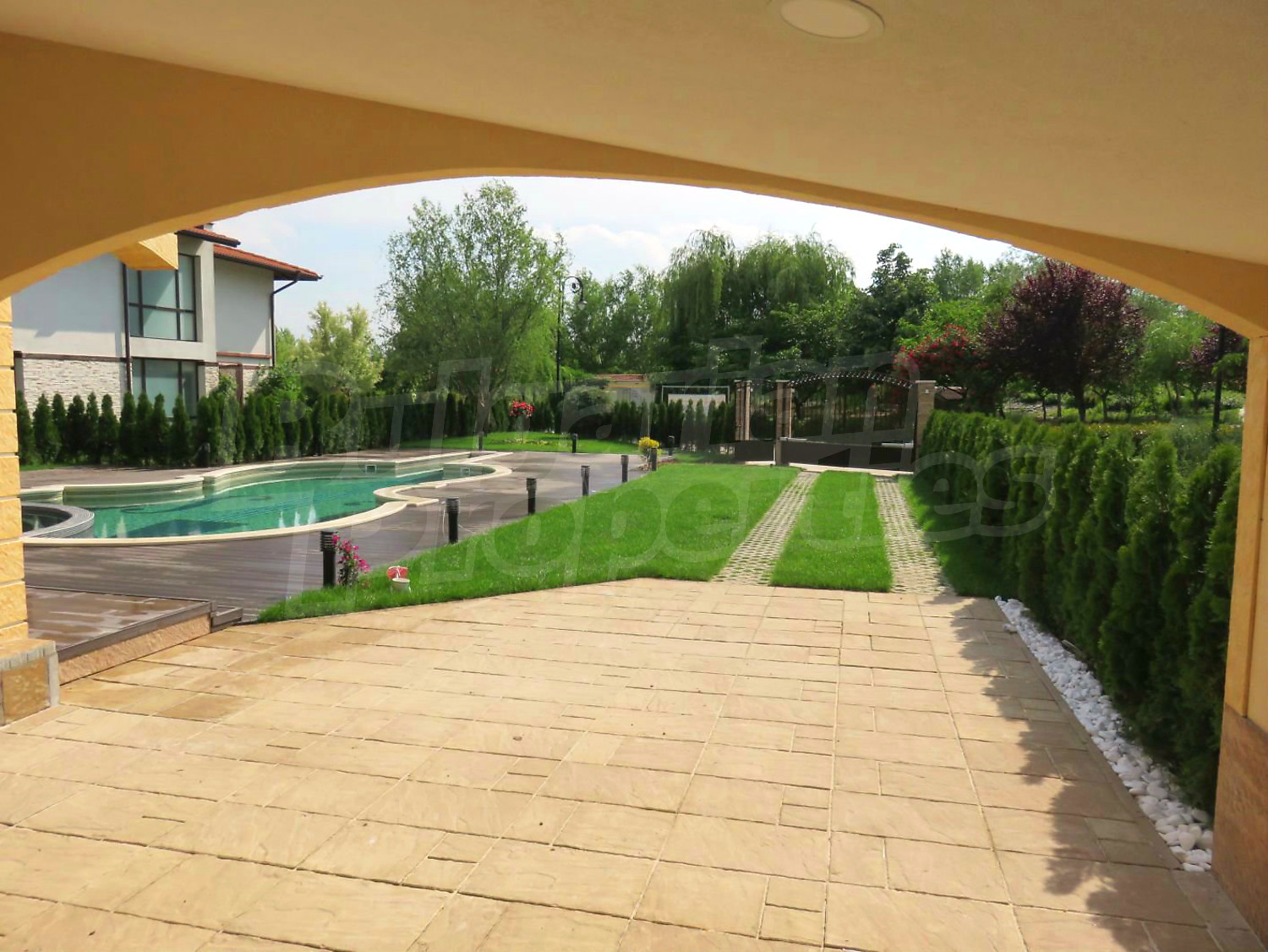 Луксозният имот е проектиран с цел да създаде удобство, уют и спокойствие, като същевременно дава възможност за много различни дизайнерски решения при интериорното завършване. Дворната част е покрита с настилка от павета SEMMELROCK, а около басейна - с Decking.