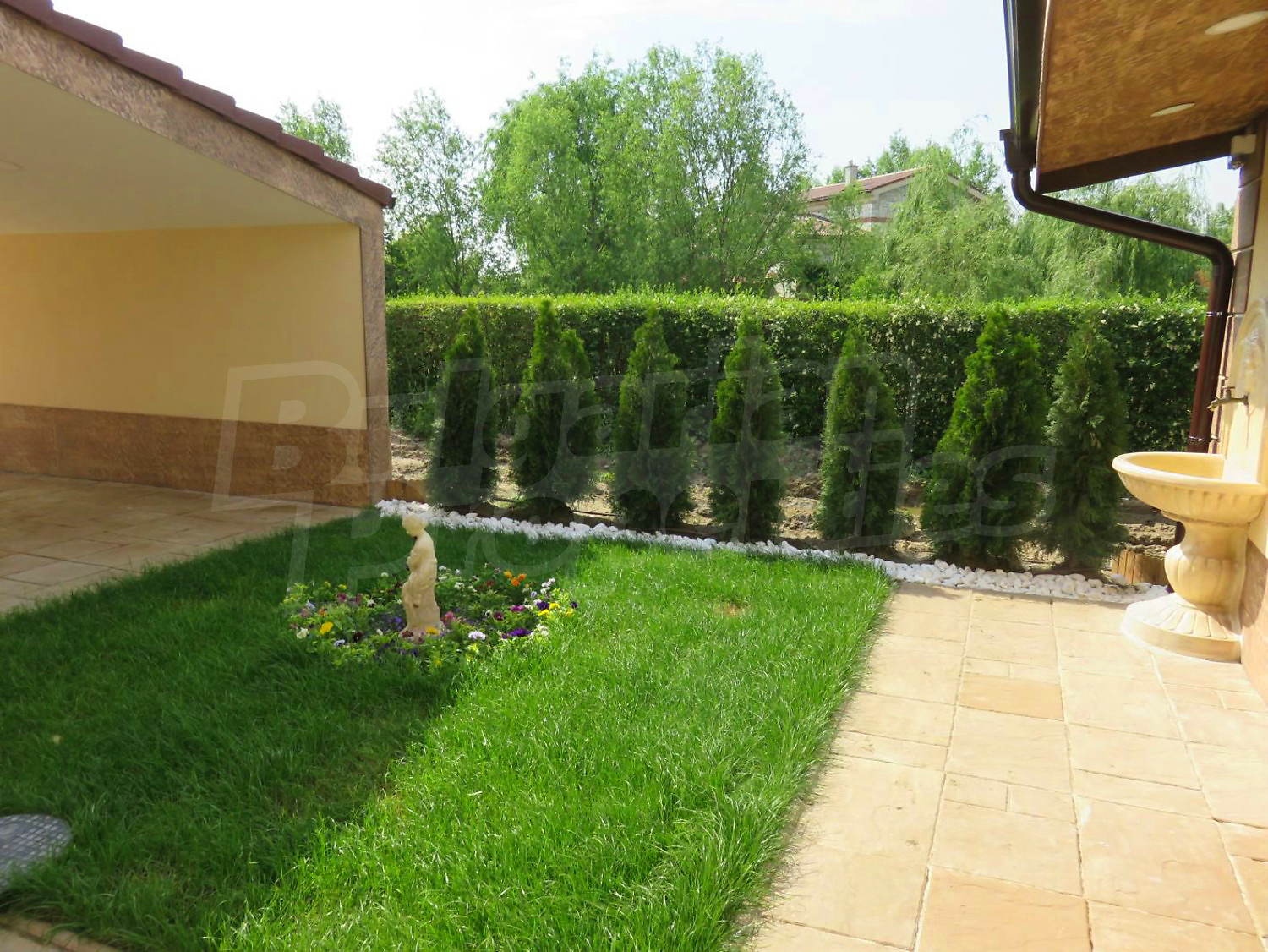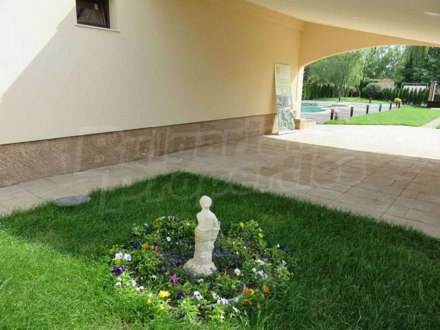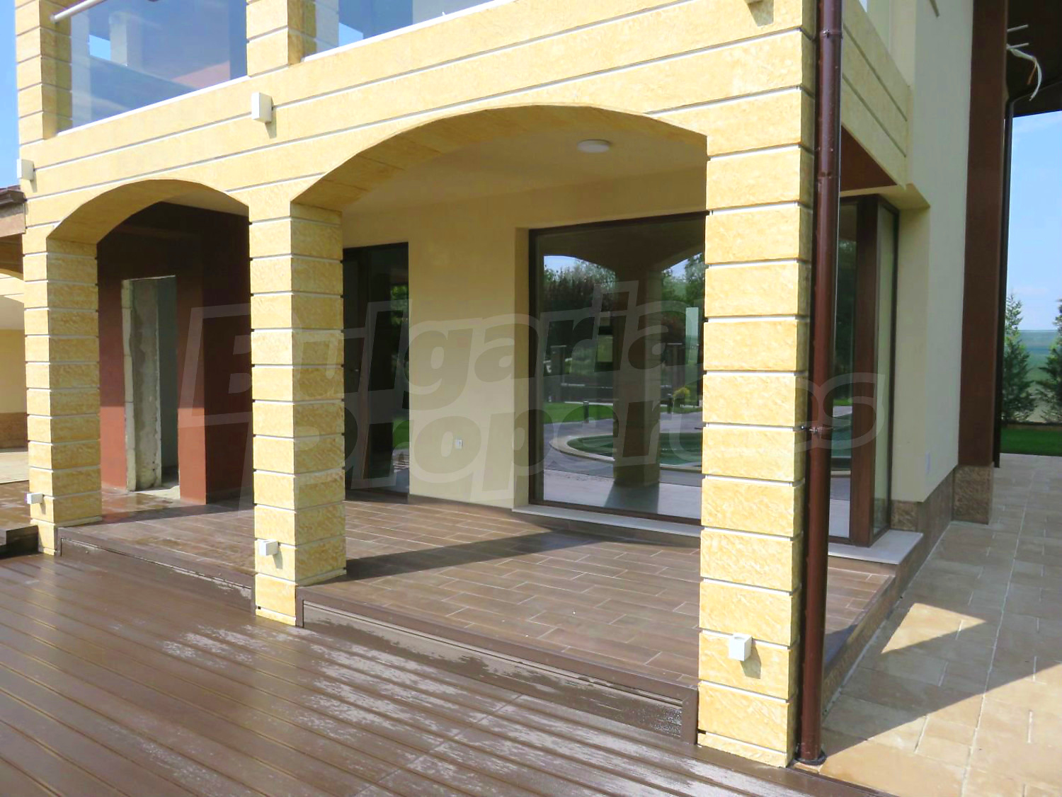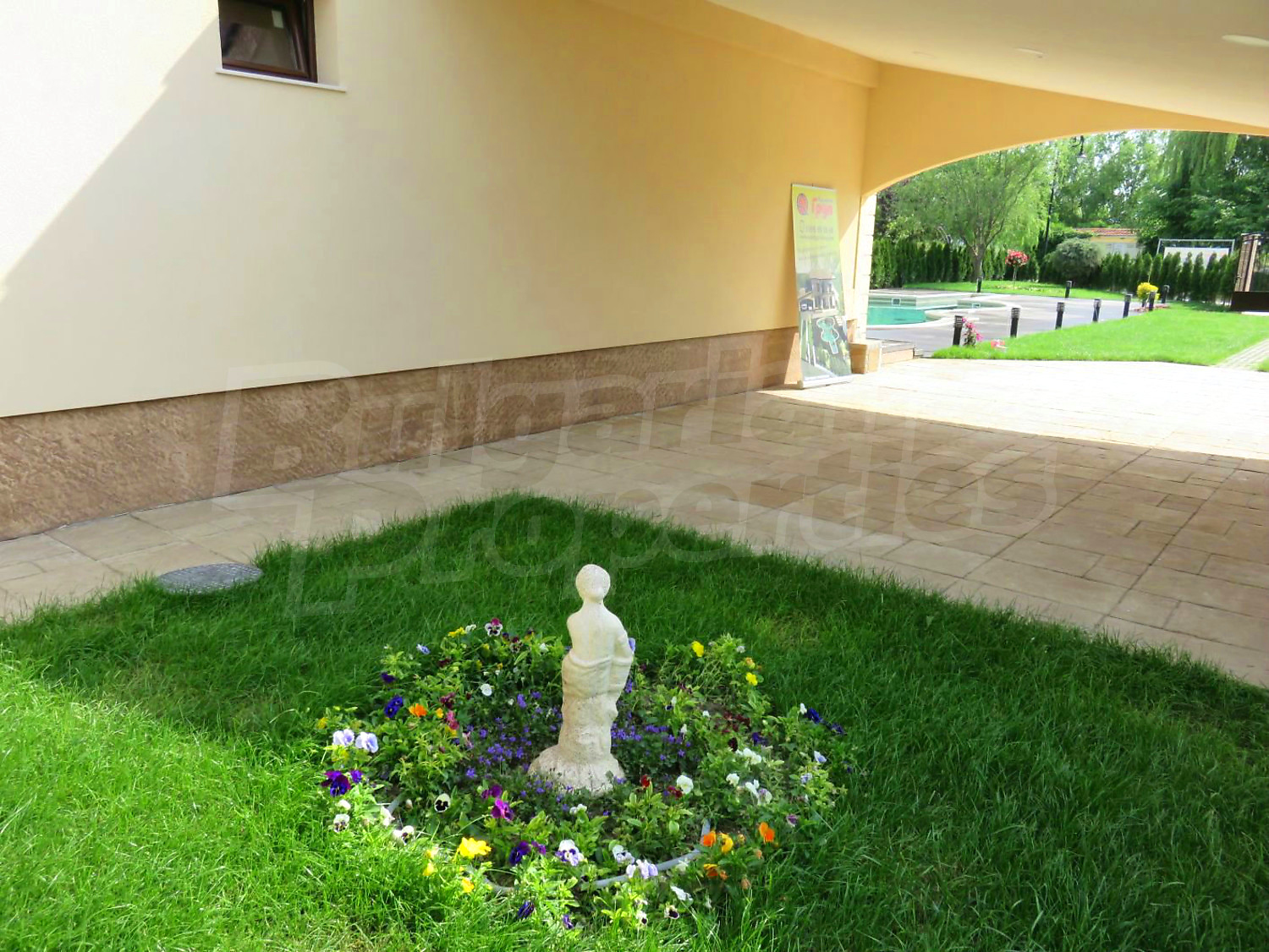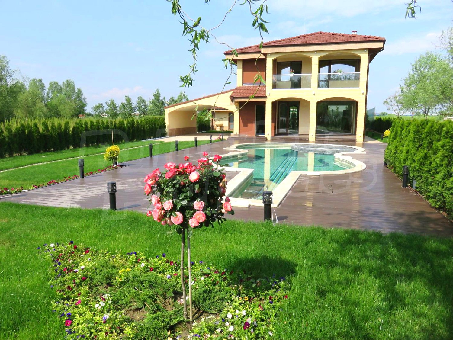 Луксозният имот е проектиран с цел да създаде удобство, уют и спокойствие, като същевременно дава възможност за много различни дизайнерски решения при интериорното завършване. Дворната част е покрита с настилка от павета SEMMELROCK, а около басейна - с Decking.