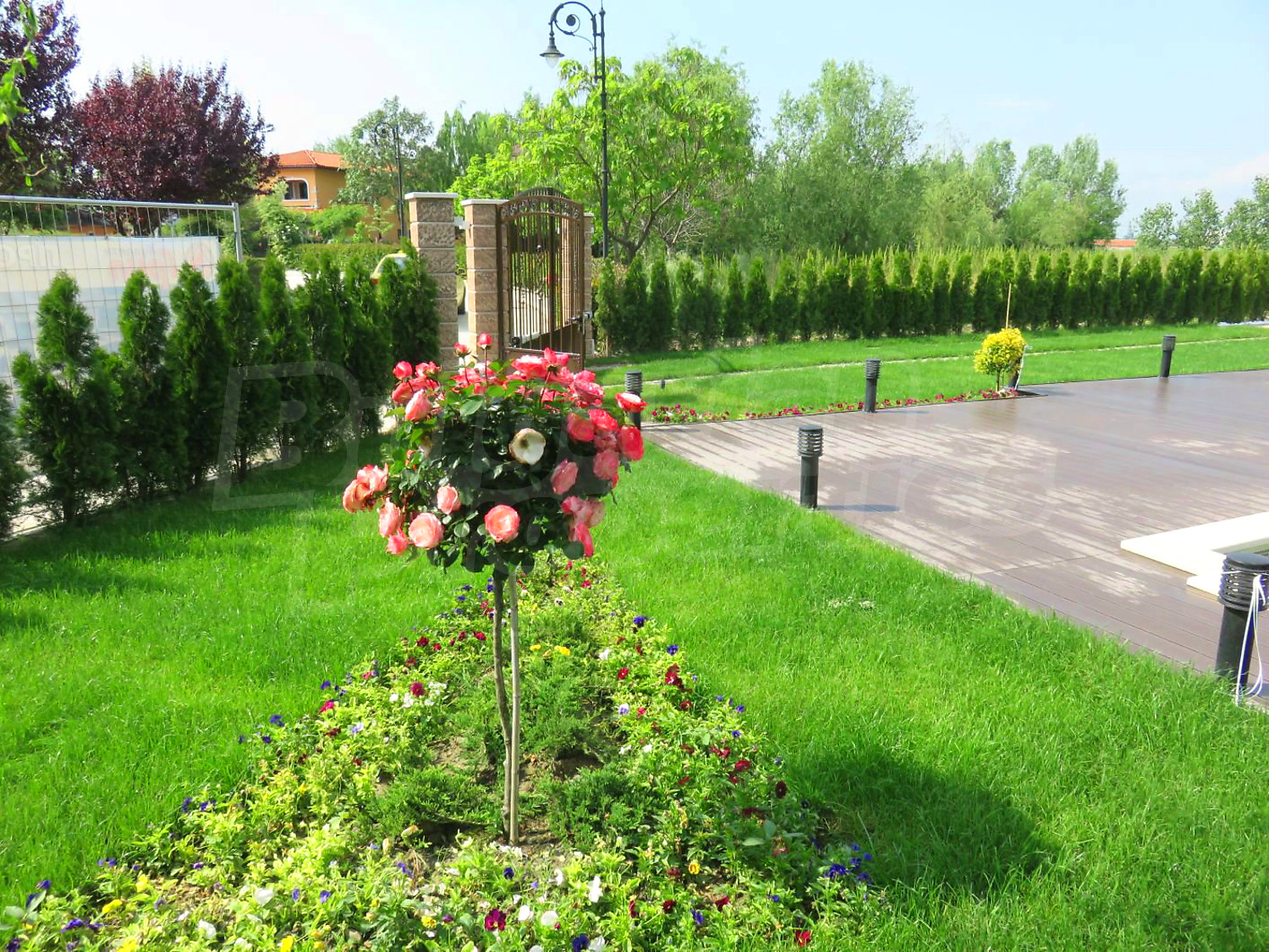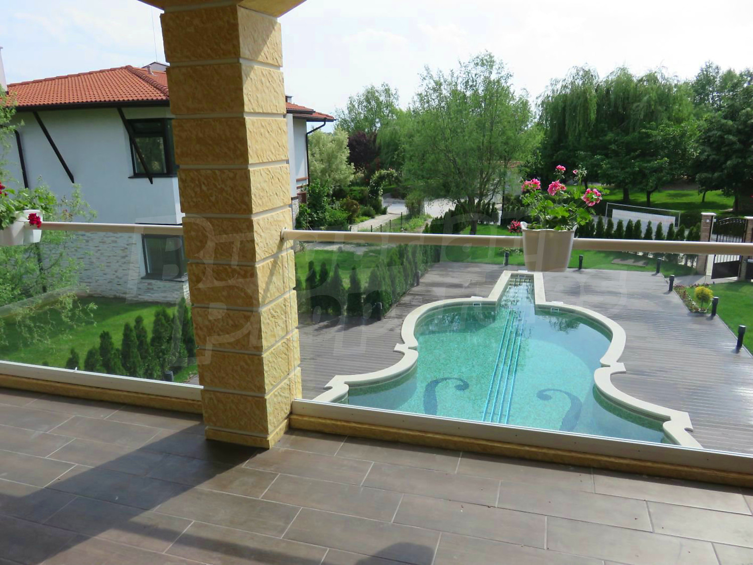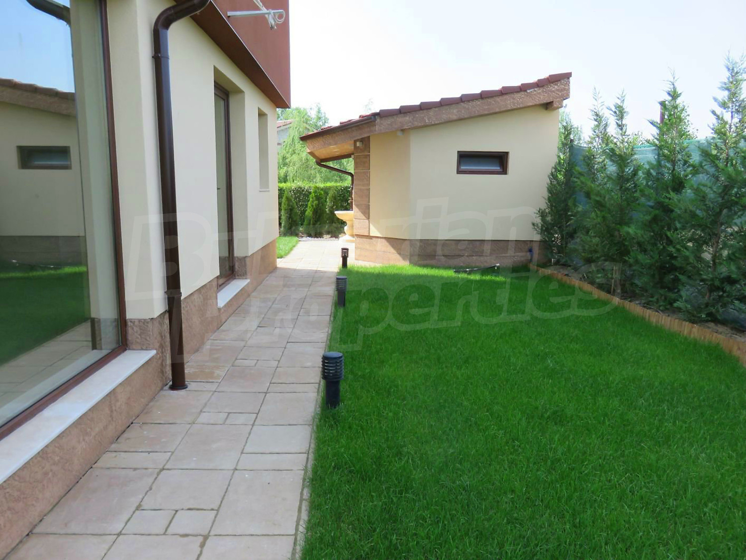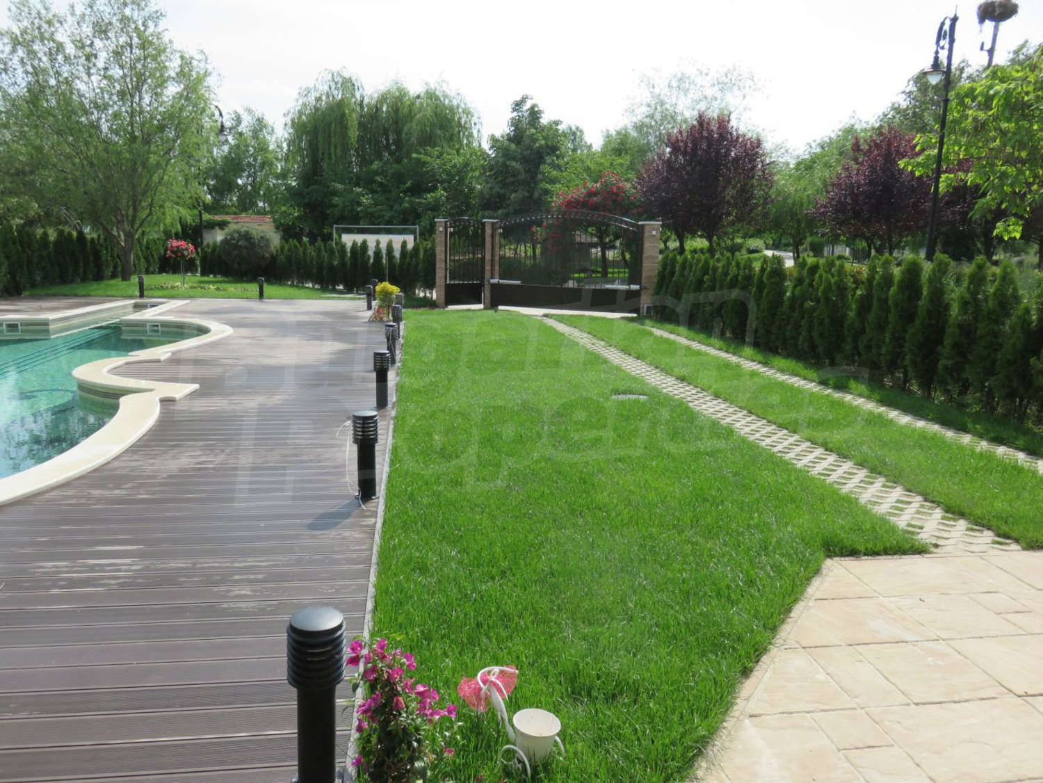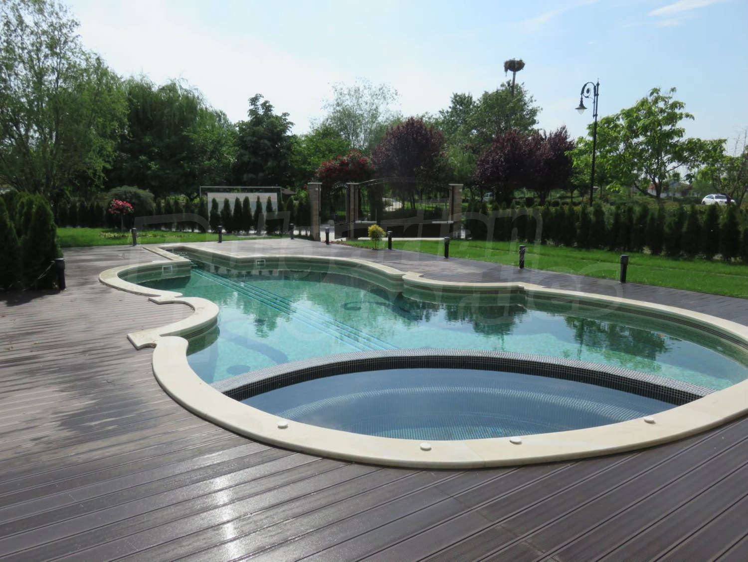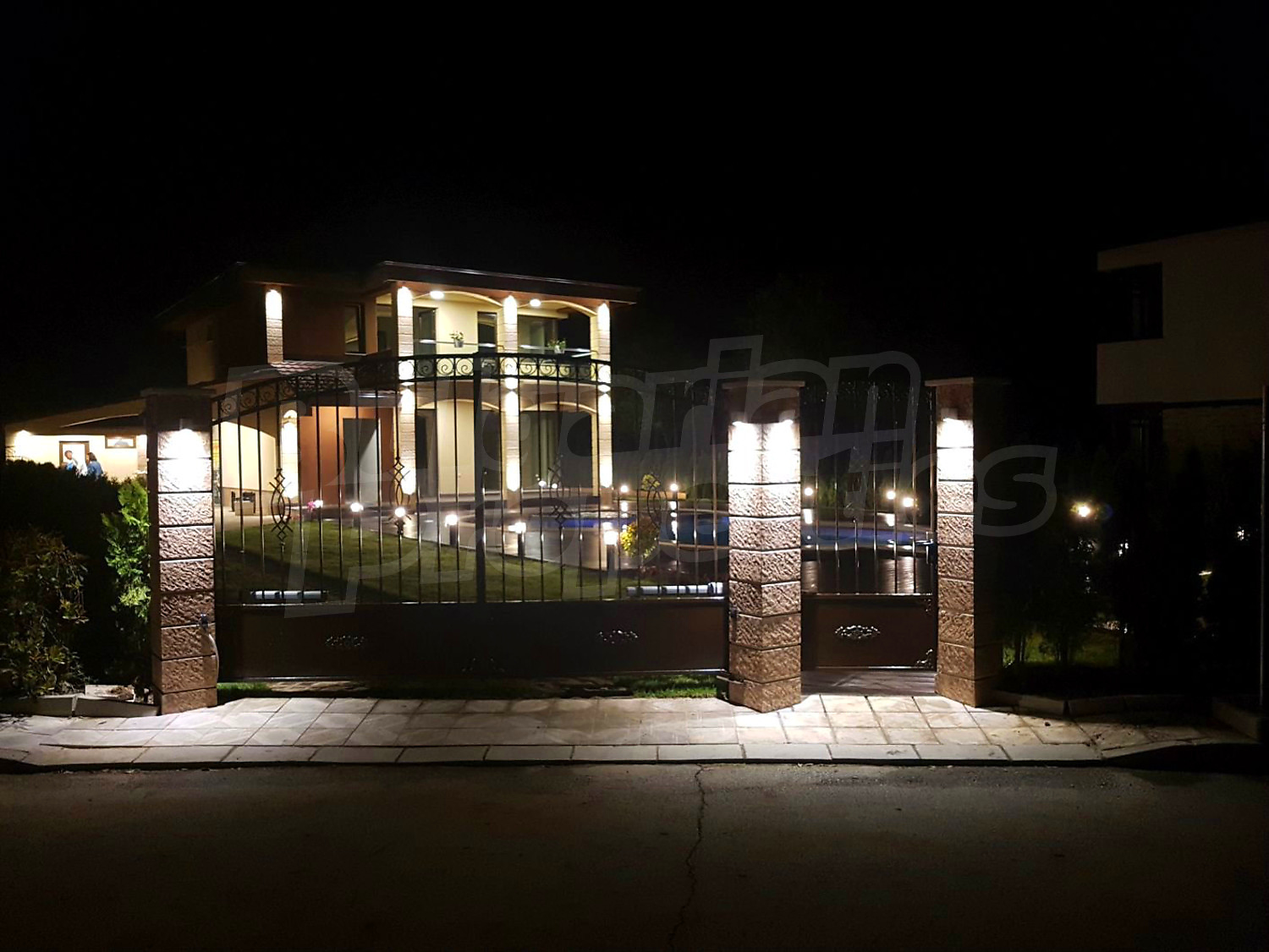 Луксозният имот е проектиран с цел да създаде удобство, уют и спокойствие, като същевременно дава възможност за много различни дизайнерски решения при интериорното завършване. Дворната част е покрита с настилка от павета SEMMELROCK, а около басейна - с Decking.