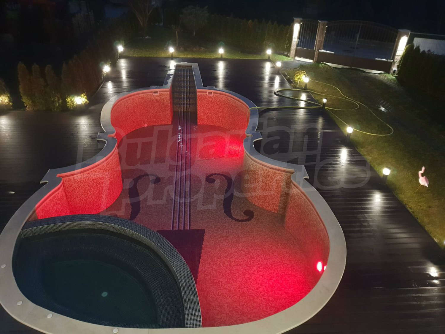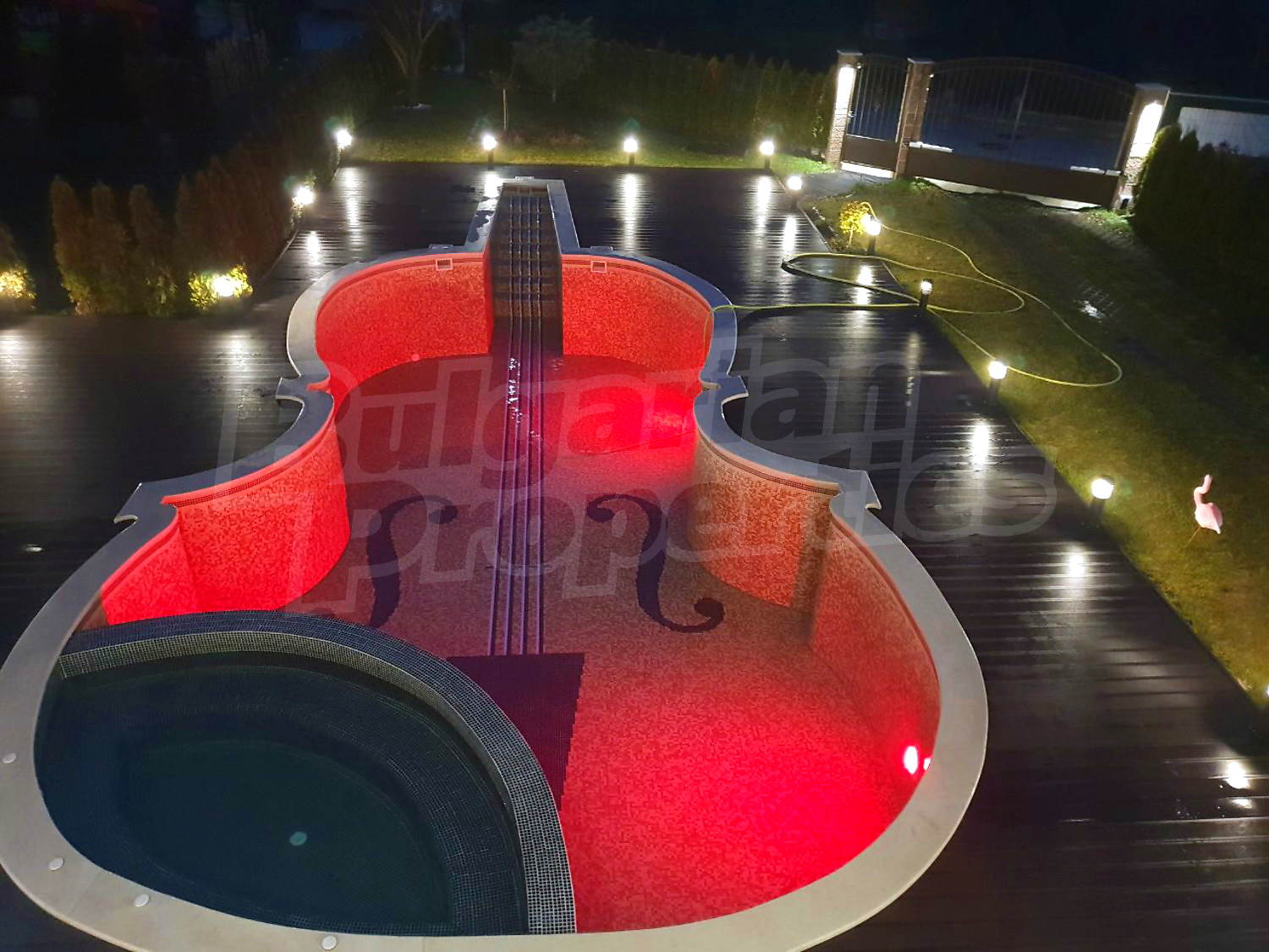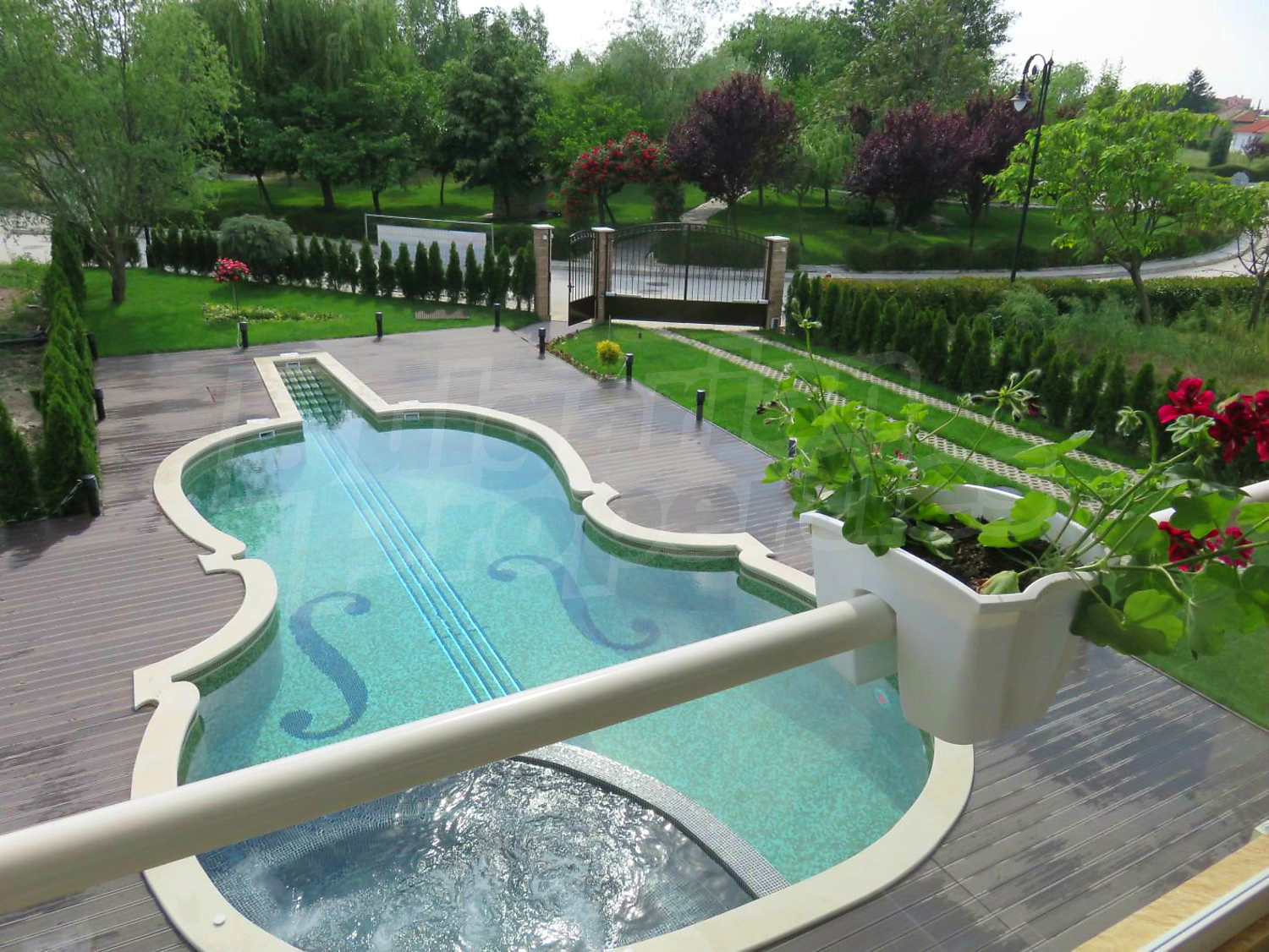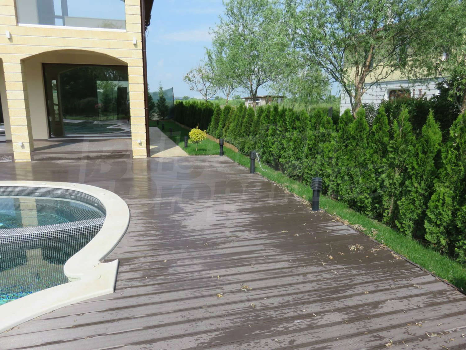 В двора има отопляем басейн с джакузи, което дава възможност да се ползва целогодишно. Също така, инсталирана е сонда за вода, която може да се ползва както за поливната система, така и за басейна.