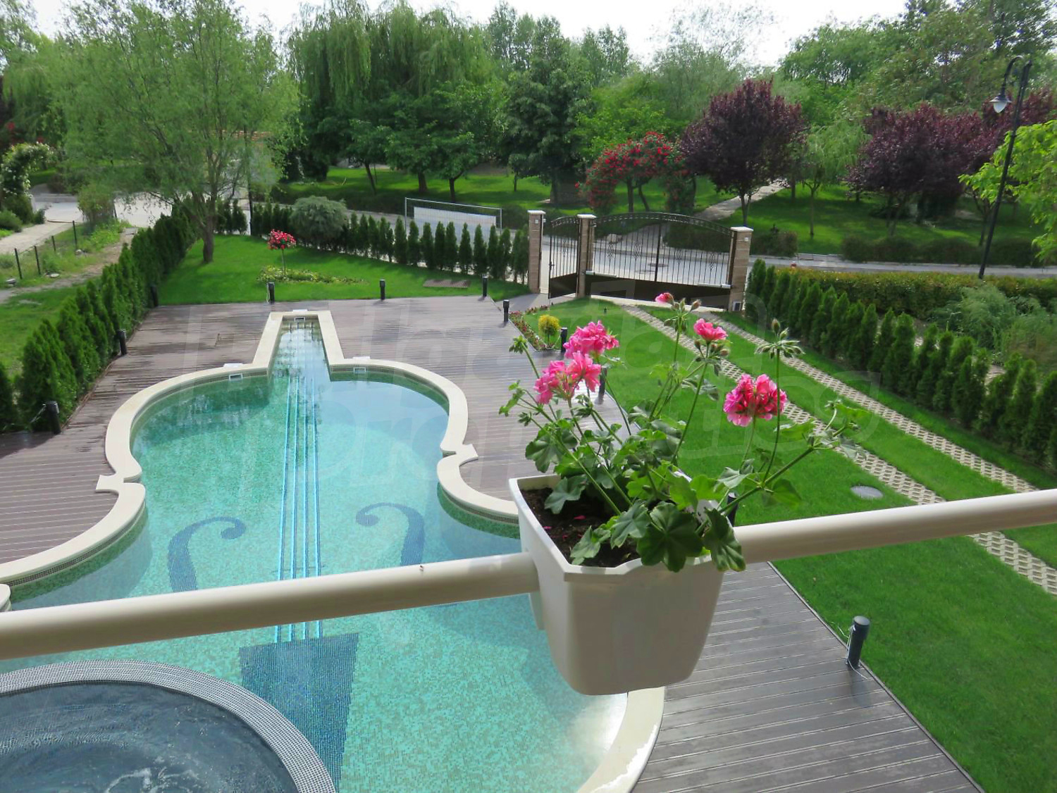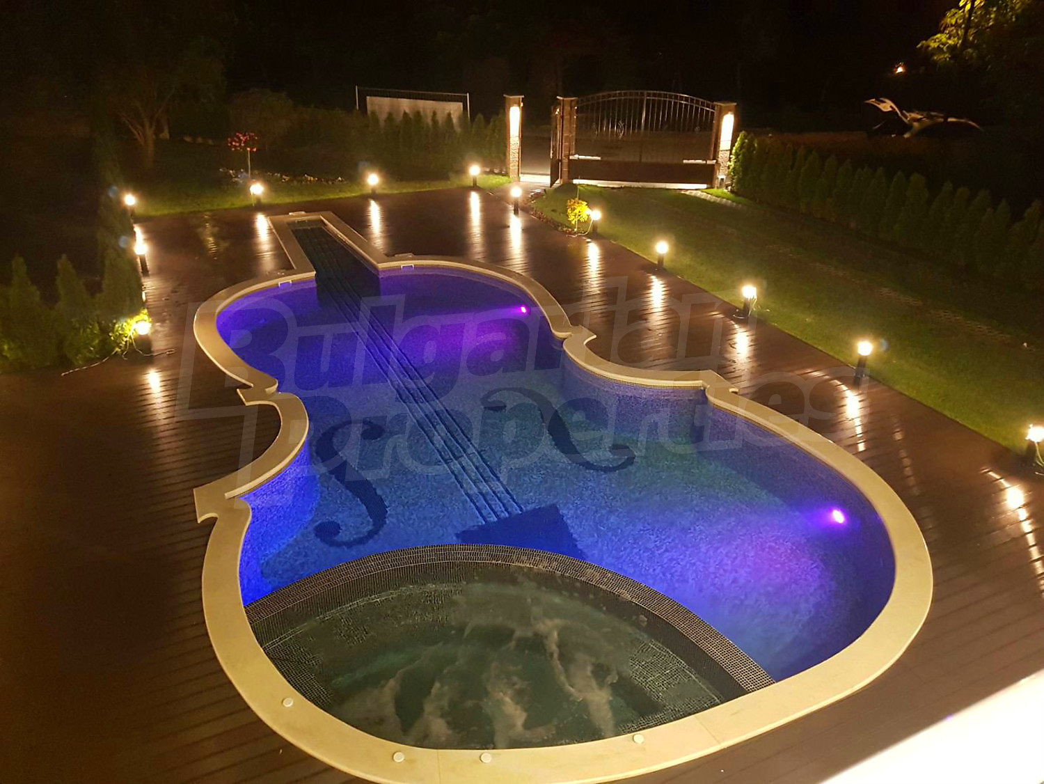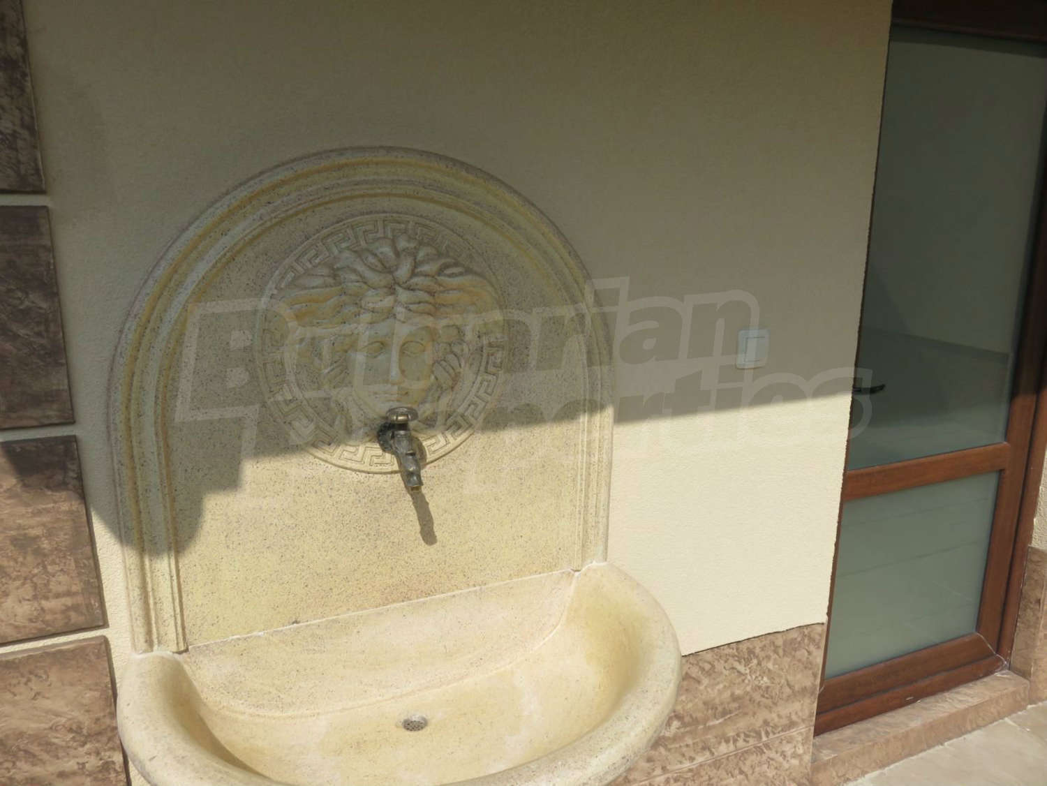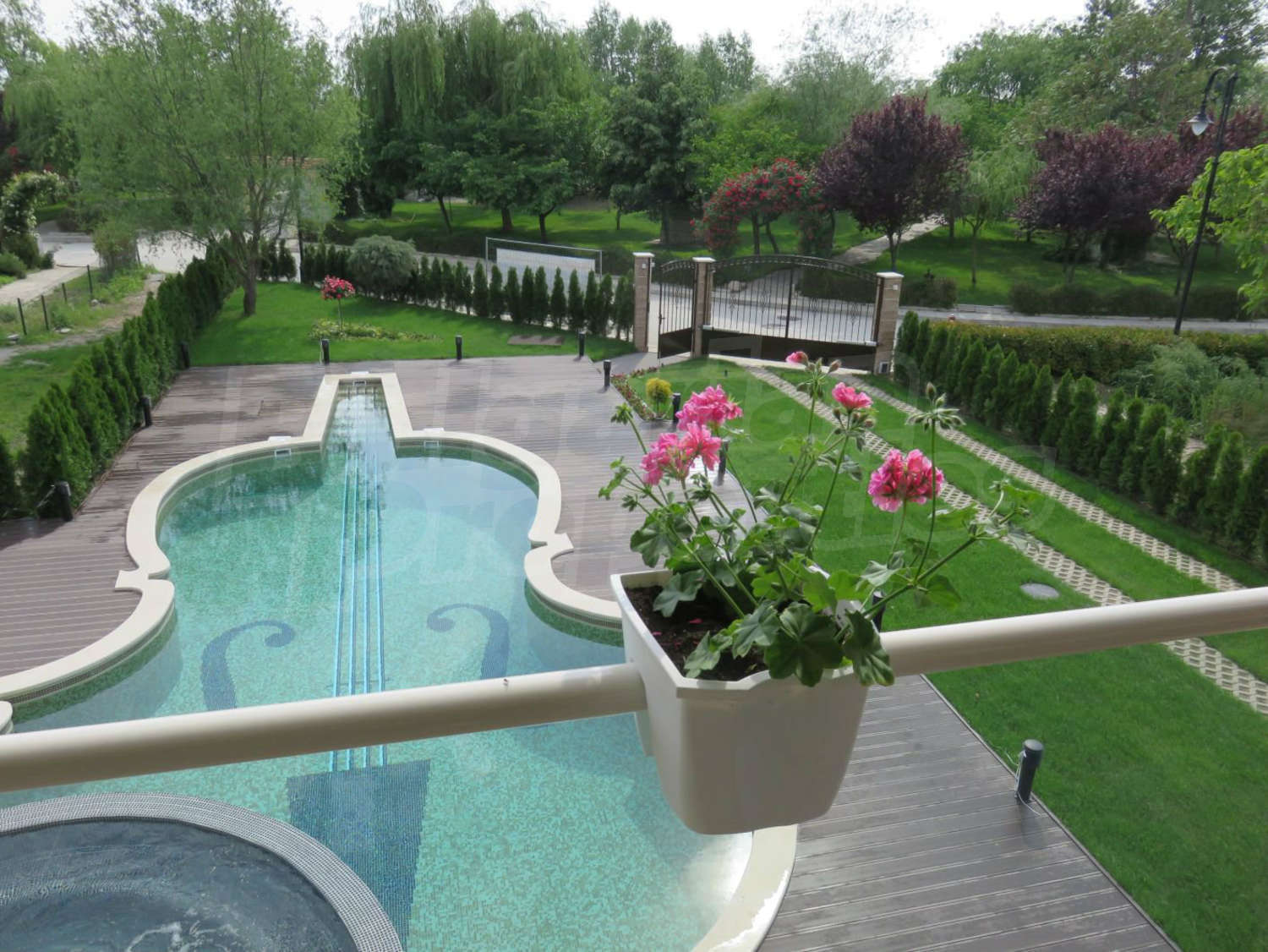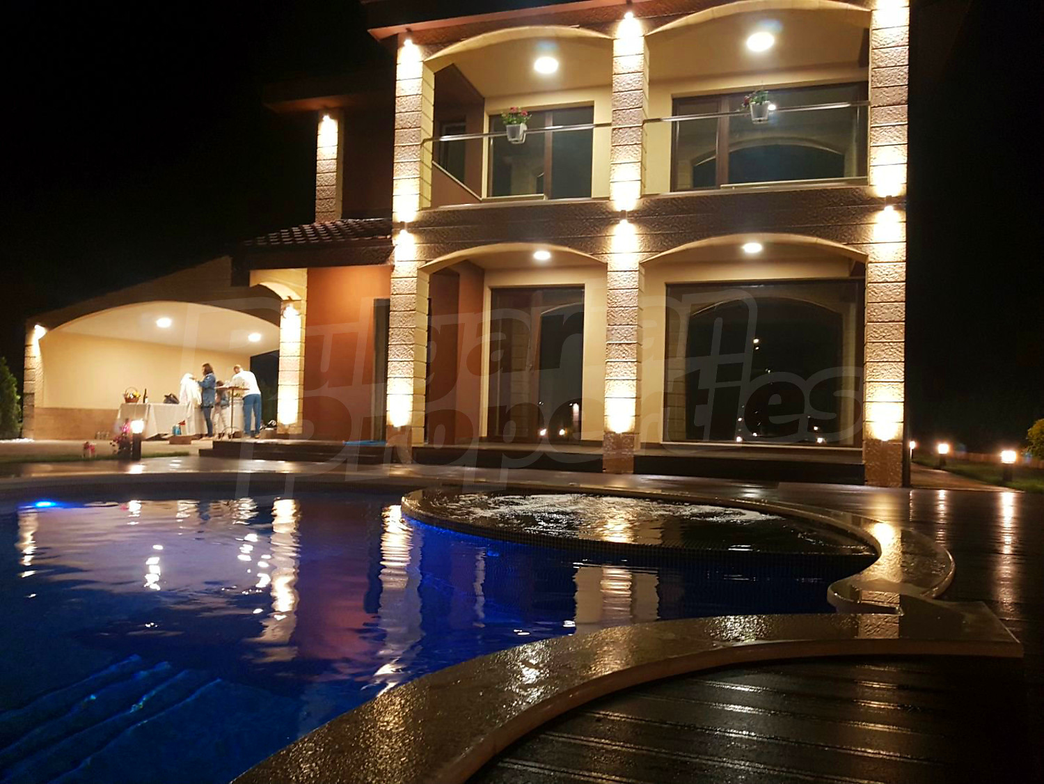 В двора има отопляем басейн с джакузи, което дава възможност да се ползва целогодишно. Също така, инсталирана е сонда за вода, която може да се ползва както за поливната система, така и за басейна.