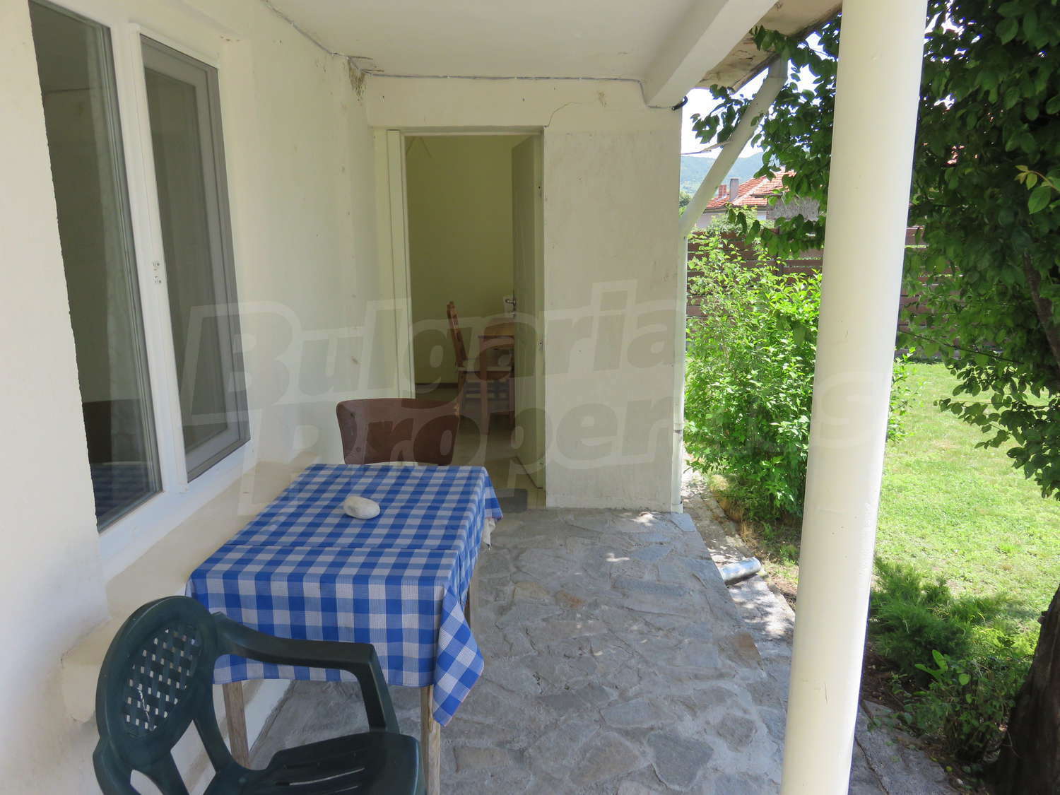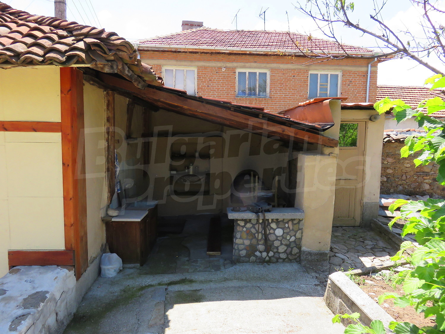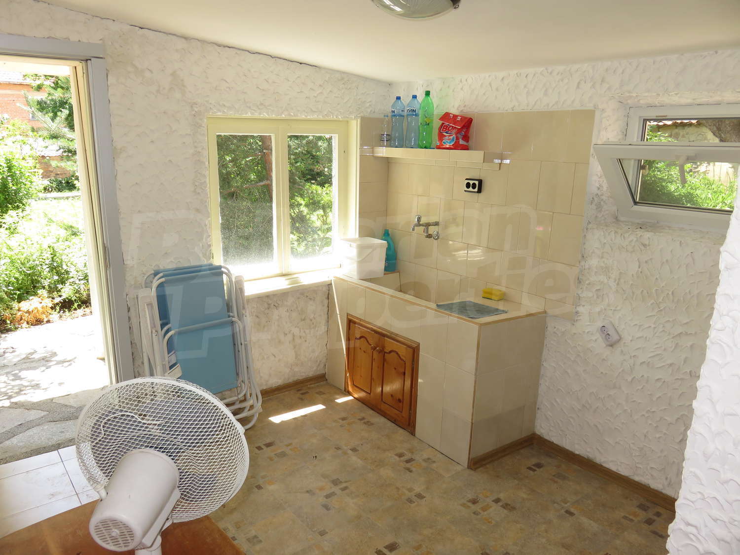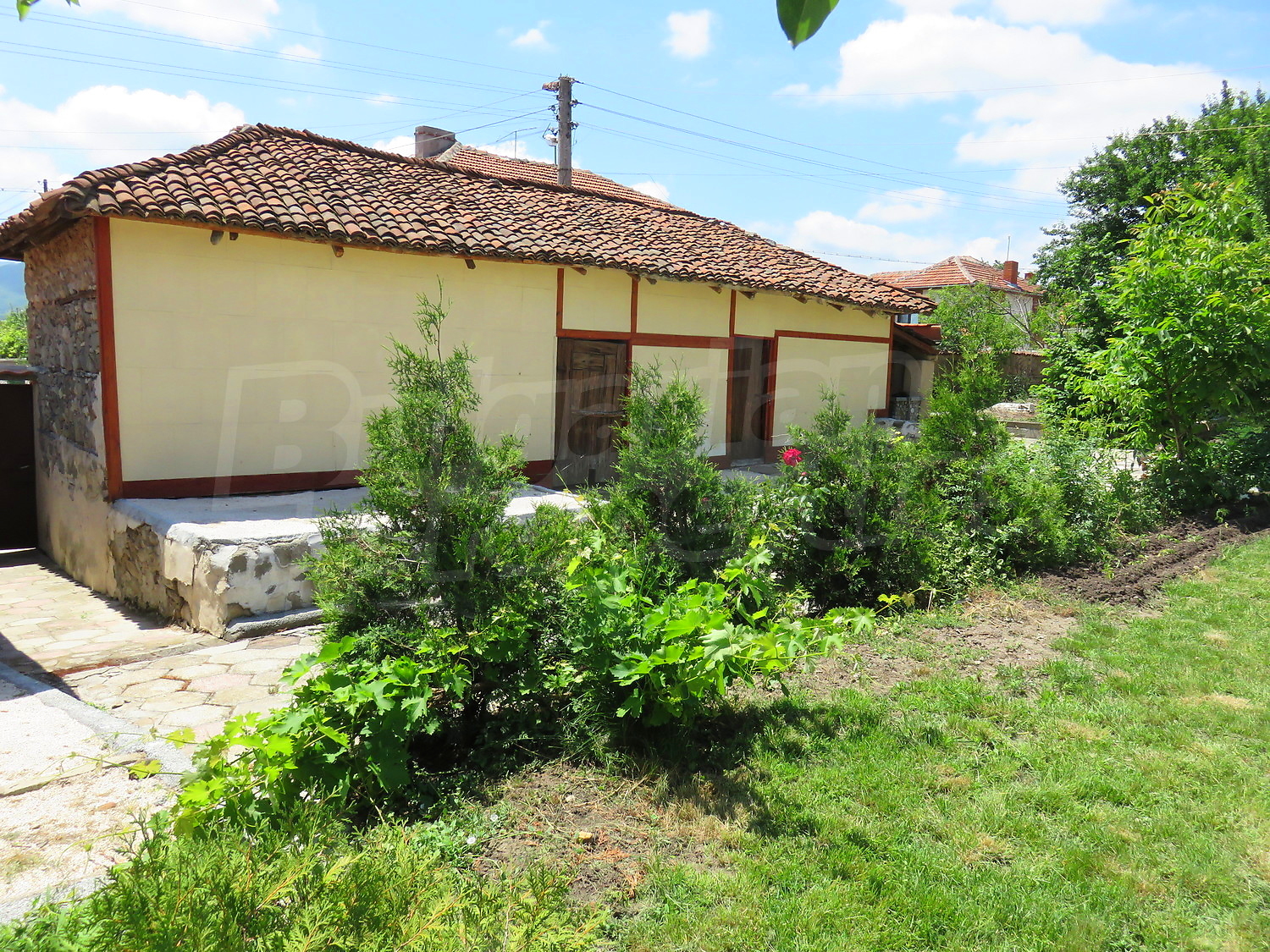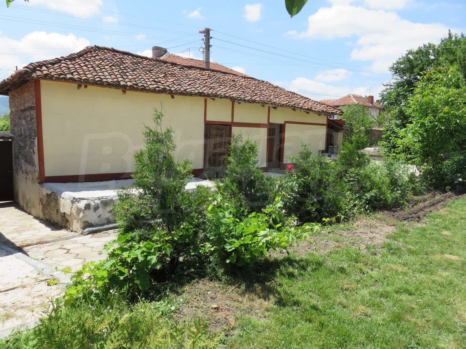 Към нея има залепена друга постройка с кухня, спалня, баня. Имотът се предлага след ремонт, със следната степен на завършеност: PVC дограма, подове с теракот и стени - тухла и камък, боядисани с латекс, с вътрешна изолация. По отношение на мебели и оборудване налични са: вградена кухня. Имотът е снабден с електричество, вода и канализация. Имотът разполага с гараж.