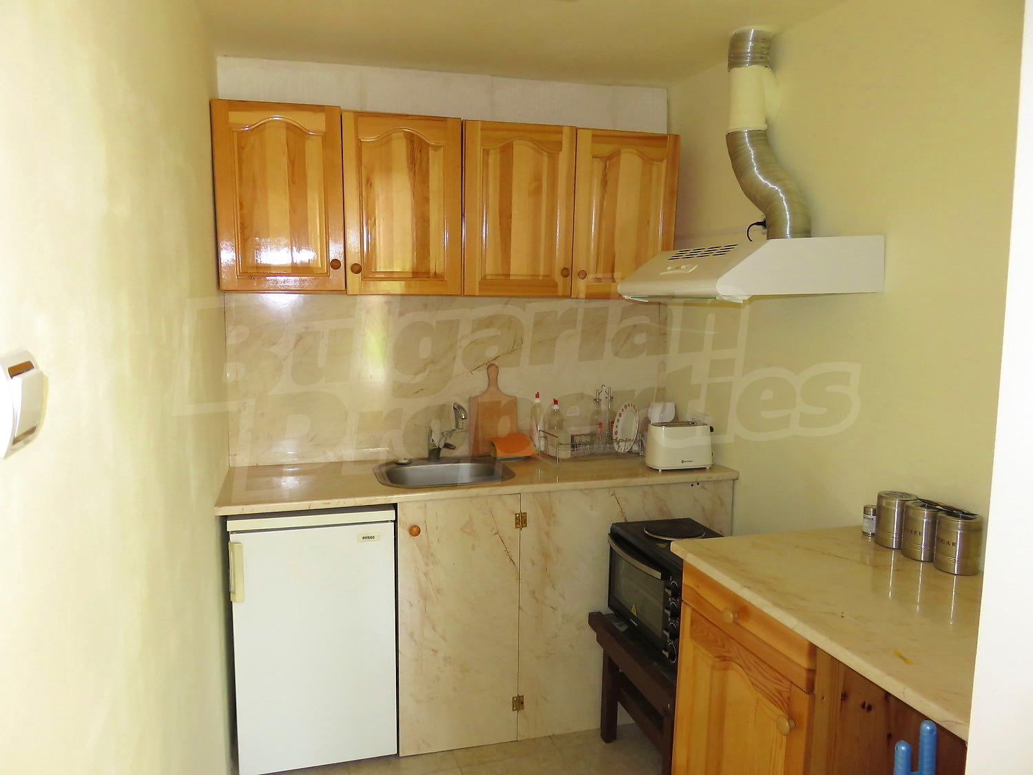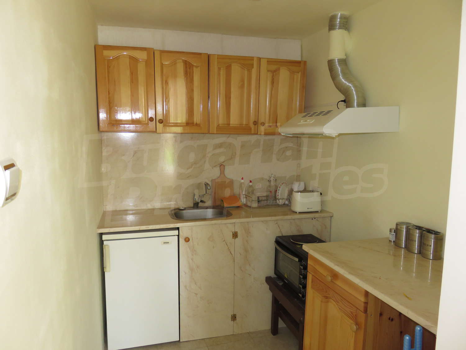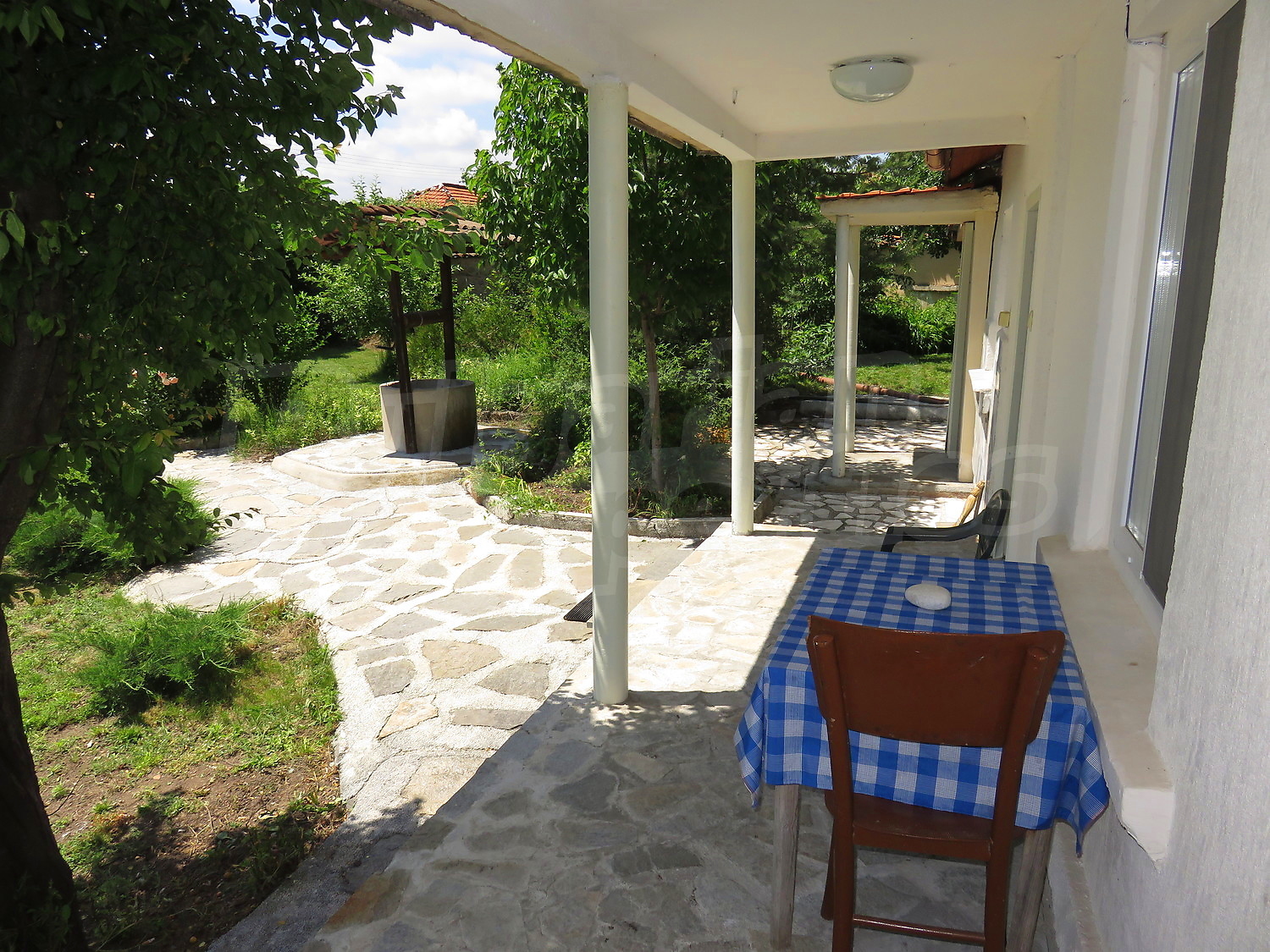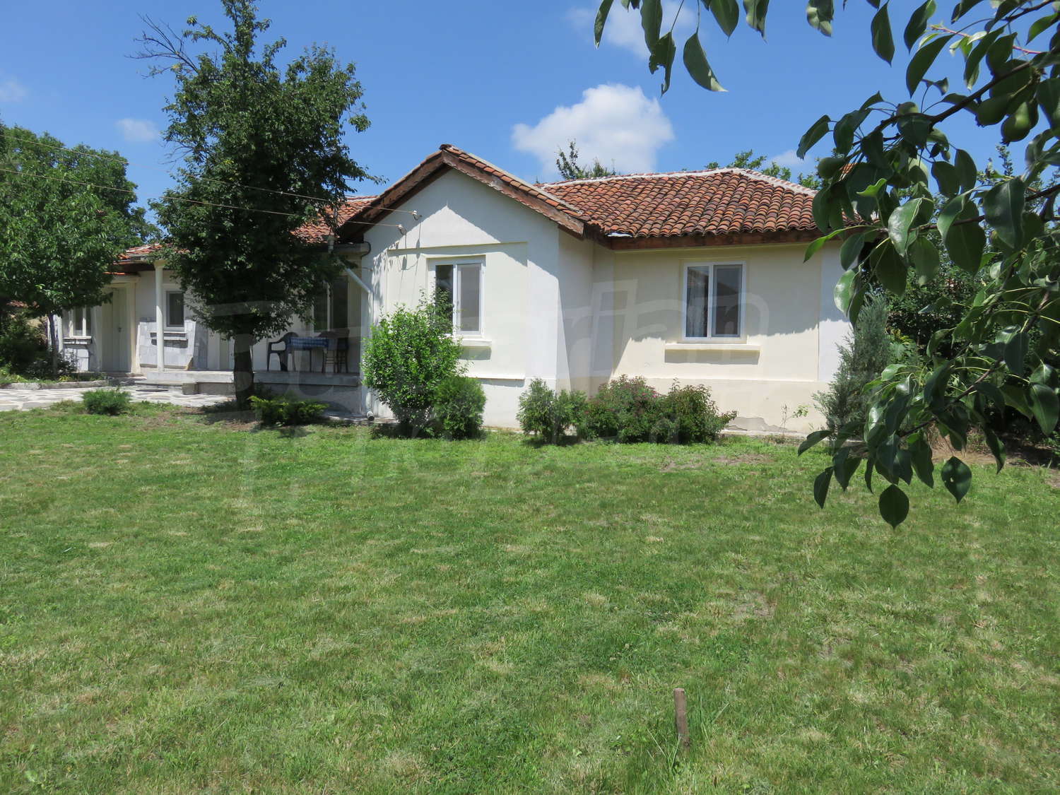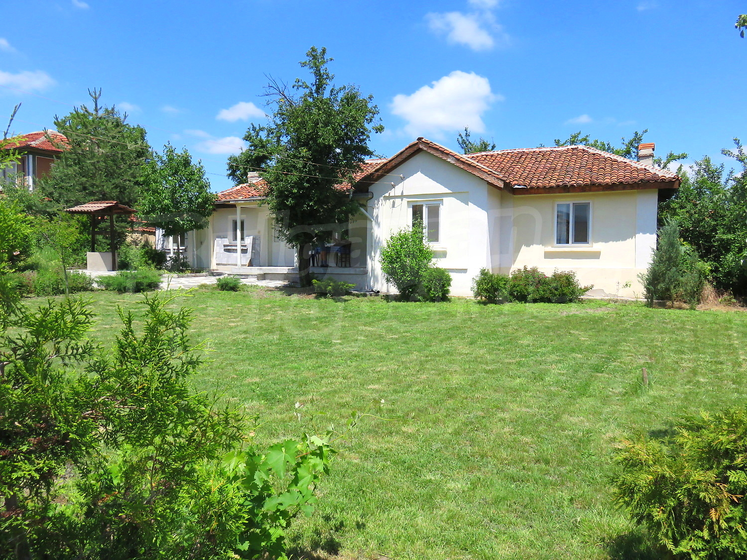Към нея има залепена друга постройка с кухня, спалня, баня. Имотът се предлага след ремонт, със следната степен на завършеност: PVC дограма, подове с теракот и стени - тухла и камък, боядисани с латекс, с вътрешна изолация. По отношение на мебели и оборудване налични са: вградена кухня. Имотът е снабден с електричество, вода и канализация. Имотът разполага с гараж.