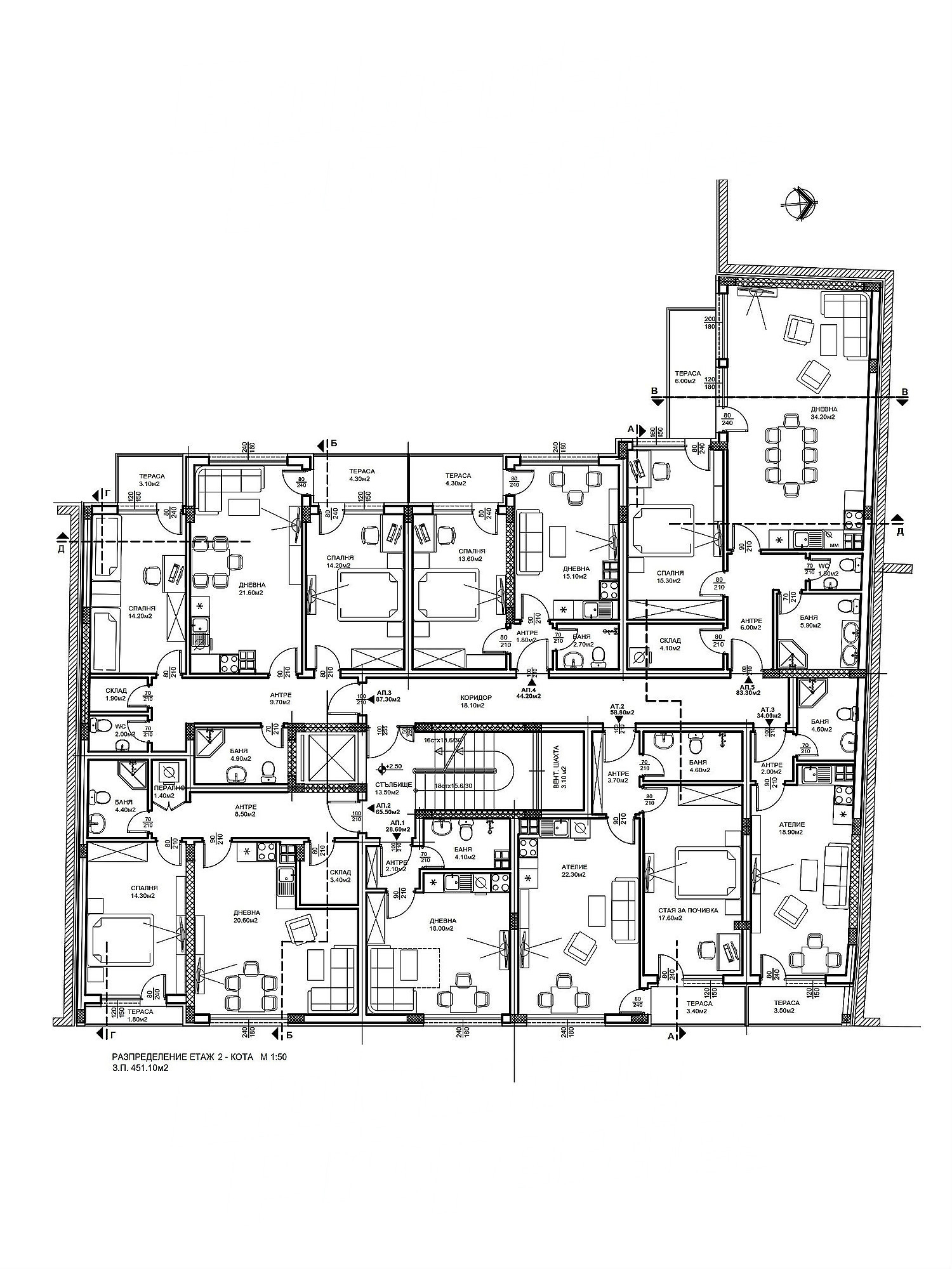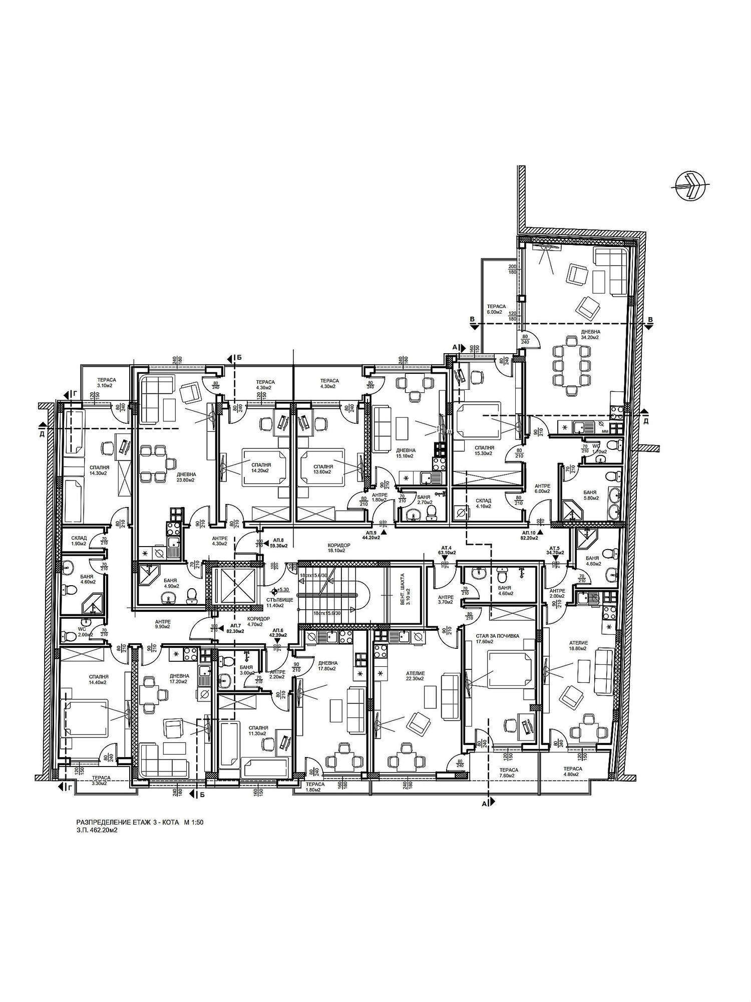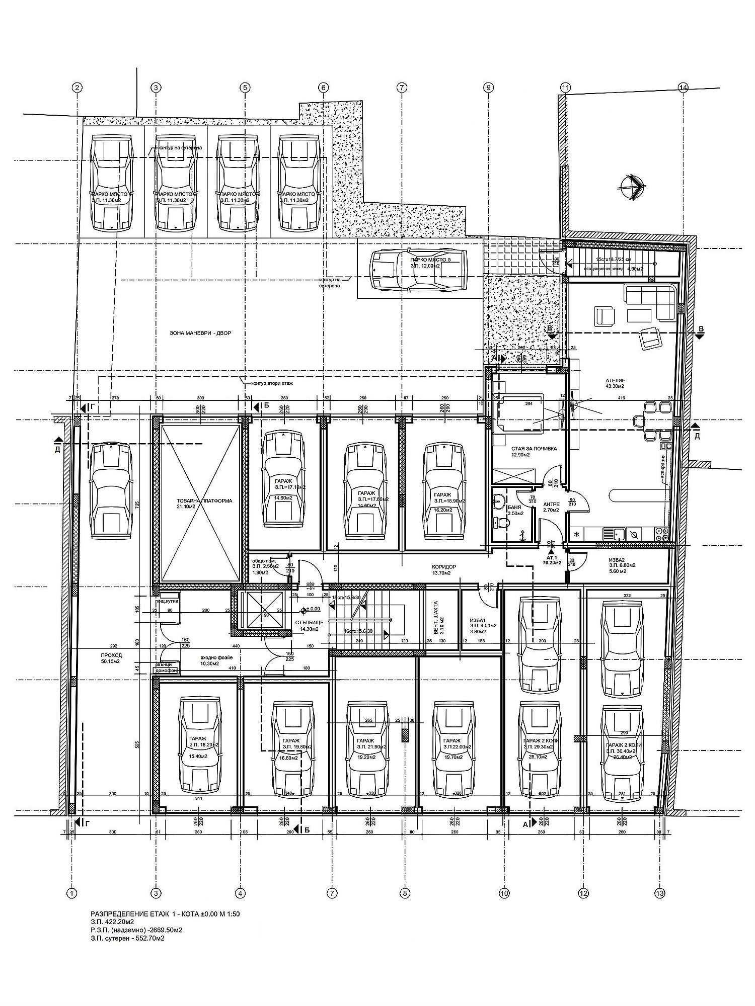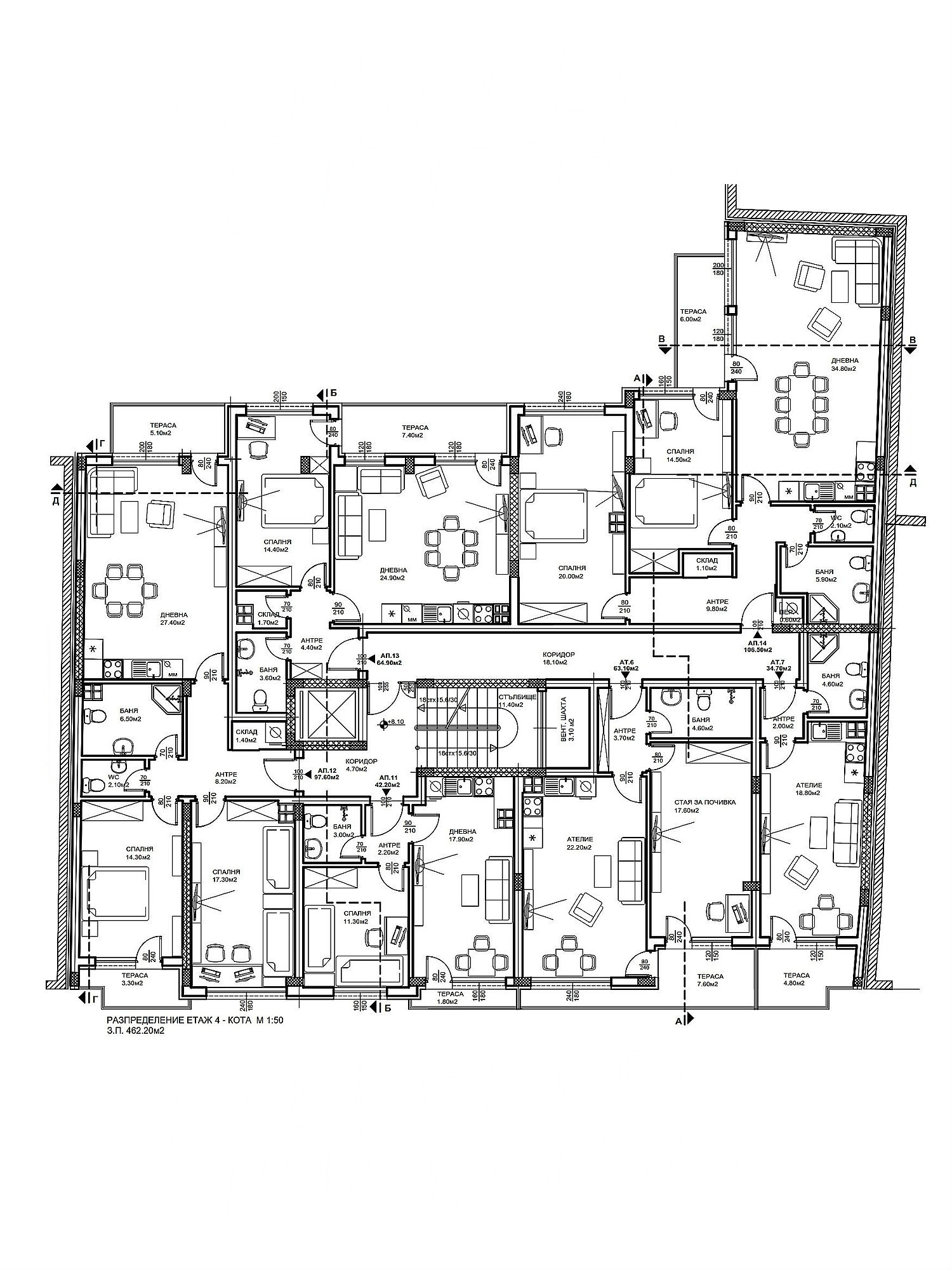 На разположение са ателиета, двустайни и тристайни жилища, 7-етажна сграда, обслужвана от тих асансьор.