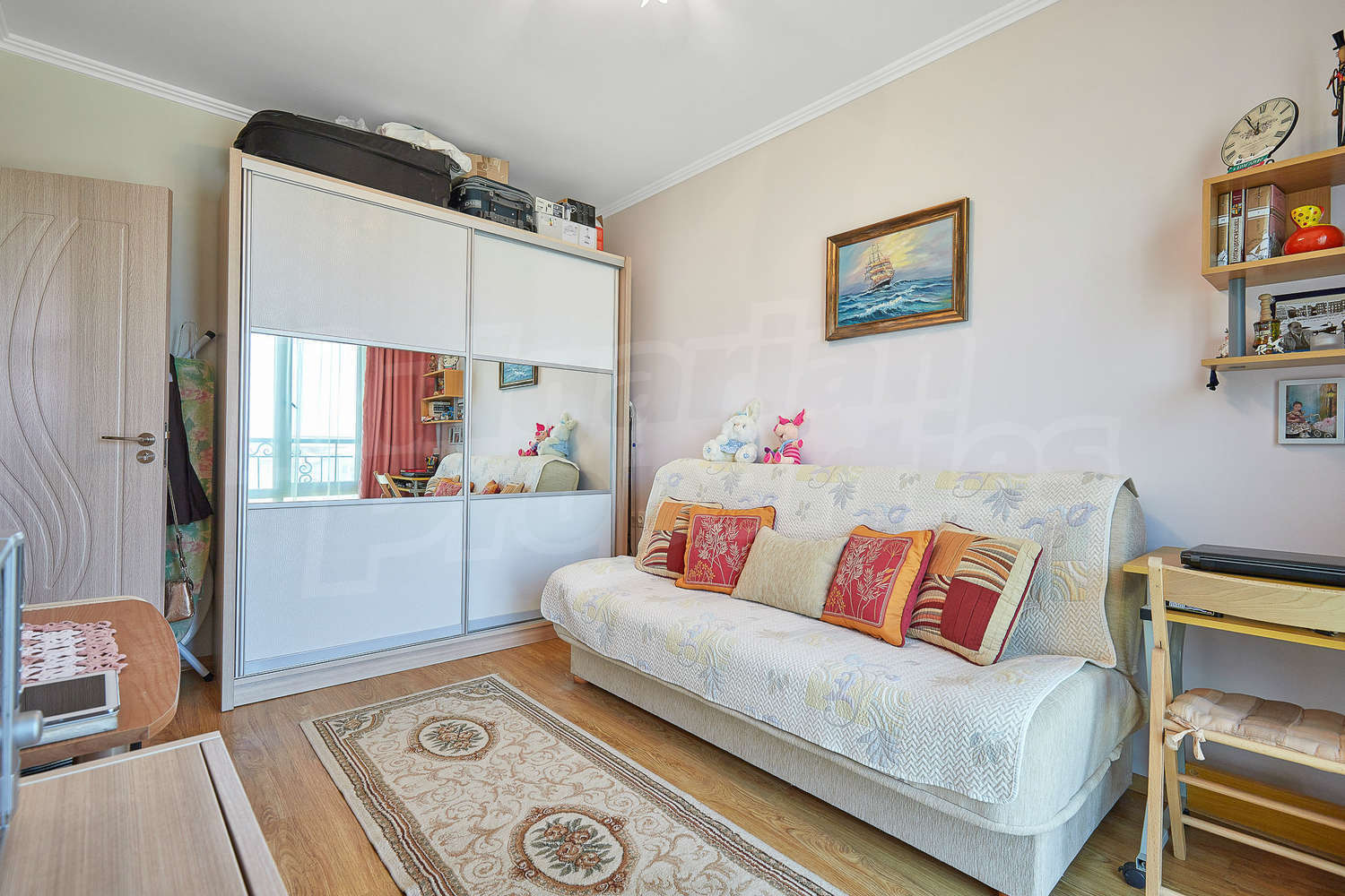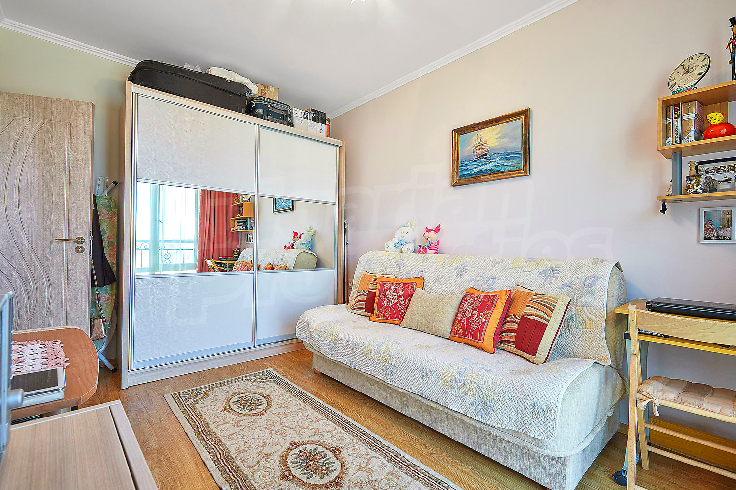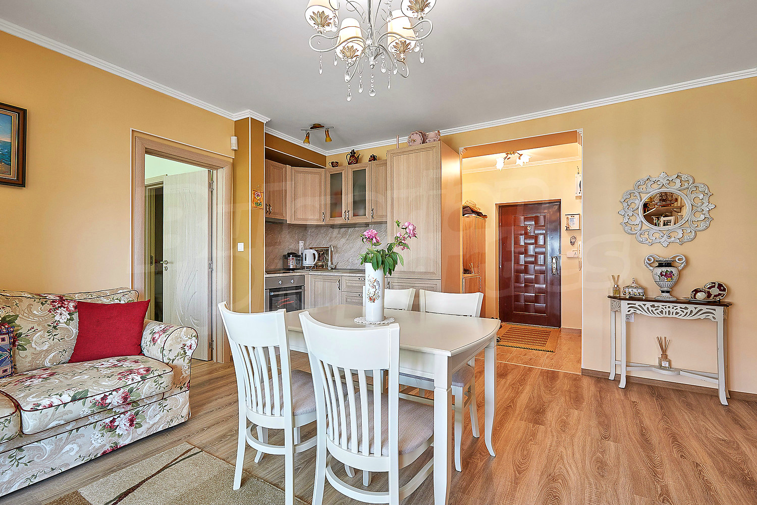 Апартаментът е разположен на 3/4 етаж с приятна гледка към околните сгради, морето и планината. Общата площ от 76.37 кв.м., чиста площ – 69.24 кв.м., се разпределя между: