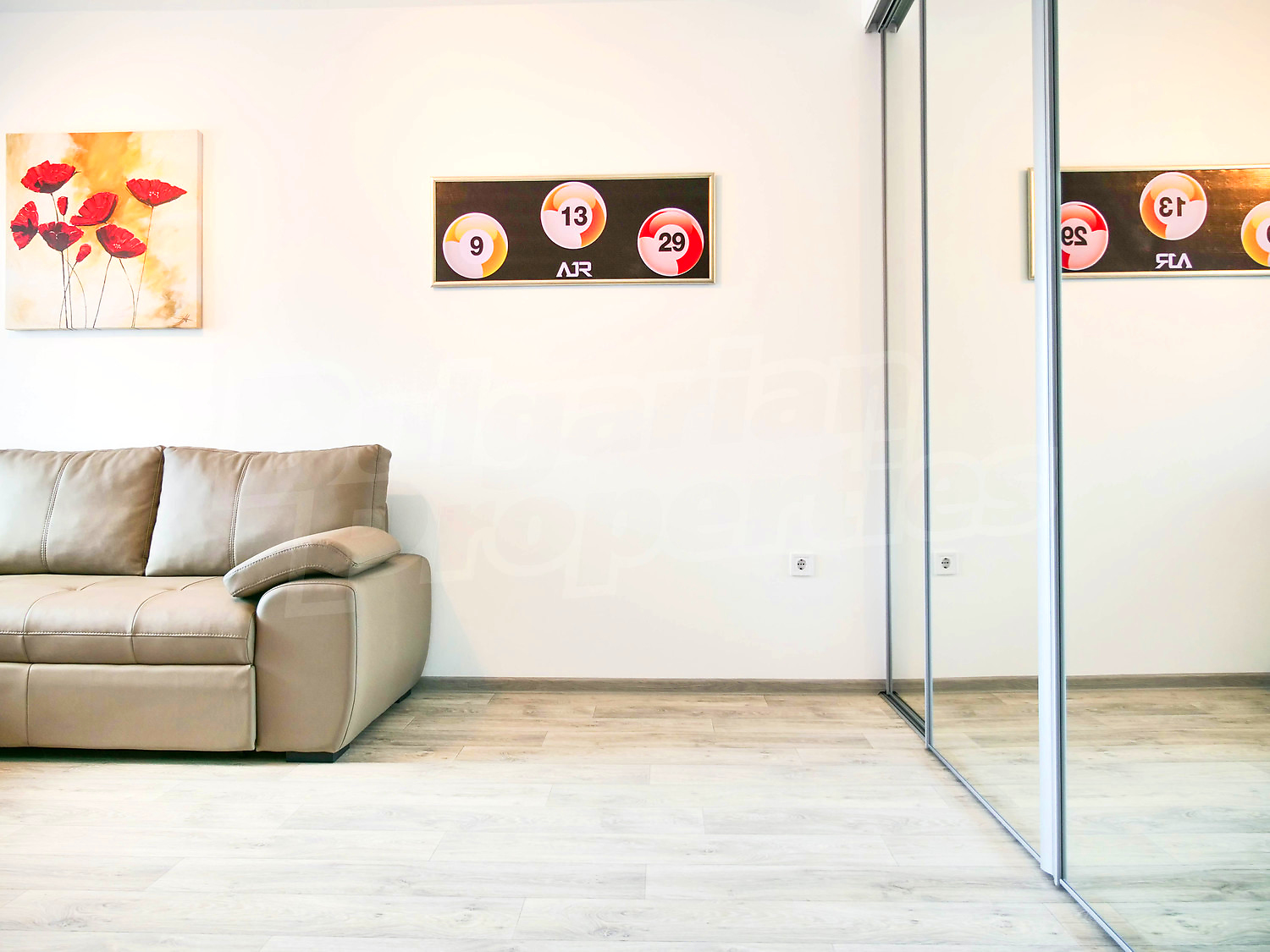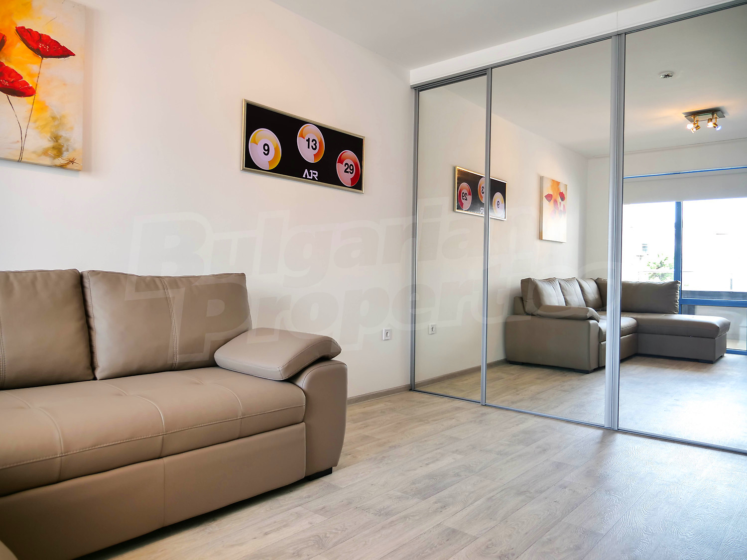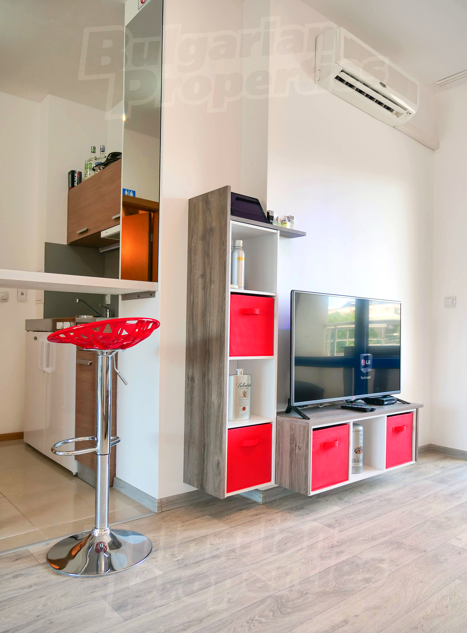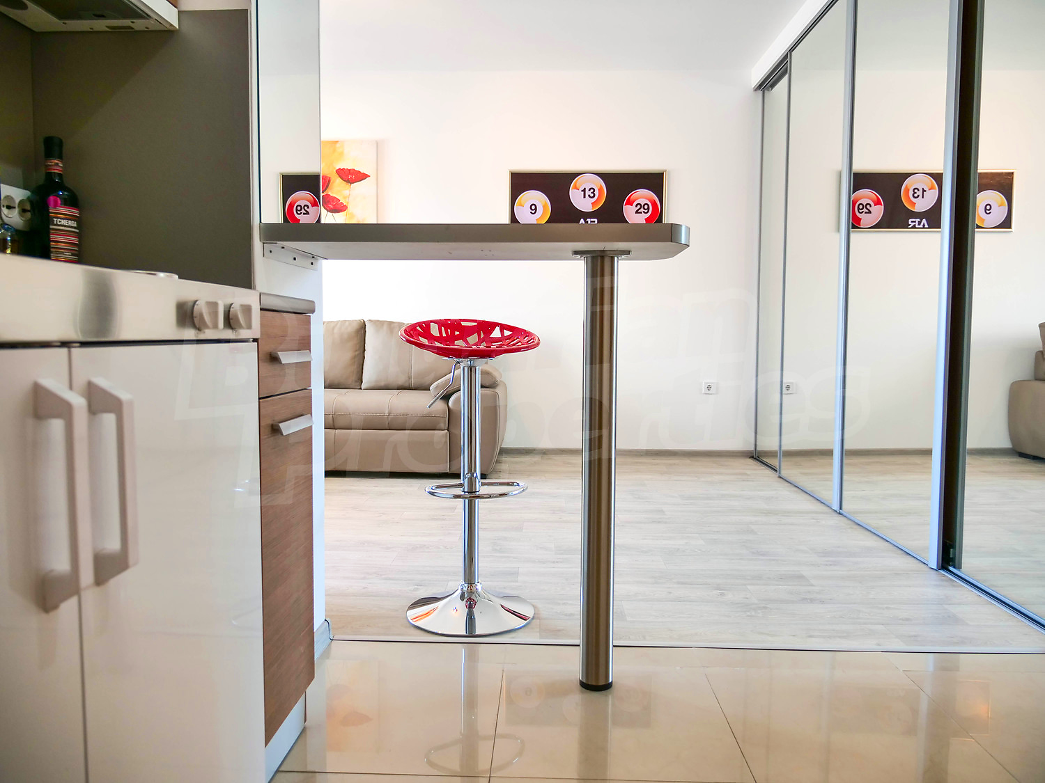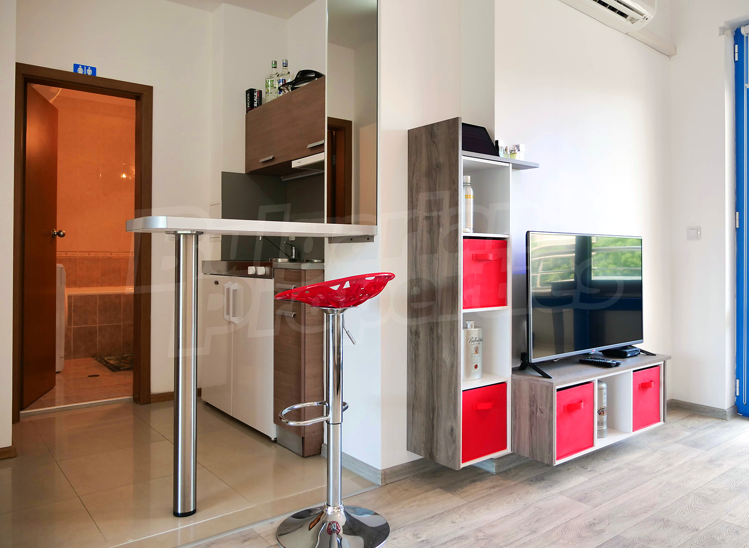 Студиото се намира на четвърти жилищен етаж, гледа към басейна и има застроена площ – 35 кв. м + 18.48 кв. м общи части, общо: 53.48 кв. м. разпределени между: