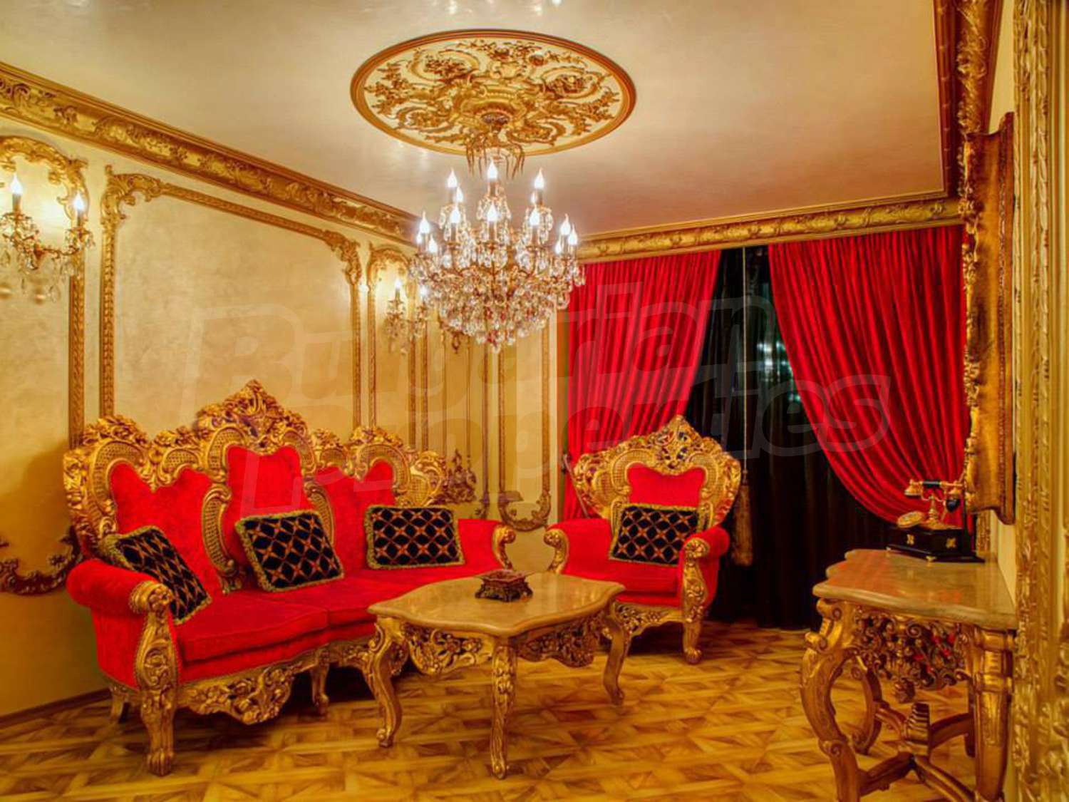 Висококачествени мебели, крановете на мивките са 'Versace', вратите са масивни, изработени от гръцки орех, навсякъде има позлатени елементи. В апартамента има вградена пералня.