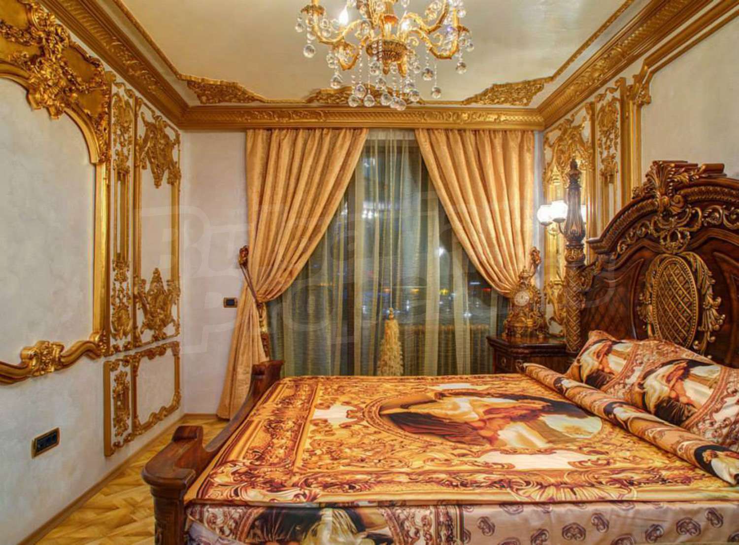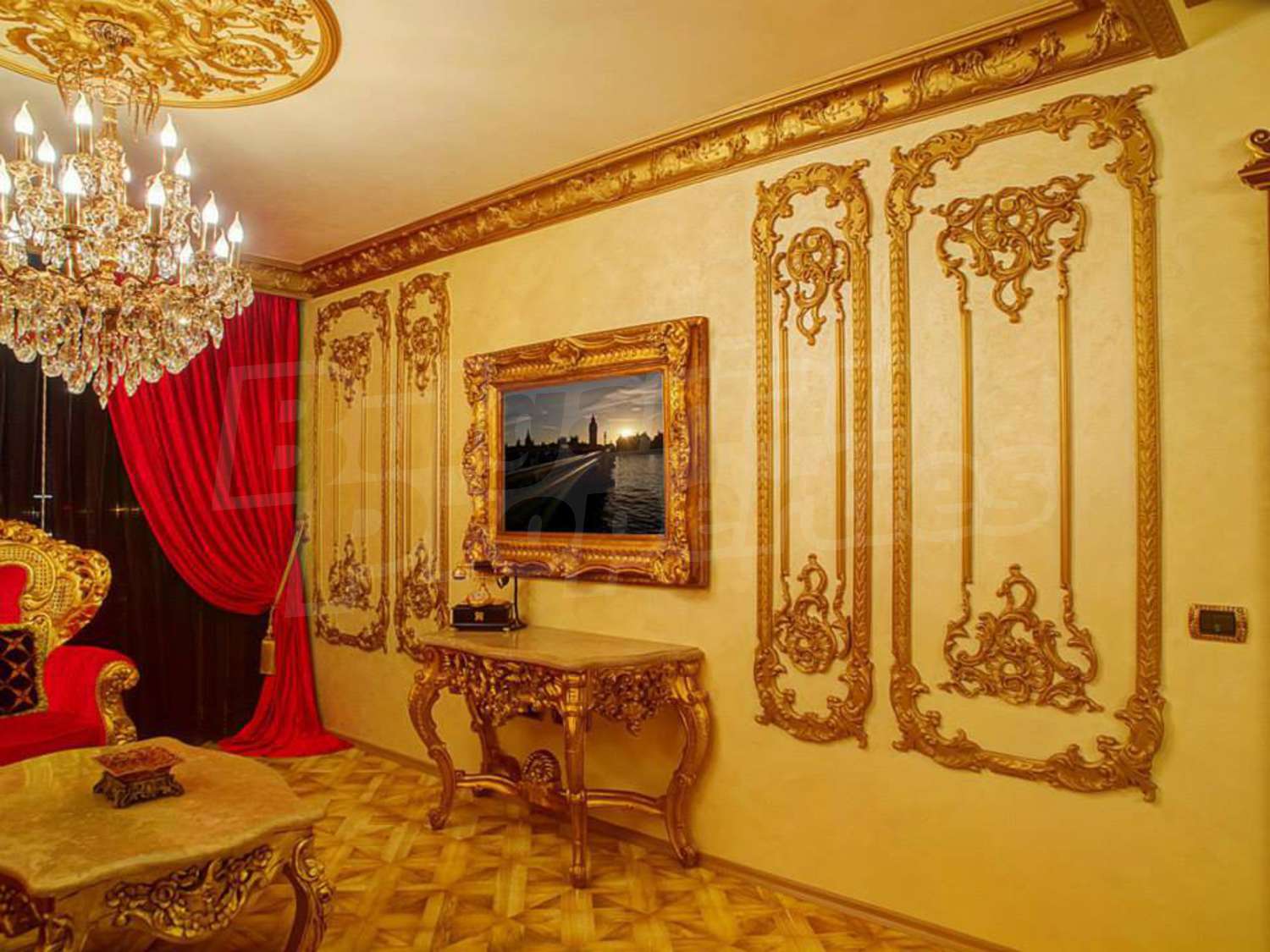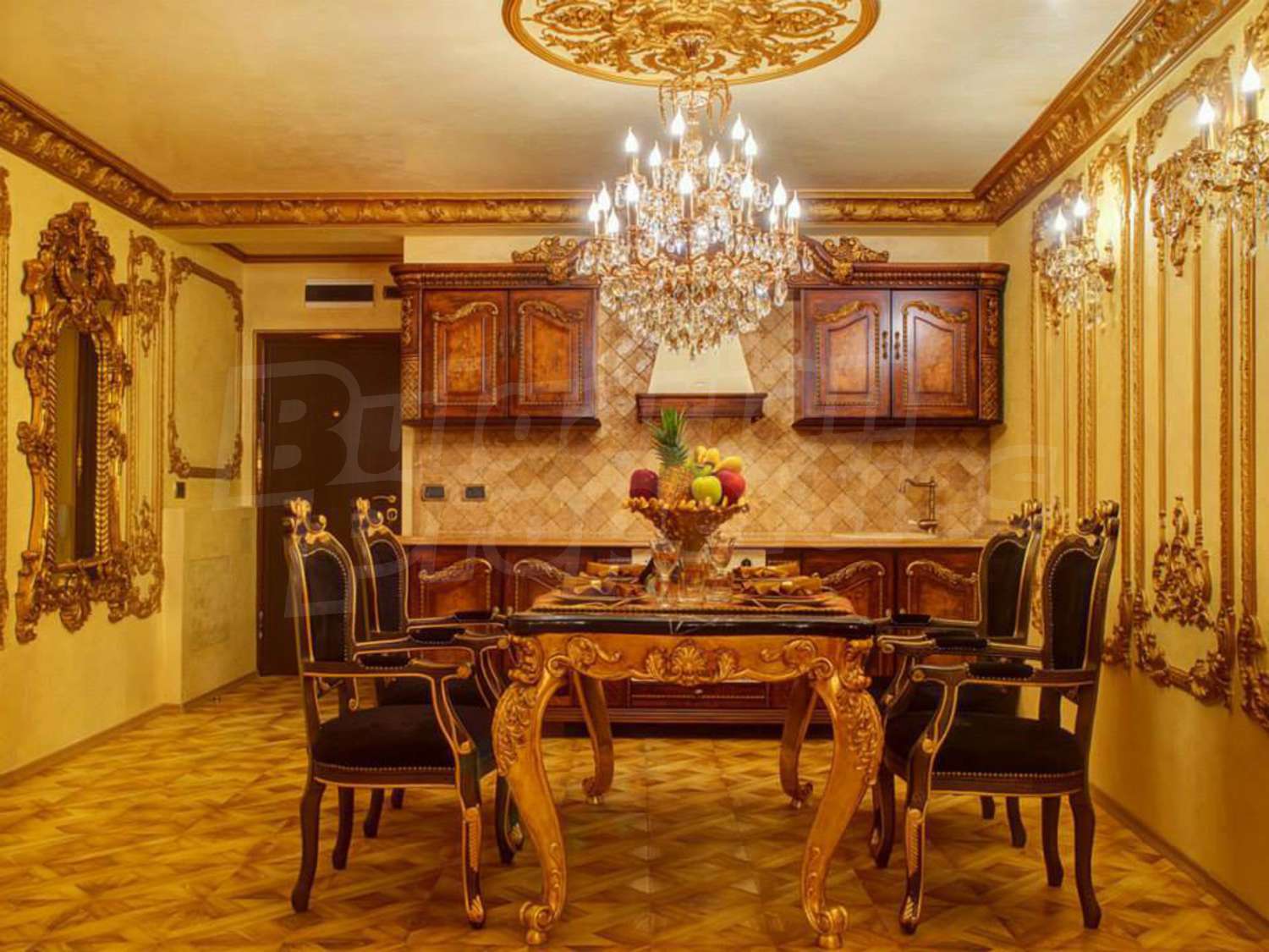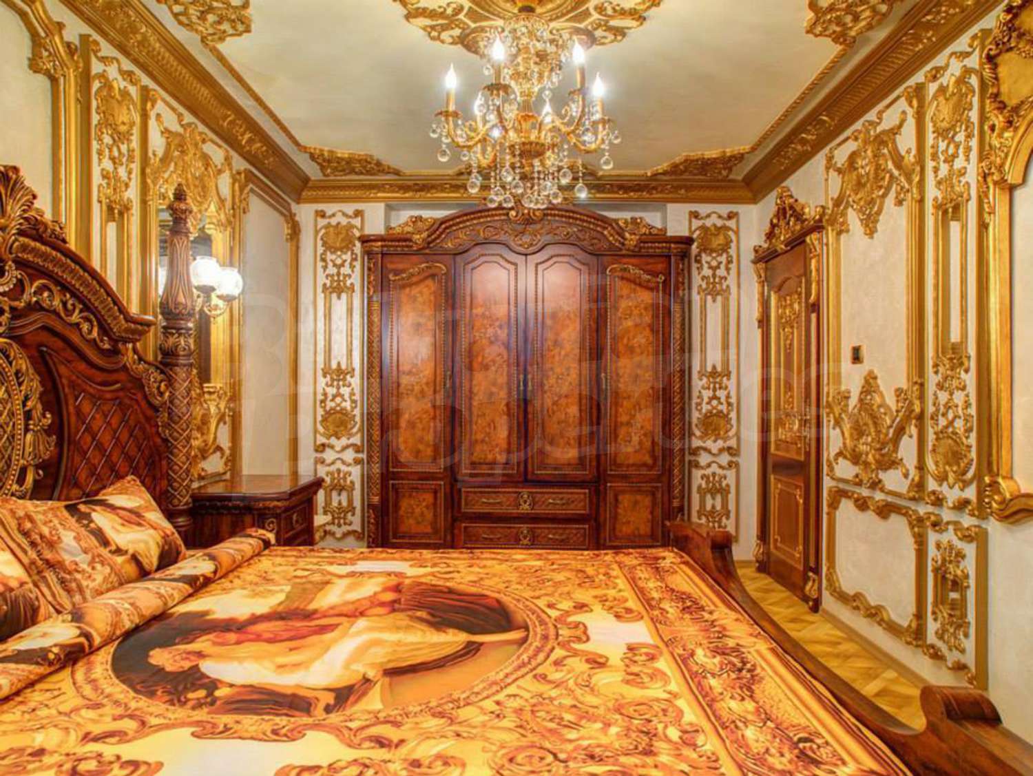 Висококачествени мебели, крановете на мивките са 'Versace', вратите са масивни, изработени от гръцки орех, навсякъде има позлатени елементи. В апартамента има вградена пералня.