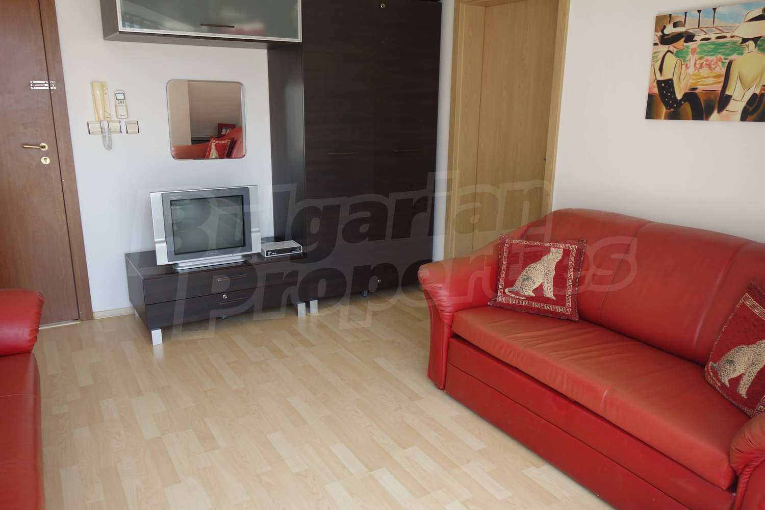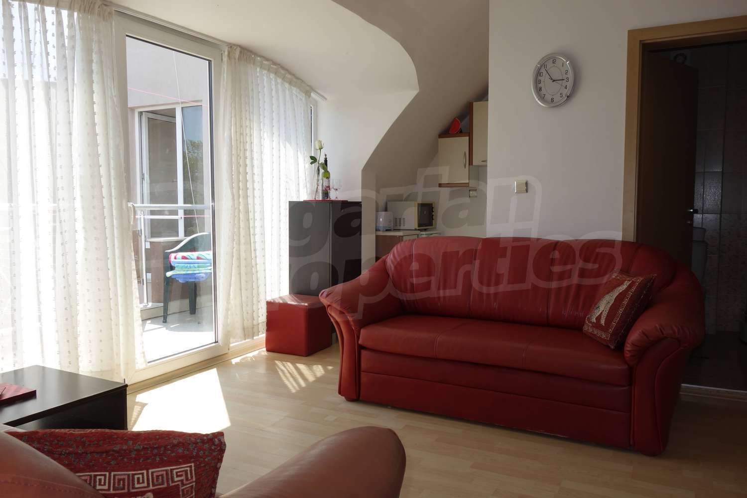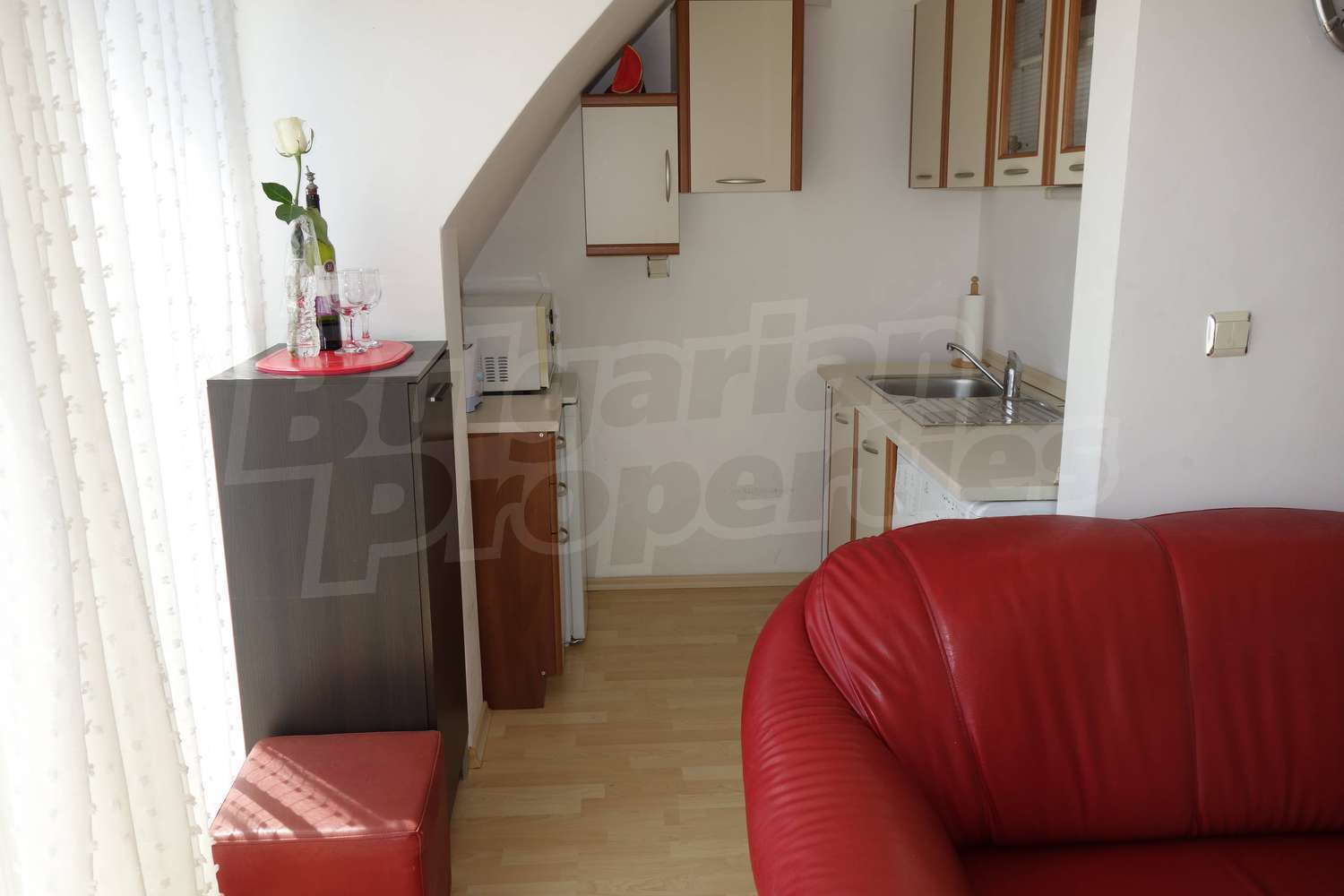Апартаментът се продава напълно обзаведен - двойно легло, шкафове в спалнята, диван и секция в хола, кухненски шкафове, хладилник, пералня. Напълно оборудвана баня с душ кабина. Таксата поддръжка на имота е в размер на 430 Евро за година !