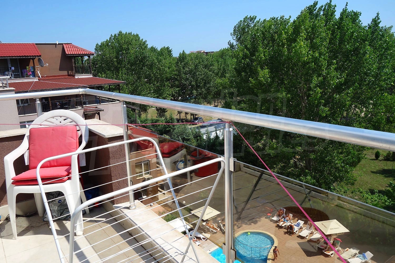 Имотът разкрива гледка към басейна на комплекса. Довършителните работи включват: