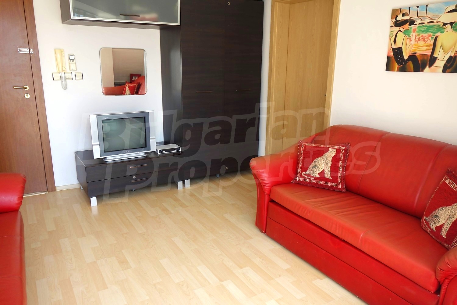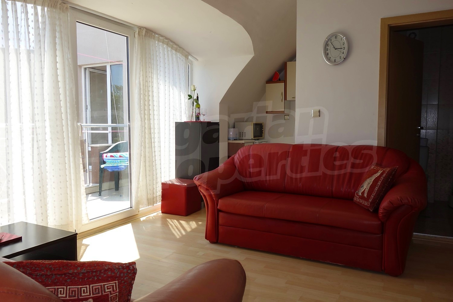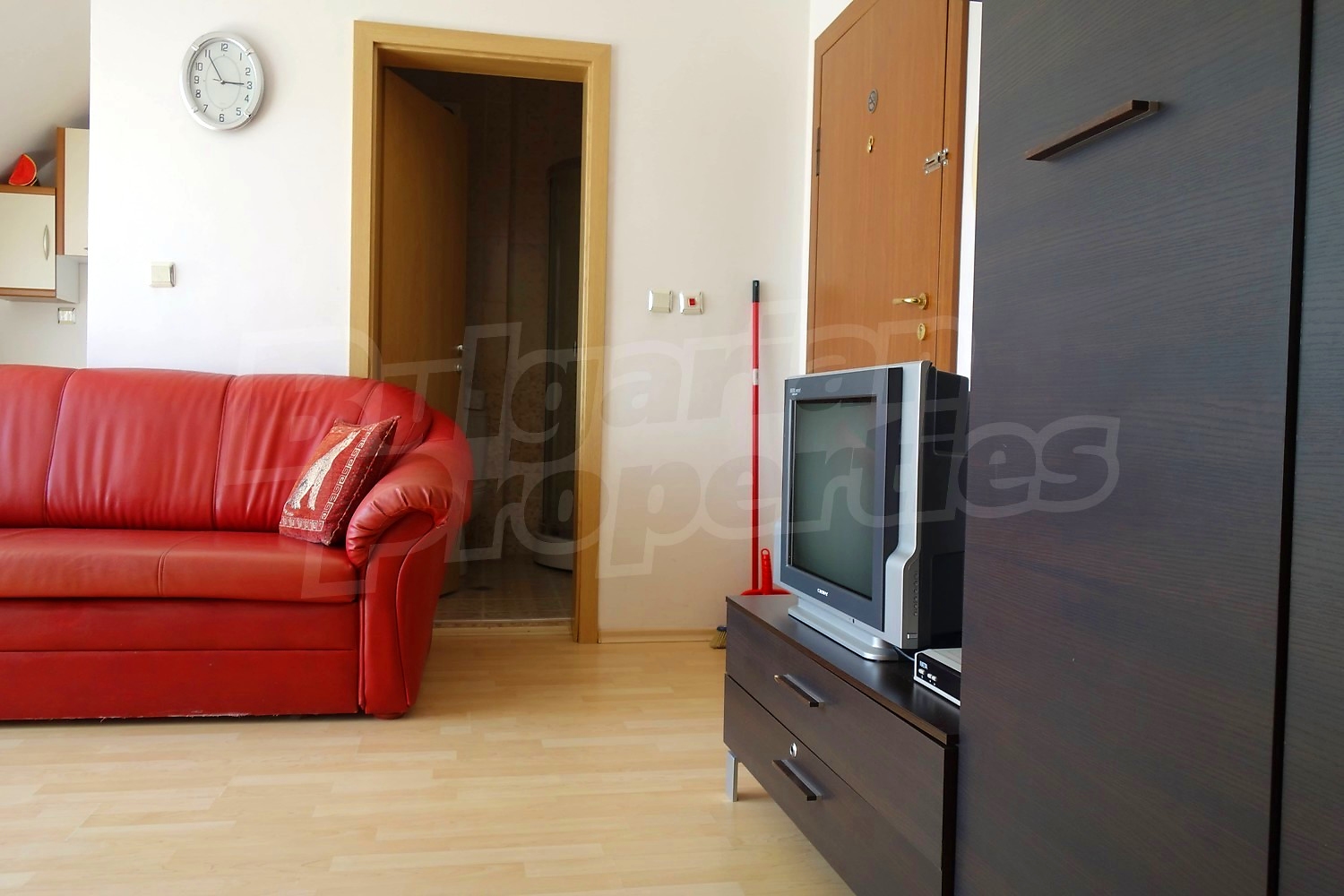 Апартаментът се продава напълно обзаведен - двойно легло, шкафове в спалнята, диван и секция в хола, кухненски шкафове, хладилник, пералня. Напълно оборудвана баня с душ кабина. Таксата поддръжка на имота е в размер на 430 Евро за година !