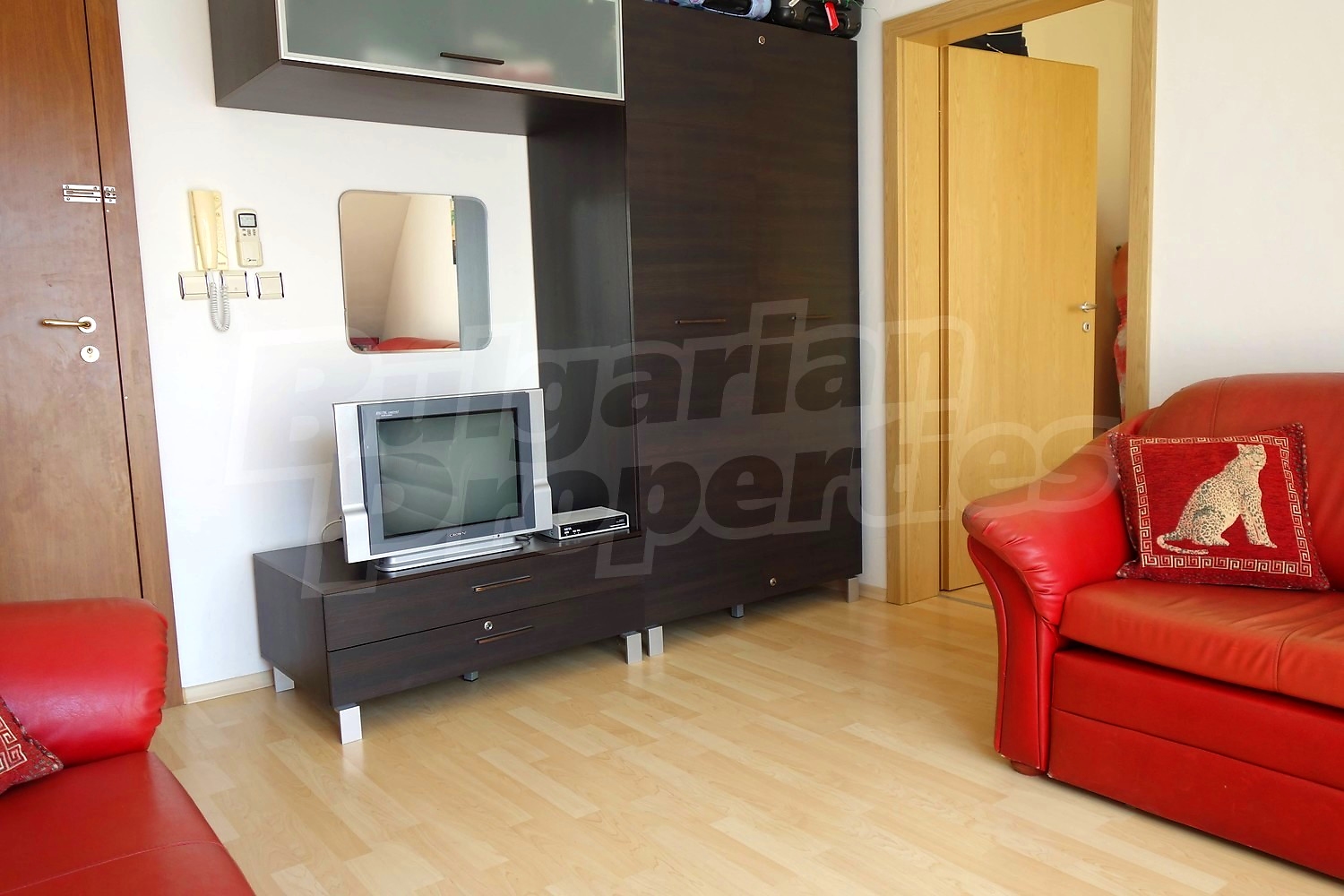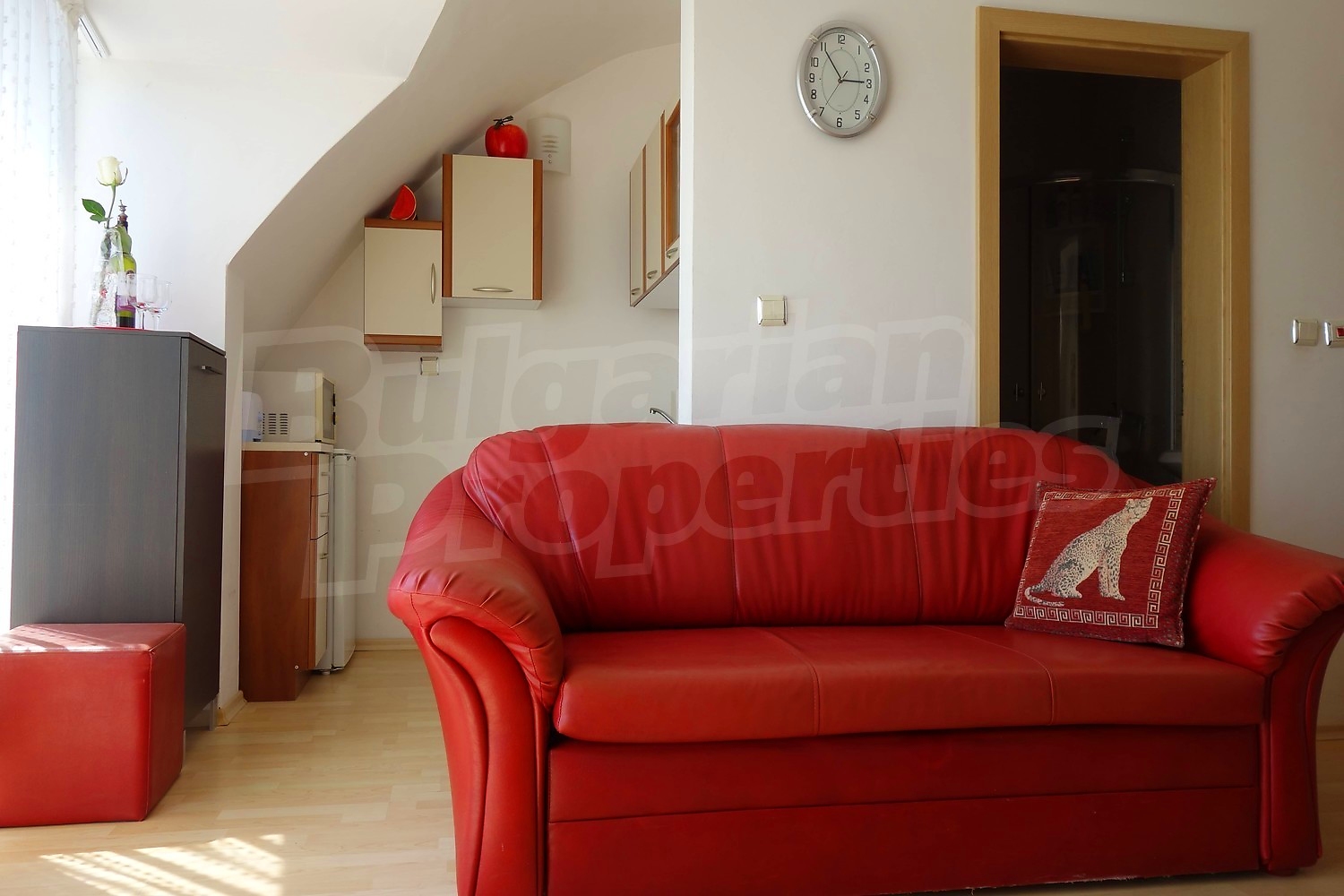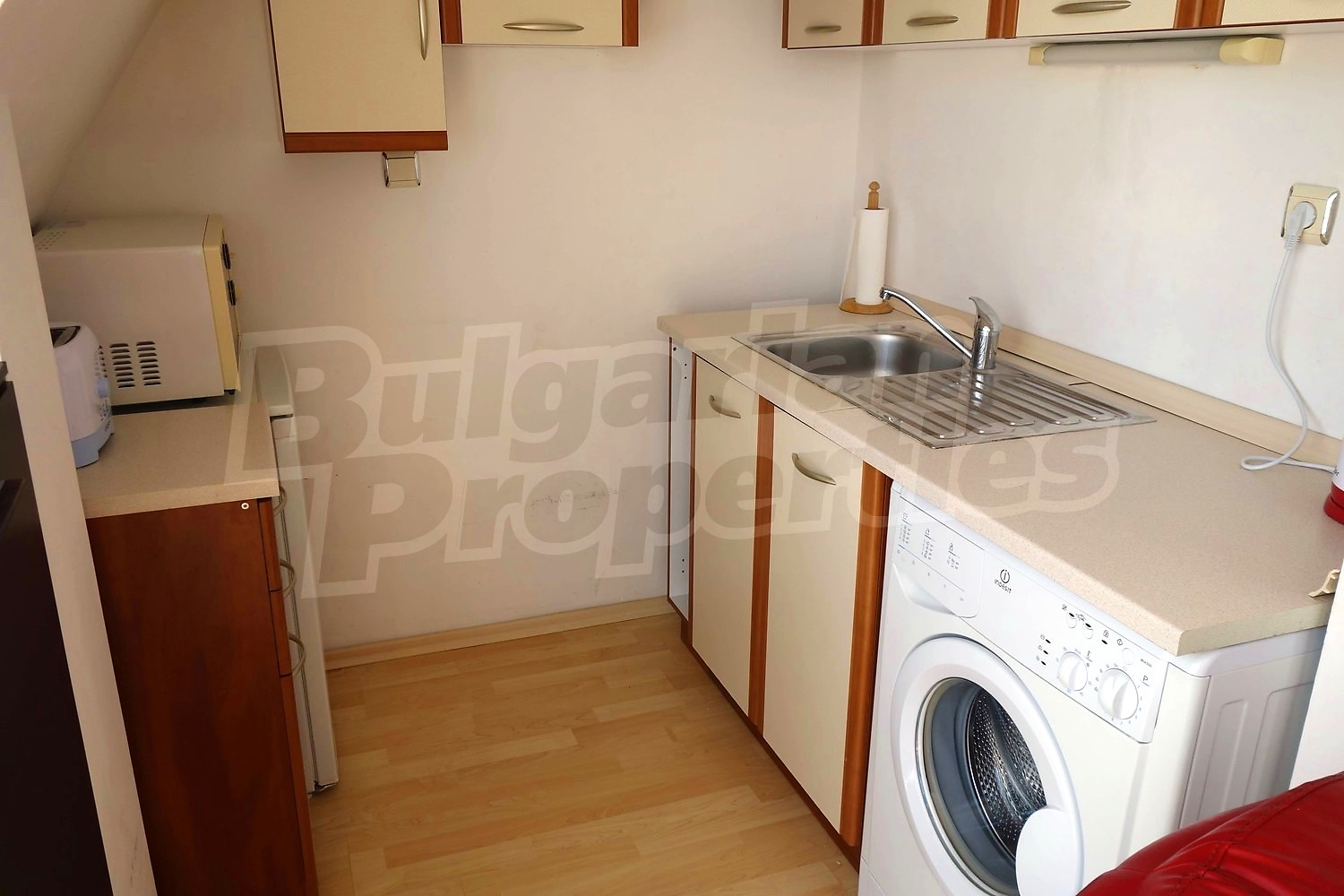 Апартаментът се продава напълно обзаведен - двойно легло, шкафове в спалнята, диван и секция в хола, кухненски шкафове, хладилник, пералня. Напълно оборудвана баня с душ кабина. Таксата поддръжка на имота е в размер на 430 Евро за година !