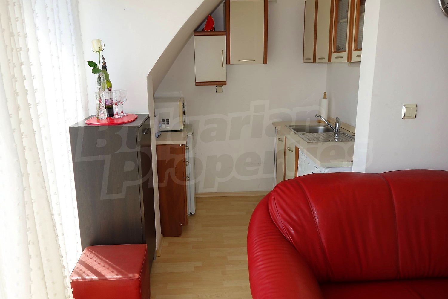 Апартаментът се продава напълно обзаведен - двойно легло, шкафове в спалнята, диван и секция в хола, кухненски шкафове, хладилник, пералня. Напълно оборудвана баня с душ кабина. Таксата поддръжка на имота е в размер на 430 Евро за година !