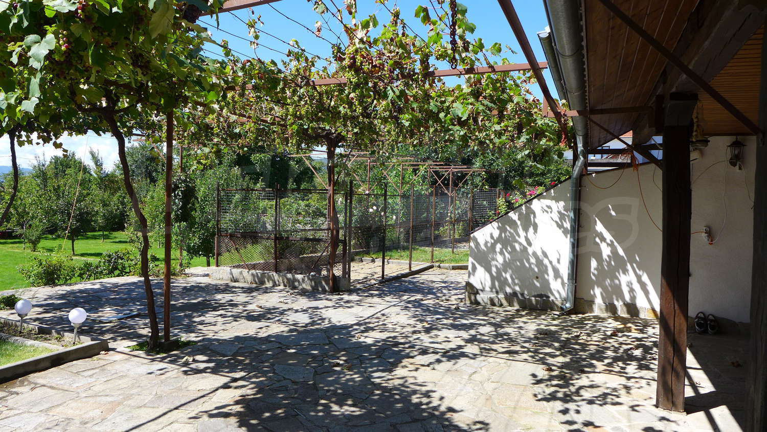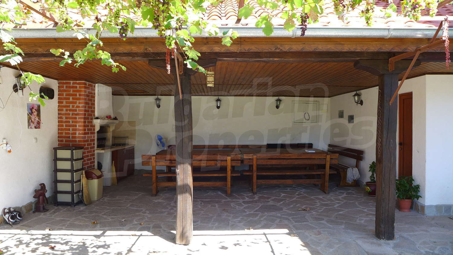 В имота има обособен летен кът за барбекю с площ 47,07 кв. м и навес за коли 39,47 кв. м.