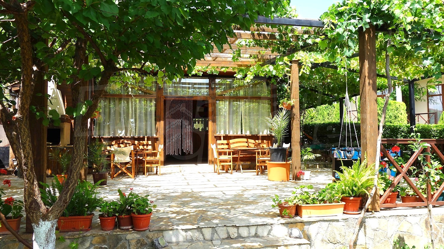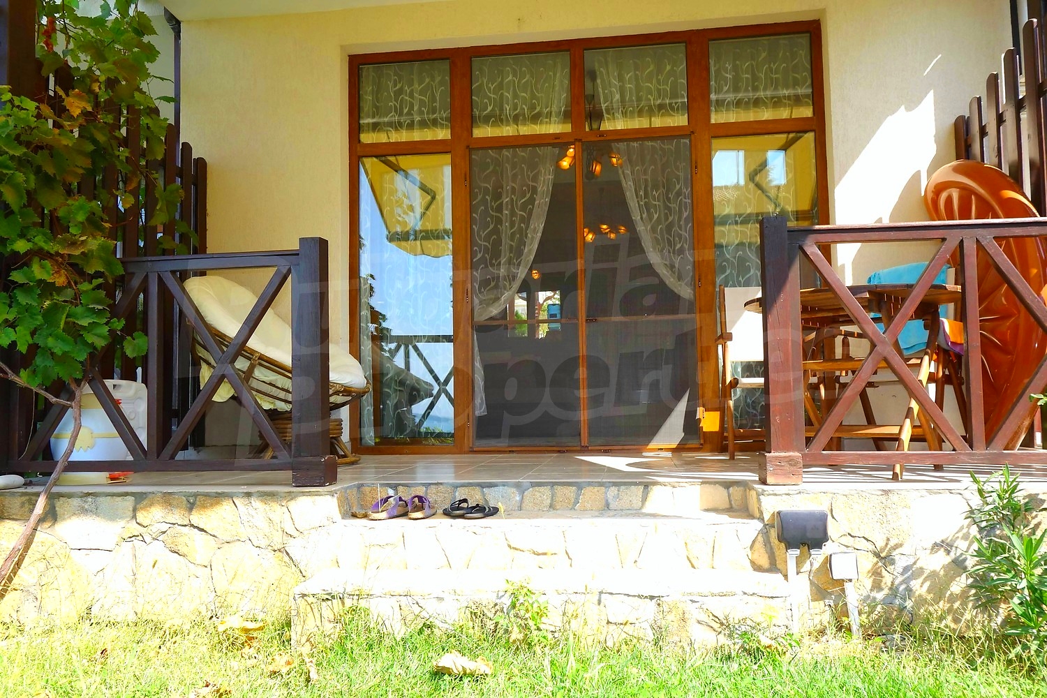 • Първи етаж - кухня, дневна с камина, тоалетна, склад, веранда с подвижна тента