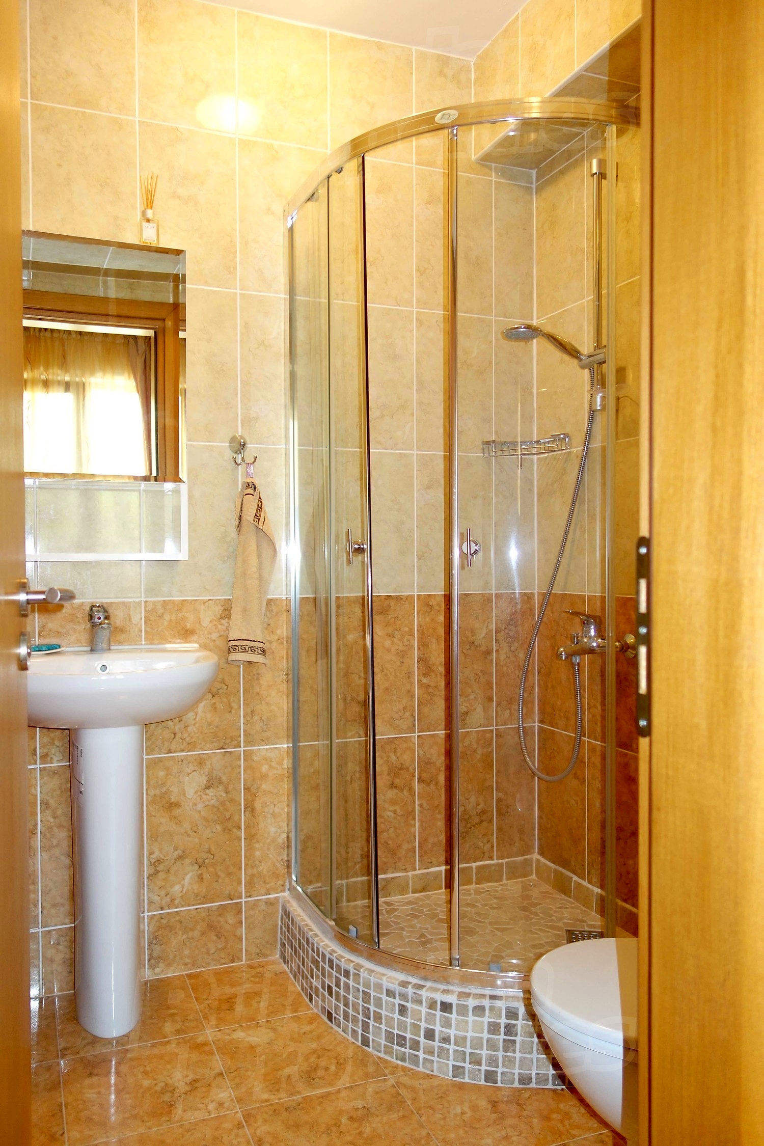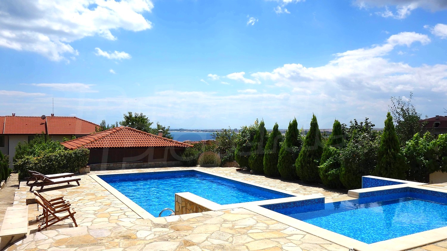 • Втори етаж - две спални, всяка с собствена баня с тоалетна. Едната от спалните разполага с голям балкон от който се открива красива панорамна гледка към Несебърския залив