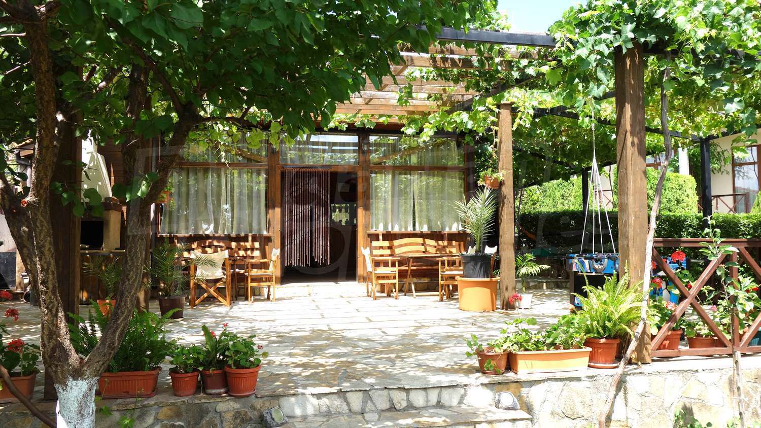 • Първи етаж - кухня, дневна с камина, тоалетна, склад, веранда с подвижна тента